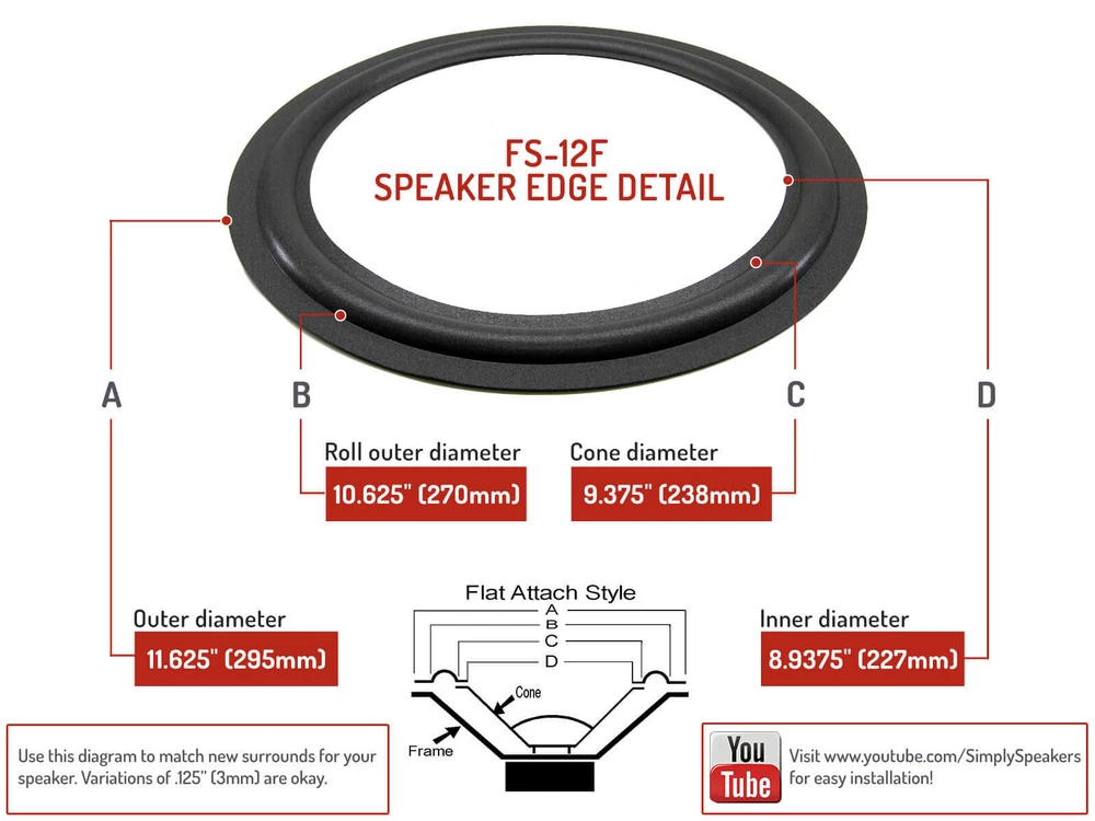 Home About Us Store Policy Contact us Repair Videos FAQs New-Edge-It Foam Kits by Brand New-Edge-It Foam Kits by Size Diaphragms Speaker Reconing Kits Speaker Grills & Grill Cloth Passive Radiators Repair Kits For Bose 901 & 802 Speaker Accessories Pro Grade Adhesives Rubber Edge Kits Speaker Dust Caps Speaker Gaskets Send Speakers To Us For Repair Spiders & Misc. Parts Tweeters Midranges Woofers Specials Ferrofluid Kits Factory Parts Leadwire Repair Kits Fuses and Bulbs New-Edge-It Speaker Repair Kit Store Newsletter Add Simply Speakers to your Favorites to receive our email newsletters about new items and special promotions Sign Up FISHER SPEAKER Parts 12" Woofer Foam Edge Replacement Repair Kit # FSK-12F Item Description The most common problem with speakers are rotted, torn or damaged surrounds. The surround is the outer suspension part of the cone. Constant vibration, time and the environment cause foam and rubber surrounds to degrade. Cloth and paper surrounds can become brittle. This causes distortion and poor performance. Luckily, our easy to install repair kits will make your old speakers sound just like new! New-Edge-It® speaker repair kits. America's # 1 brand since 1992. See Product Description, Title or the "Fits Models" tab to see speakers listed for this repair kit. Repair kit includes: 2 x made in USA foam surrounds: Outer diameter: 11.625" (295mm), Roll outer diameter: 10.625" (270mm), Cone diameter: 9.375" (238mm), Inner diameter: 8.9375" (227mm) Flat attach Exact dimensions can also be viewed in the photo gallery 1 x MI-3035 rubber based repair adhesive 1 x applicator brush Easy to follow color illustrated instructions FREE technical support and online videos Product Overview: Brand new formula made in USA surrounds last much longer than the originals. We ship the same high quality parts used in the pro audio repair market. We do NOT use generic glues or low quality imported surrounds like others sell. Our exclusive clear drying rubber based repair adhesive is designed for paper, poly, and composite cones. Dries flexible, strong and clear. Kits can be installed without removing the dust caps. Dust caps, shims and gaskets are available for most models if needed. Access to our complete library of how-to speaker repair videos. Fast and FREE shipping to any USA address and worldwide shipping. Economical and environmentally friendly. Save money AND save your speakers. Simply Speakers® - Quality Speaker Parts since 1992! Shipping Info Shipping Info Terms & Conditions About Us Testimonials FAQ Shipping Info We ship all orders within 24 hours of receipt of payment. Most orders ship same day. Weekends & holidays excluded. The address provided by eBay or PayPal will be used for shipment. We are not responsible for wrong or un-deliverable addresses. BE SURE YOU HAVE CORRECT ADDRESS ON FILE! We cannot change the address once your order has been processed through eBay. Please note: Saturday, Sunday and all major holidays do NOT count as shipping days. We ship worldwide (with the exception of a few countries listed on our eBay excluded list) Import taxes, duties, fees, or other charges are NOT included in the item price or shipping charges and are the sole responsibility of the buyer. We will not mark down invoices or claim items as "gifts" or otherwise assist in deceptive international shipping practices. SS Audio speaker foam edge repair kits, diaphragms and other qualified items shown in our listings ship to the USA for free. Free shipping method will be US Mail First Class or Priority service depending on weight and zone. Some items may not quality for free shipping. Shipping charges will appear for those items. Simply Speakers, SS Audio and the US Mail do not guarantee shipping transit times unless special arrangements are made and paid for prior to shipment. If you need overnight or other expedited service please contact us prior to placing your order or choose those options when you checkout. Terms & Conditions Terms & Conditions Please take special care to order carefully and completely. We have thousands of speaker repair parts in stock and not all models are listed for every part we sell. In some cases, you will need to verify the correct parts by removing the defective component from your system first and prior to ordering to determine which model you have. You may need to measure a part of your speaker to determine if the replacement part is compatible. We can help you in determining which parts you need. Please contact us. See our FAQ page for other frequently asked questions. We may ask you to email a photo of your speaker to us for verification. Ask all questions before placing an order. When buying one of our products please note that the item is sold only for the described purpose. We will replace, or exchange only those products which are deemed to be incomplete or defective by a company representative. We gladly accept the return of products that are defective due to defects in manufacturing and/or workmanship for 30 days from the date of purchase. Items that have been mis-ordered or are no longer wanted may be returned for refund or exchange within 30 days from the date of purchase at customer expense. Please note: FREE SHIPPING ITEMS may have our shipping cost deducted from any refunds due to orders made in error, or that are no longer wanted. Returned items must be in new saleable condition with all packaging and contents. Units showing signs of use, ie. solder or screw marks or scratches cannot be returned. A restocking fee may apply. In most cases, no RMA is required, simply include a copy of the sales receipt with your return along with a brief description of the issue. Special order items are NOT returnable. Speakers and parts showing signs of mis-use, overpowering, underpowering (distorted), malfunctioning amplifiers, or improper crossovers will not be covered under warranty. Speakers or parts with burnt voice coils, blistered voice coils, torn cones, sp