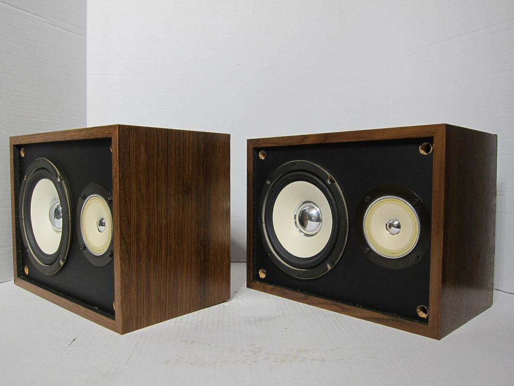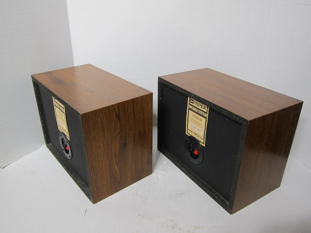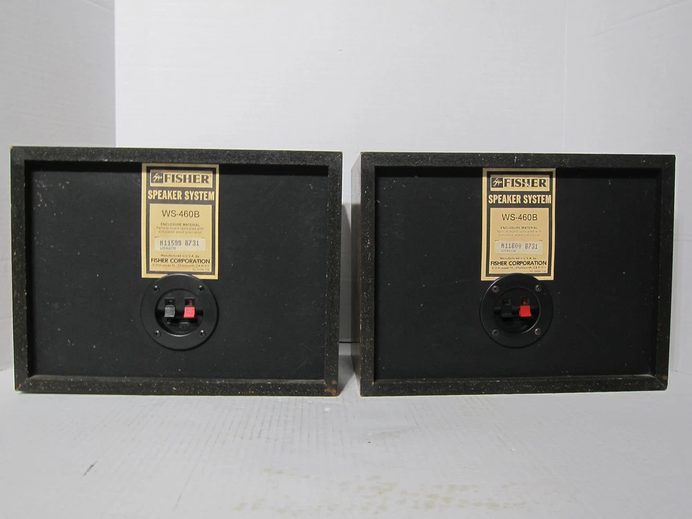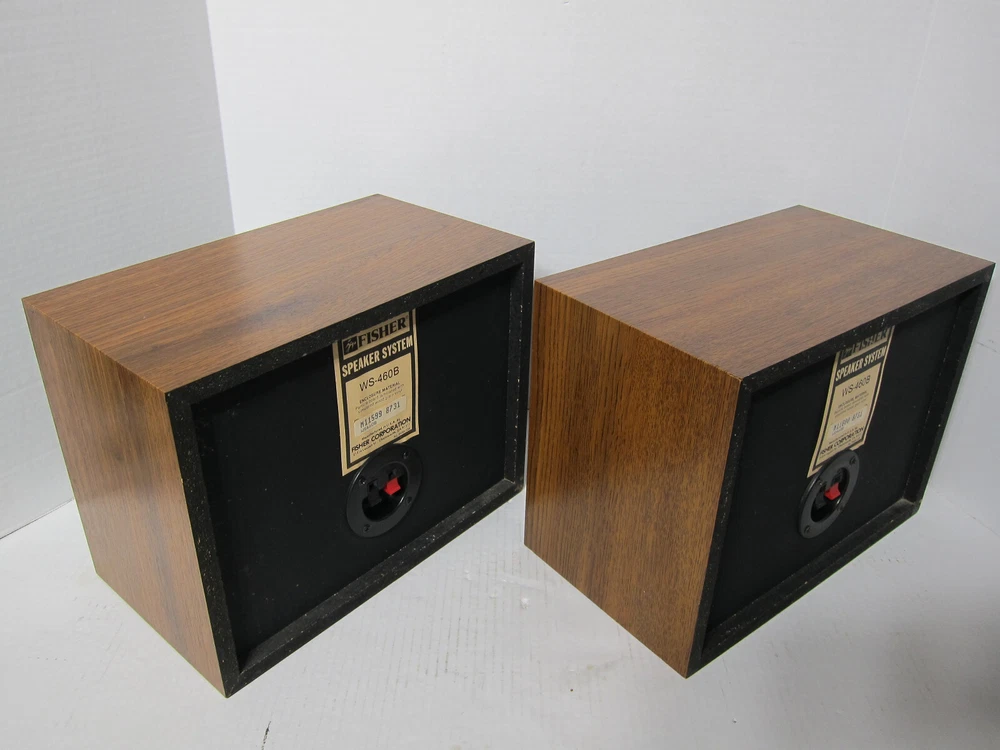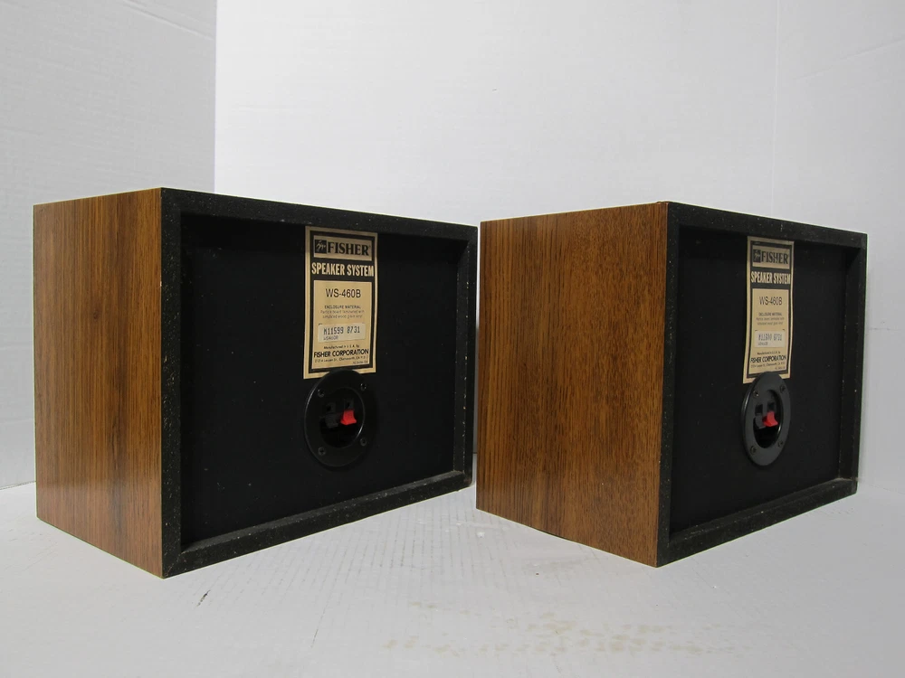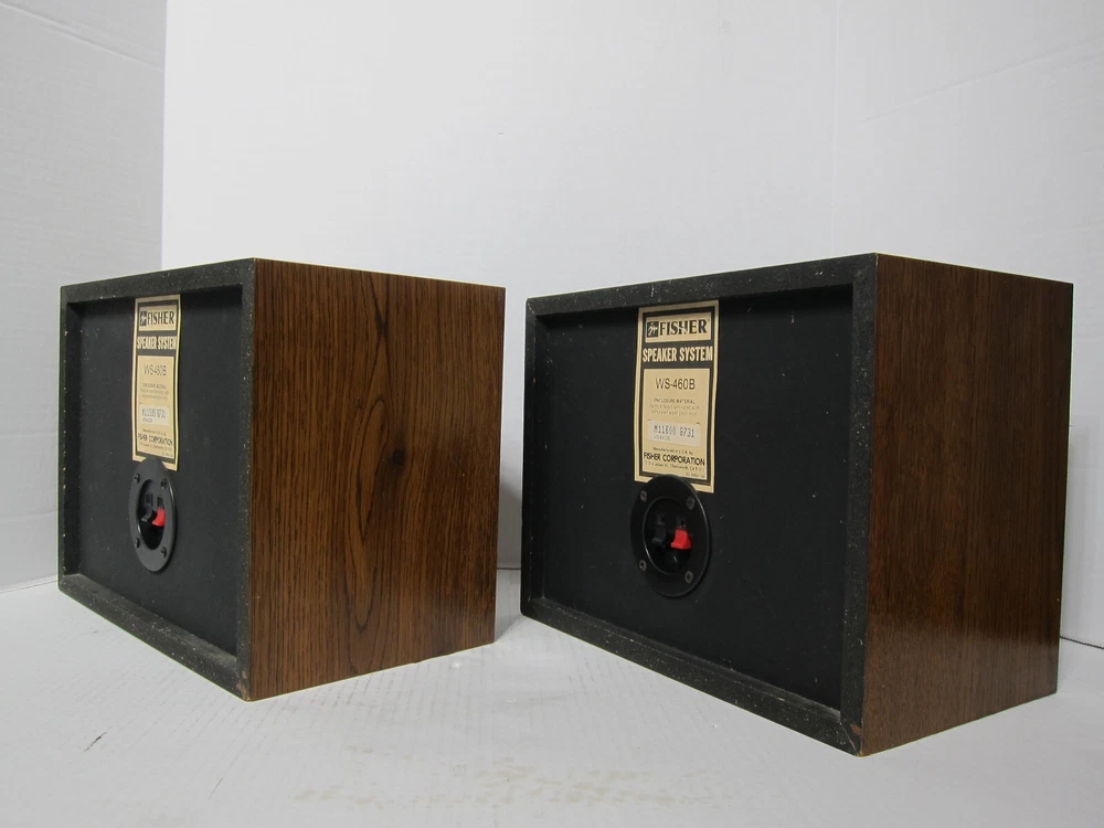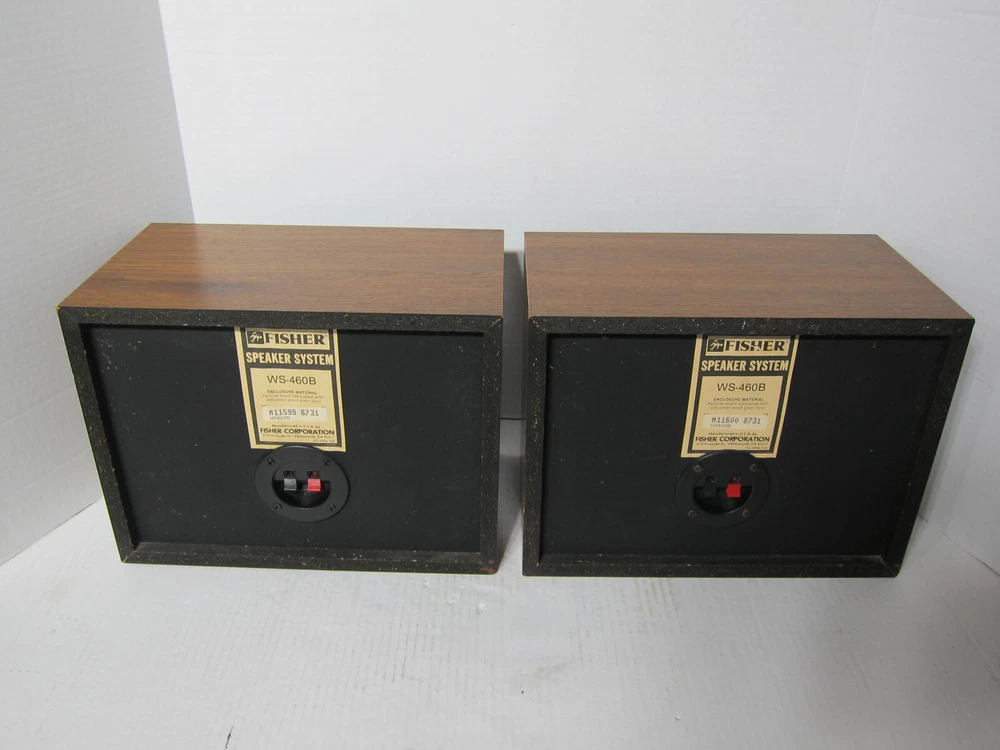 FISHER WS-460B Two-Way Sealed Enclosure Bookshelf Speakers [Matched Pair] Serial Number Left – M11599 8731 Serial Number Right – M11600 8731 Here’s a rare and beautiful pair of FISHER WS-460B 2-way speakers set in the wood grain finish that are in great condition. These speakers are very clean and have always been in a non-smoking environment and these babies sound absolutely superb. They are cosmetically outstanding - There are a few very light scratches on the unit, but you have to look hard to even see them. The speaker’s fronts are clean, crisp, and sharp; the speaker’s surround is in perfect condition; the front grills (cloth) are in great condition . For their price point, they are solid performers: Tight and satisfying bass, convincing middles, and crisp highs. The speakers produce a great soundstage with fantastic depth, awesome separation, accuracy, and they have a warm and detailed sound, especially in reproducing voices - Outstanding imaging, especially for the money. Also comes with a pair of 60” long 14 gauge copper speaker cables DESCRIPTION: FISHER really excelled in the design of the WS-460B two-way [sealed enclosure] acoustic suspension design - High Definition speakers! The WS-460B delivers high signal-to-noise, low distortion, and clean sound. Space-Saving Design - lets you install your speakers in a bookshelf or other small space. The FISHER WS-460B’S also feature an expansive frequency response and high sensitivity. You can make out throbbing lows and crystalline treble tones. The 3“ soft dome tweeters in the FISHER WS-460B are some of the best, most natural, soft sounding you will hear – never sounding overly bright. No other tweeter compares to the performance of the soft dome tweeters in the WS-460B . The woofer is a 6" high-polymer laminate which makes a dramatic difference in low-frequency reproduction. The WS-460B is surprisingly deep, actually sounding like an 8" and 10” woofer. The bass is very tight and not "loose" or "muffled" sounding at all which is why many prefer smaller woofers. The enclosure is just large enough to let the woofer produce all the low frequencies, and the insulation is the perfect amount and type for the woofer. The decorative grille is acoustically transparent, removable, and fairly see-through to allow all the sounds to escape instead of blocking or causing loss of sound. The frequency response extends all the way to 20,000 Hz, 60 max watts peak and 30 watts max [RMS] power handling which is more than enough for any small to mid-size room. You really can't go wrong with the FISHER WS-460B 2-way bookshelf speakers that are diminutive in size yet big in sound! FEATURES: * 3” soft dome tweeter provides clear and natural high-frequency sound reproduction * 6” high-polymer laminate woofer to yield excellent low-end response and tight, clean bass * Higher Sensitivity ( 92 dB) allows for lower wattage amps to produce a much beefier & louder sound * Sealed enclosure produces a more realistic and natural sounding bass * Acoustically transparent grille allows sound to escape [Non-blocking nor loss of sound] * Space-Saving Design lets you install your speakers in a bookshelf, on speaker stands etc. * Spring loaded rear speaker terminals for easy connection * Made in the USA SPECIFICATION: Amplification type: Passive Driver configuration: 2-way Woofer size: 6” Tweeter size: 3“ Max (Peak) output power: 60 Watts Max (RMS) output power: 30 Watts Response bandwidth: 50 – 20,000 Hz Sensitivity: 92 dB Enclosure type: Sealed enclosure Connectivity Wired Recommended placing: Bookshelf or Stands Detachable grilles: Yes Width: 12.25" Depth: 9.5" Height: 9.25" Weight apiece: 8.8 lbs. Weight per pair: 17.6 lbs. COSMETIC CONDITION: Excellent WHAT’S INCLUDED? 2 FISHER WS-460B speakers as shown 2 speaker grills Pair of 60” long 14 gauge copper speaker cables