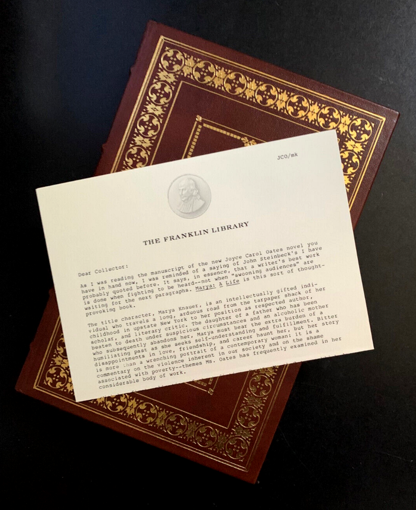 INTIMATE PORTRAYAL OF A WOMAN WHO REINVENTS HERSELF JOYCE CAROL OATES is one of America's most prolific authors with more than 70 novels and numerous short stories, plays and criticisms to her credit and she has won many prestigious awards for her peerless and fluent writing skills. But she says she found this novel extremely difficulty to write - perhaps because it was so personal as well as fictional. The author's signature - clear and bold - graces an inside page of this book. The novel is not strictly autobiographical but it does touch on elements she has known in her own life. It is a deeply intimate psychological depiction of an extremely talented young woman's journey from an impoverished and difficult childhood to her emergence a respected literary figure in upstate New York. THIS COPY IS FROM The Franklin Library's Signed First Edition Society series and it is in pristine condition with clean, crisp and unmarked pages and an unblemished brown-dyed leather binding. Like all other volumes in the series, it is handsomely produced with a gilt design on the front and rear covers extending to the hubbed spine. The page ends are gilded for appearance as well as protection and there is a sewn-in ribbon page-marker, also in brown. A note from the publisher about the production is laid in (see picture above) and there are no signs of previous ownership such as an inscription or a bookplate. Publisher: The Franklin Library Fiction: Novel ++ All books sold by Mackie Books are packaged in bubble-wrap to guard against damage. Our top priority is careful packaging. This collectible book will be mailed in a sturdy cardboard box. + Click here to see other listings by Mackie Books on eBay, including fine leather-bound books from The Franklin Library and The Easton Press as well as cased collectible books from The Heritage Press and special editions from other leading publishers. + We ship internationally through eBay's Global Shipping Program. + The illustrations in our listings are from the actual book on sale and are not stock pictures. + Our policy is to get books to you in the condition we describe in our listings. We hate bumped covers as much as you do. + We believe book collecting should be fun and that a house without books is just a house, not a home.