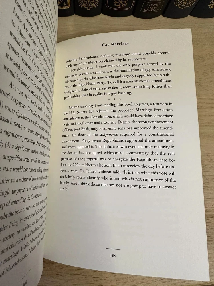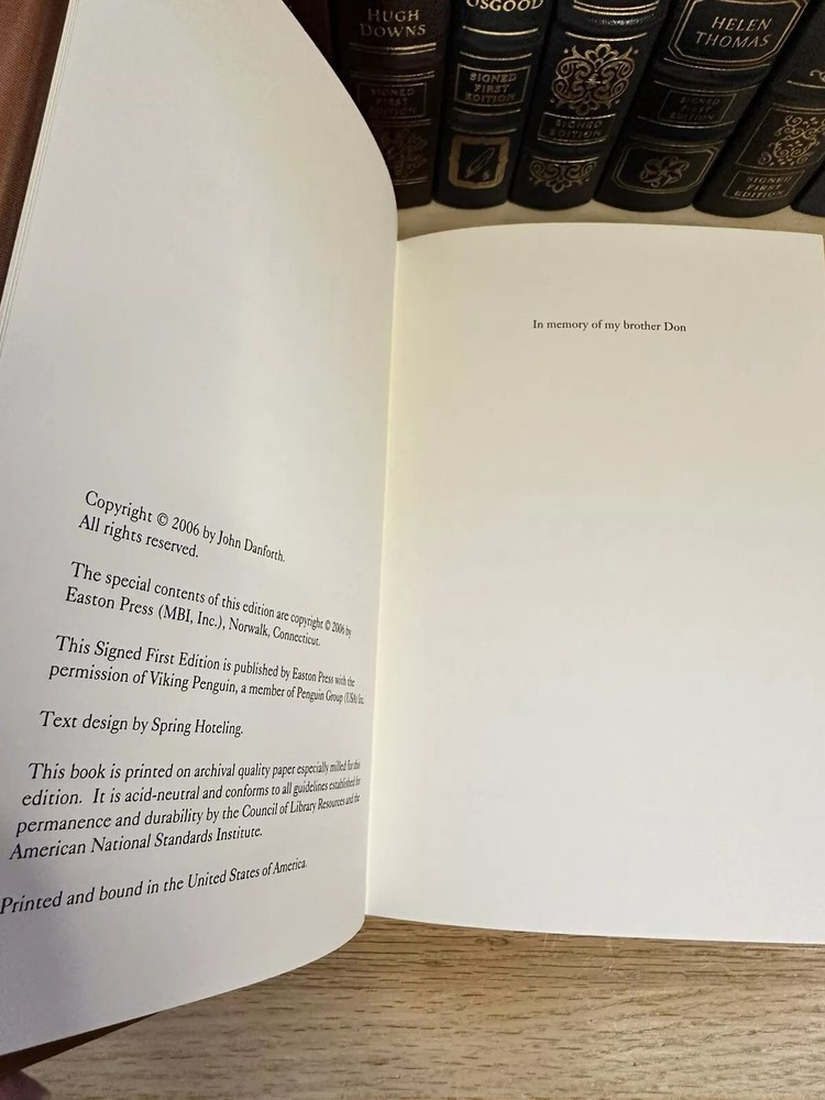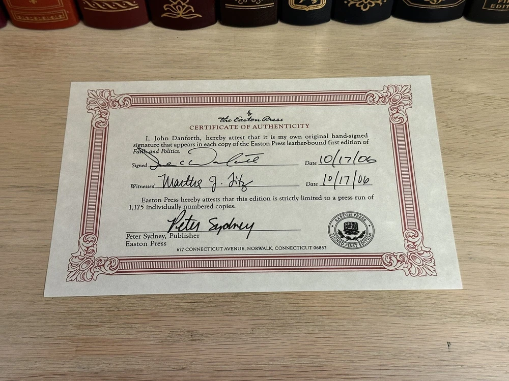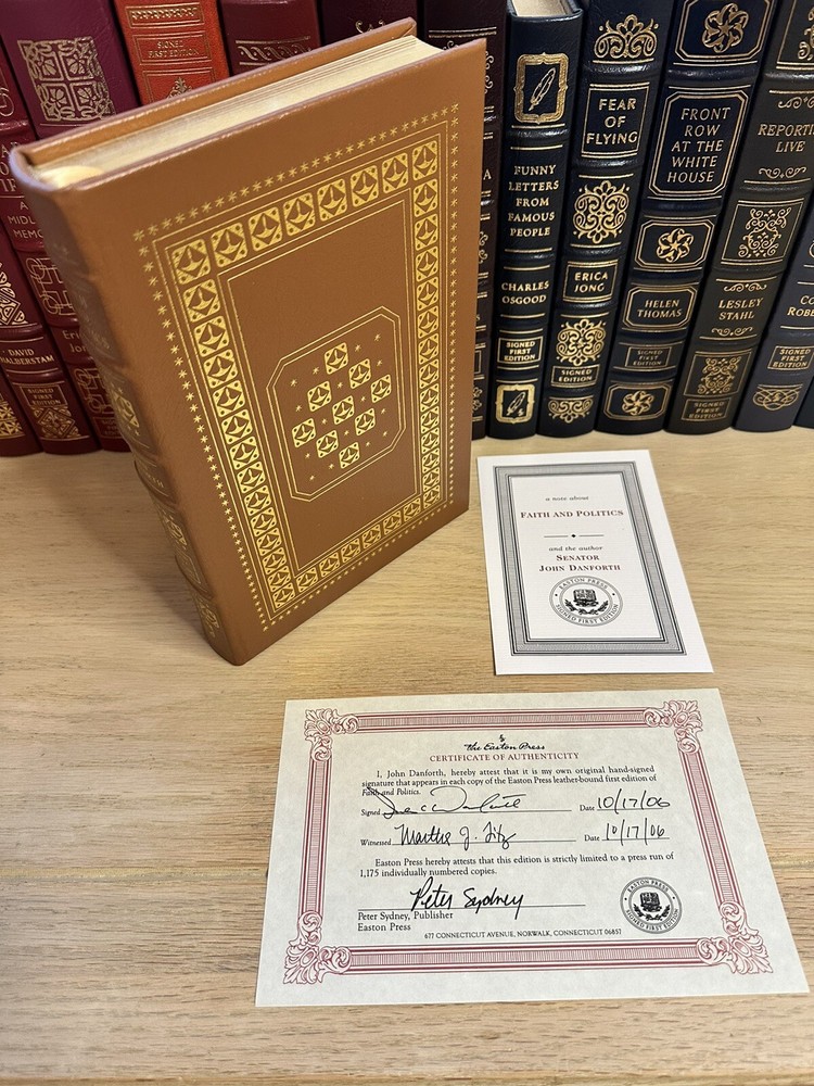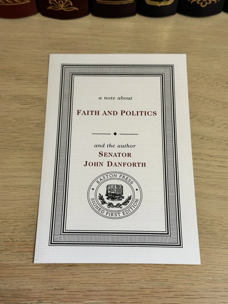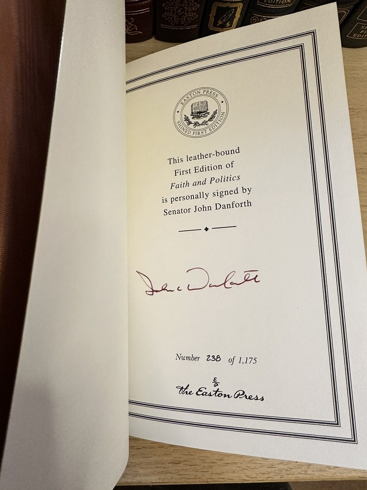 This luxurious edition from Easton Press features a signed 1st edition of Senator John Danforth's Faith & Politics. Thank you for checking out my listing! From my father’s personal library, this is a rare opportunity to own a signed first edition copy of "Faith and Politics" by John Danforth (September 5, 1936 - present). The book was published by Easton Press in 2006 and is in excellent condition. Easton Press books are known for their high-quality, signed collectible editions, and this book is no exception. Modified to enhance its value and appeal, it is a one-of-a-kind item. These originally signed, limited edition books are a great investment and will increase in value for years to come. Do not miss out on this amazing opportunity! Easton Press books are known for: • Premium leather • Silk Moire end leaves • Distinctive cover design • Hubbed spine • 22KT gold accents • Satin ribbon page marker • Gilded page edges • Long-lasting, high quality acid-neutral paper • Smyth-sewn pages for strength and durability Note - This is an 19 year old book that is in excellent condition. ** There may be slight residue from a removed bookplate. I will be including a new bookplate to cover this minor imperfection. Please see picture Expedited shipping available. Please feel free to reach out with any questions! I have hundreds of Franklin Library and Easton Press books for sale, so do not hesitate to ask if you are searching for any specific title.
