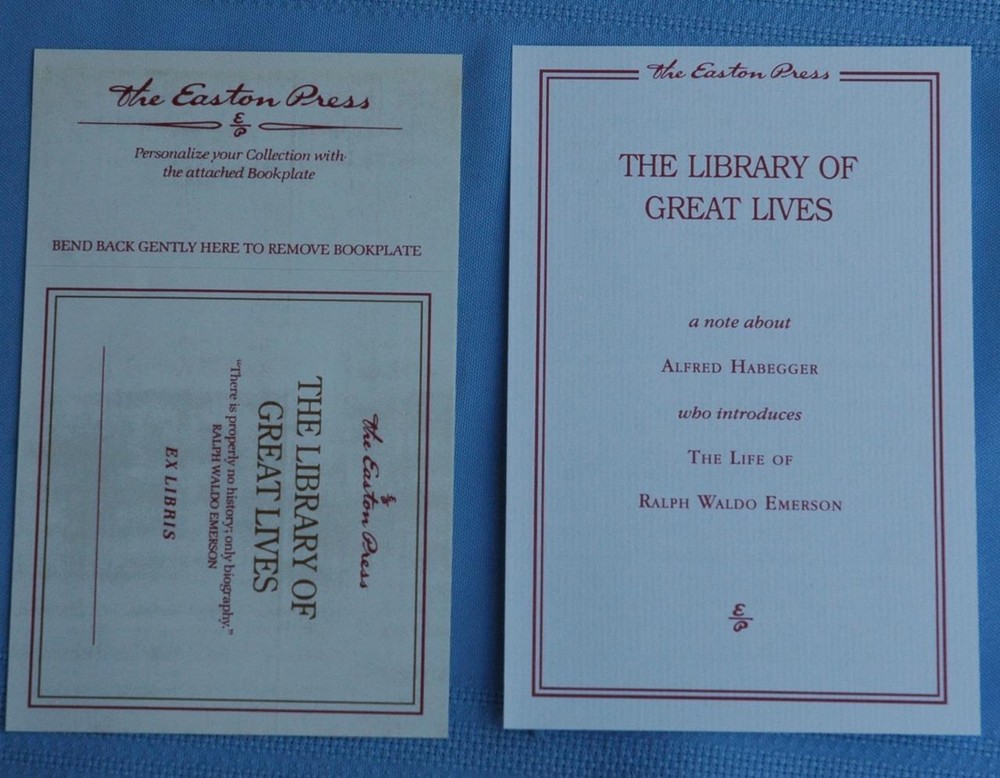 Offered For Sale is a Fine Easton Press Copy of "The Life of Ralph Waldo Emerson" By Ralph Rusk - part of the Great Lives Series - clean pages, tight binding, and the book looks to have never been read - note and unused bookplate are included Fine Easton Press Copy of "The Life of Ralph Waldo Emerson" By Ralph Rusk Fine Easton Press Copy of "The Life of Ralph Waldo Emerson" By Ralph Rusk Click images to enlarge Description Offered For Sale is a Fine Easton Press Copy of "The Life of Ralph Waldo Emerson" By Ralph Rusk - part of the Great Lives Series - clean pages, tight binding, and the book looks to have never been read - note and unused bookplate are included BYB2301 Shipping Items to continental US will be send via USPS media mail, Fed Ex Ground, Or Parcel Post unless other arrangements are made. Handling time is up to 4 business days prior to shipping. There are many expenses involved in shipping your product safely including padded mailers, bubble wrap, peanuts, tape, FRAGILE stickers, and in most cases insurance since insurance is now seller's responsibility. Understand that shipping costs may reflect a charge for these items. It is also sometimes difficult to estimate shipping costs before the item is actually packaged. If you feel you have been overcharged, please contact me before leaving negative feedback. If there is a large discrepancy, I will make an adjustment, often before you ask! Terms of Sale Full refunds are available if not satisfied. Item must be returned in same condition as shipped. Kindly contact me immediately should you in any way be unhappy with your purchase, as I will make every effort to correct the situation, as evidenced by my feedback track record. Pictures sell! Auctiva offers Free Image Hosting and Editing. 300+ Listing Templates! Auctiva gets you noticed! The complete eBay Selling Solution. Track Page Views With Auctiva's Counter