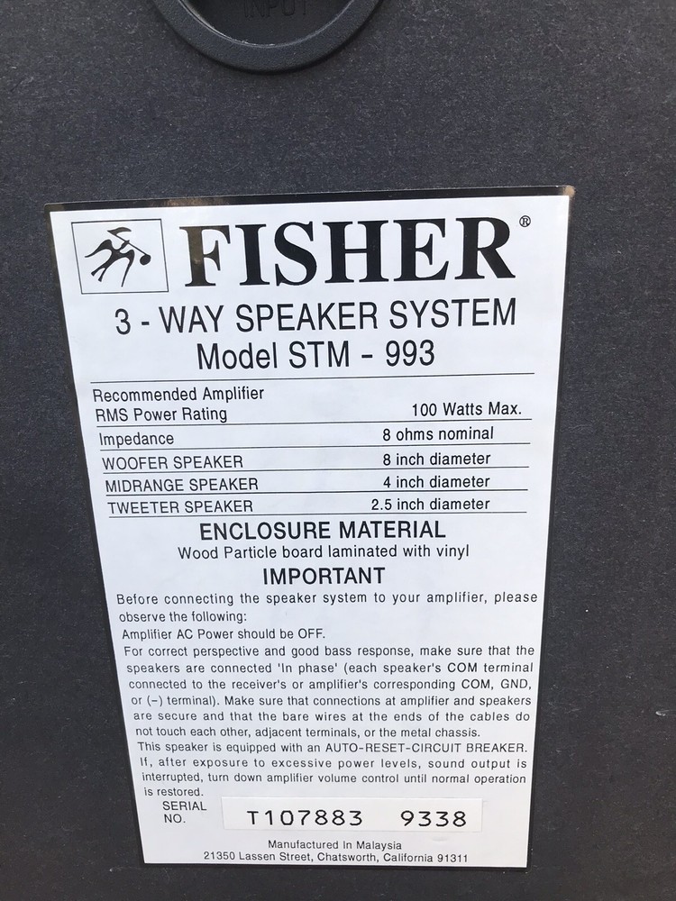 Fisher 3 way speaker Model # STM-993. Condition is "Used". Shipped with USPS Priority Mail....