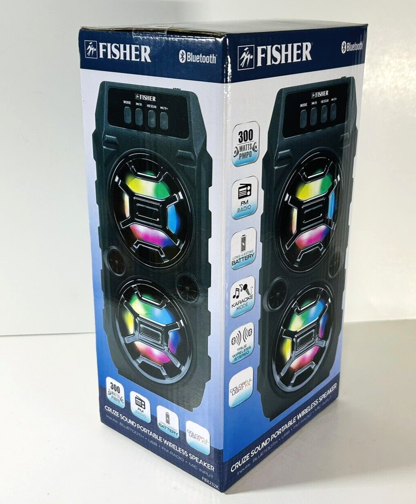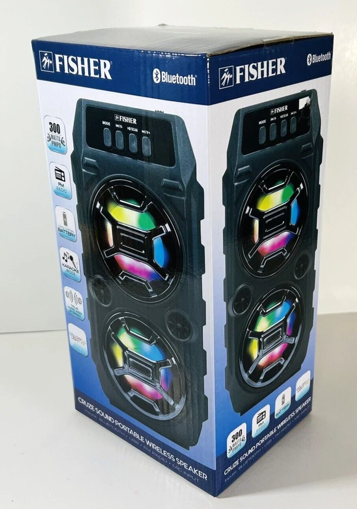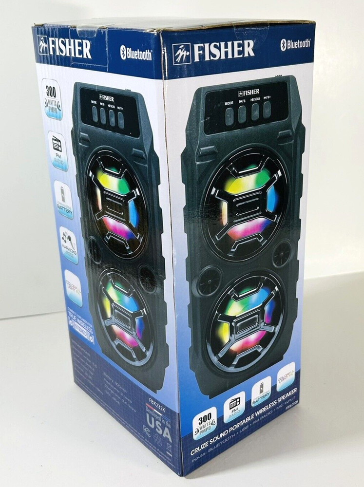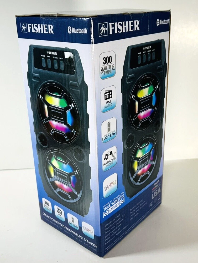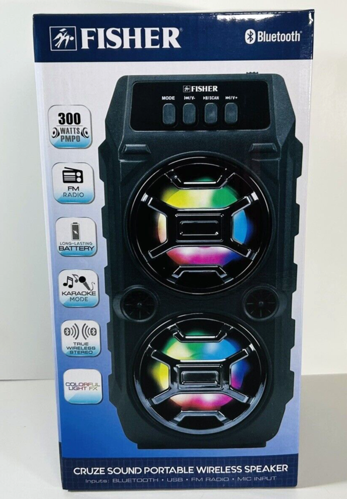 Fisher Bluetooth Cruze Sound Portable Wireless Speaker FBX232K NEW In sealed box Developed in the USA 300 watts PMPO FM Radio Karaoke Mode True Wireless Stereo Colorful Light FX Bluetooth version 5.0 Battery: 800mAh ~ Charge time 3-4 hours USB MIC Input Will be shipped USPS economy shipping