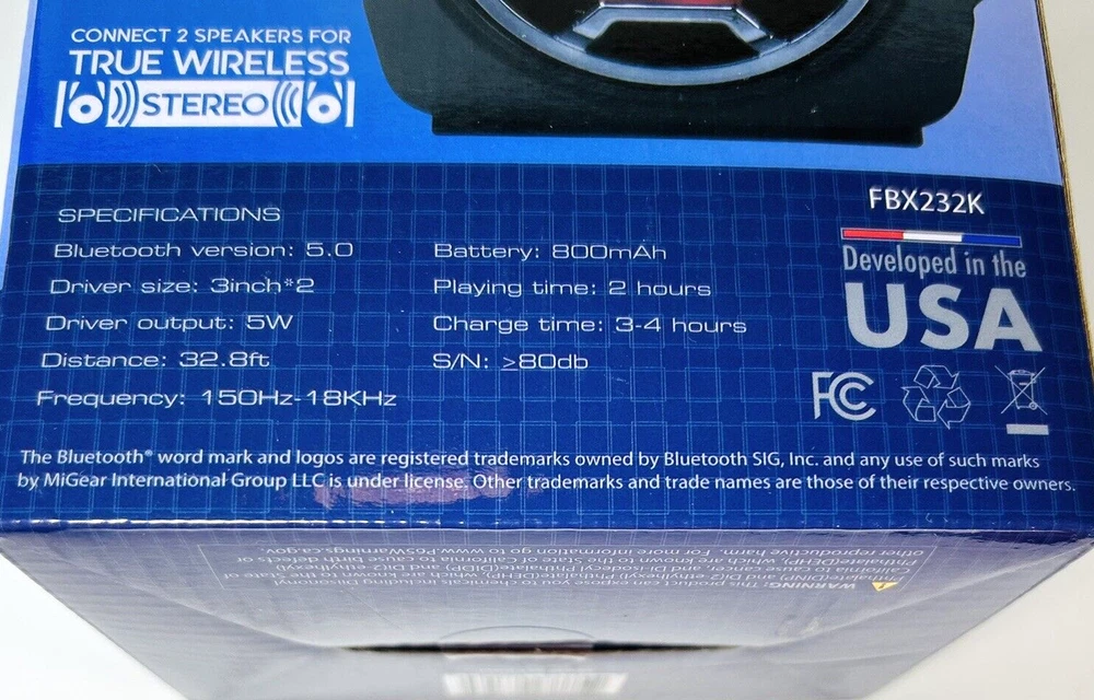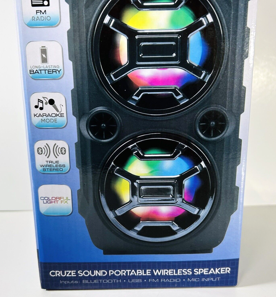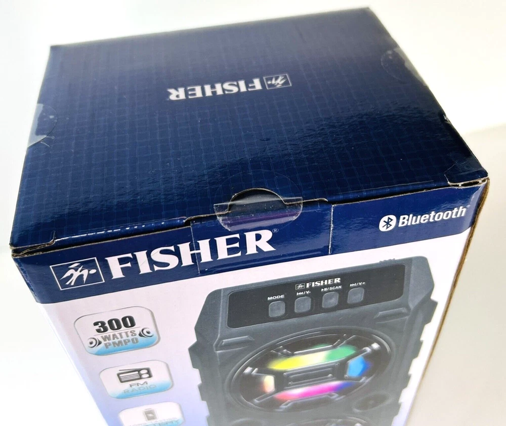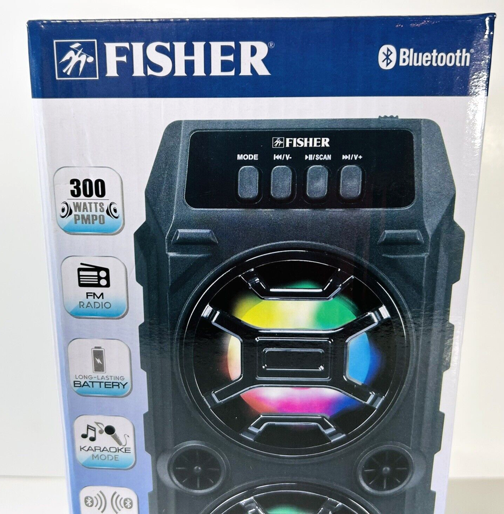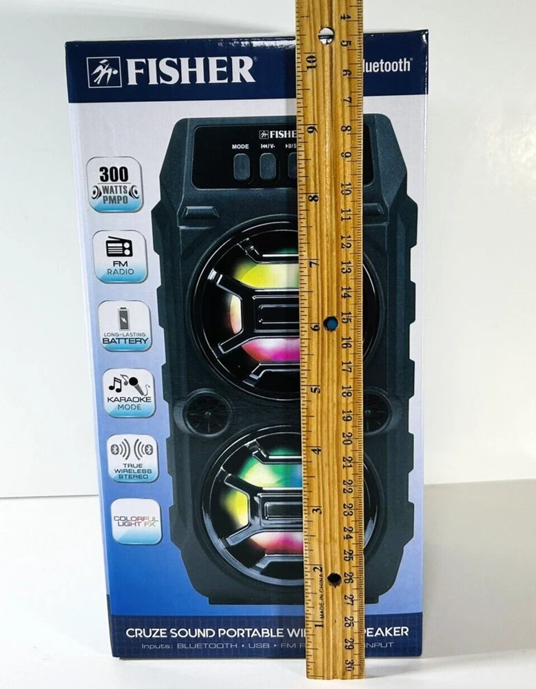 Fisher Bluetooth Cruze Sound Portable Wireless Speaker FBX232K NEW In sealed box Developed in the USA 300 watts PMPO FM Radio Karaoke Mode True Wireless Stereo Colorful Light FX Bluetooth version 5.0 Battery: 800mAh ~ Charge time 3-4 hours USB MIC Input Will be shipped USPS economy shipping