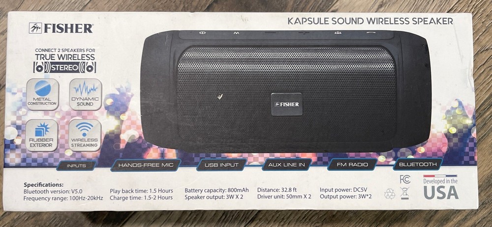 New open box Fisher Bluetooth Kapsule Sound Wireless Speaker Splash Proof FBT356K No returns, US shipping only