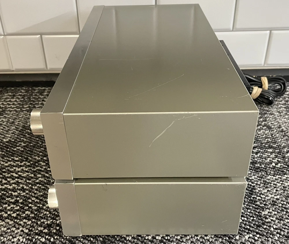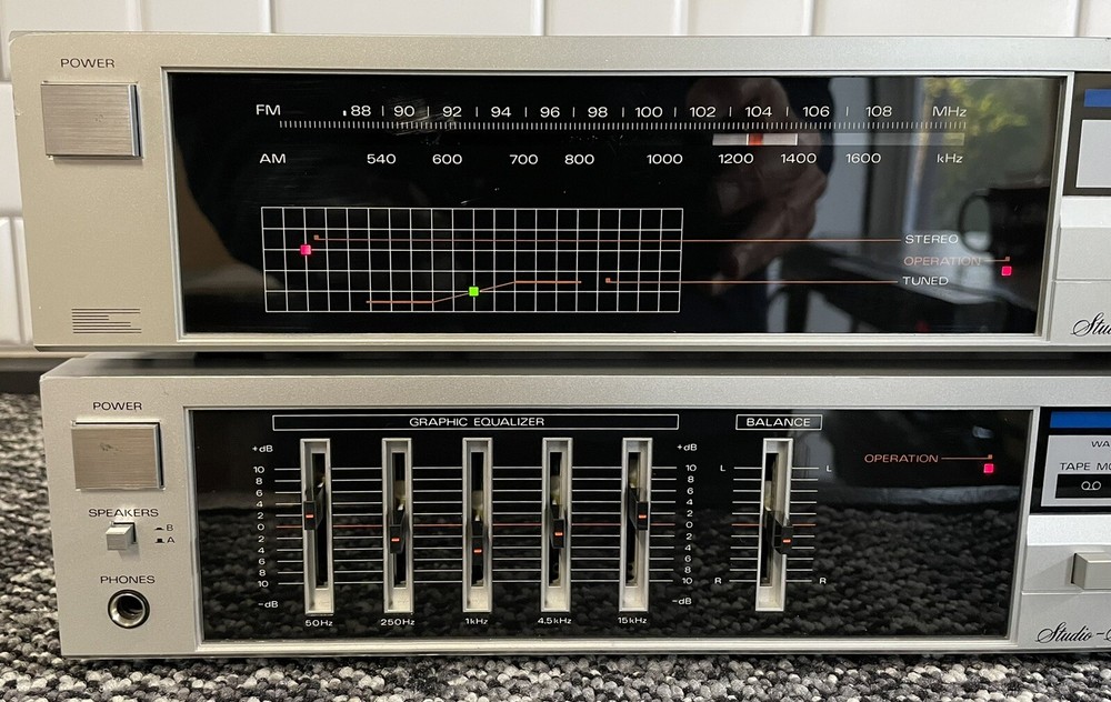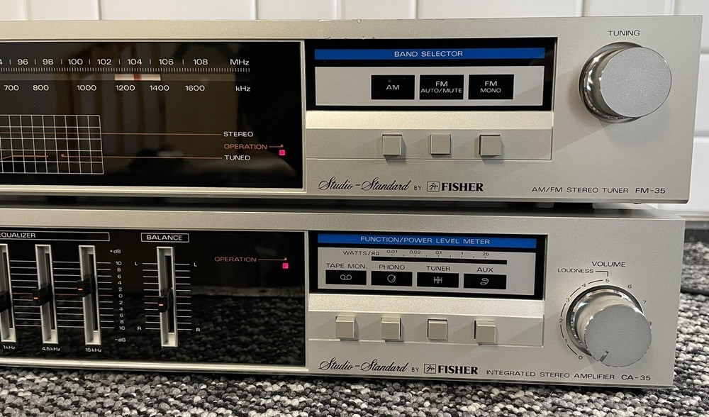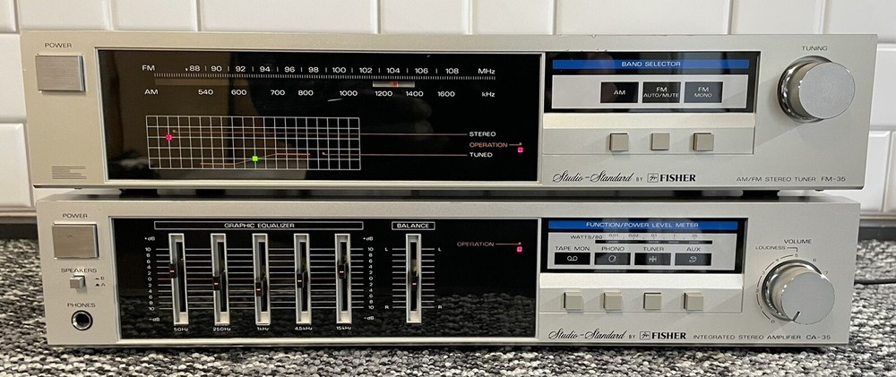 Fisher CA-35 Amp/Tuner Combo. Amp: 1984-Japan, 20 watts per channel (powerful for 20 watts!), 120 system watts, .9 THD. Phono input. Power level meter. 5 band equalizer (50 Hz slider has issues, but makes great bass at default setting!). FM-35 tuner, dial tuning. Both work well, great quality sound. Each measures 15 3/4”W x 3”H x 8”D. Listed Parts/repair due to too many abusive eBay guarantee scammers.