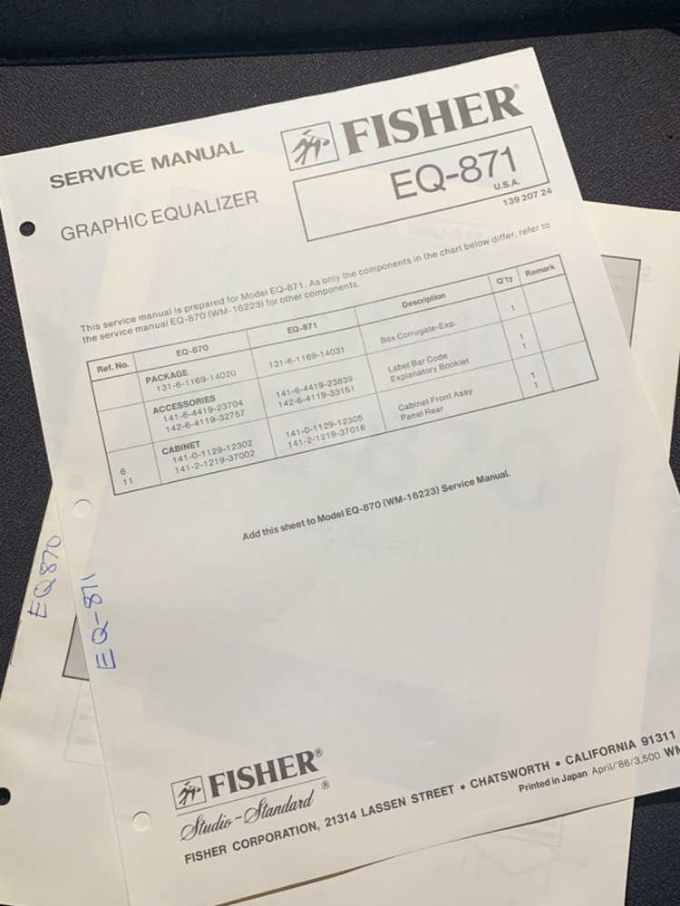 I am selling a Fisher EQ-870 EQ-871 Service Manual Graphic Equalizer Original.. Item was used at a repair center .. Item will be shipped USPS First Class or Media Mail..