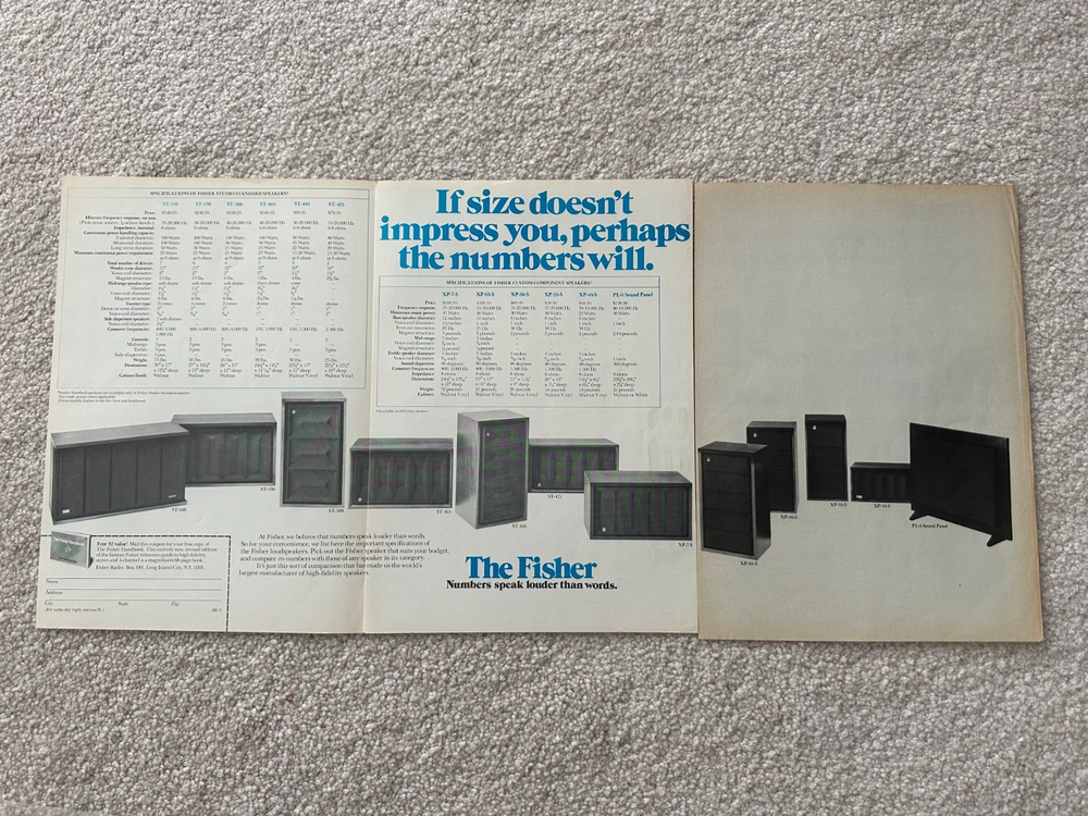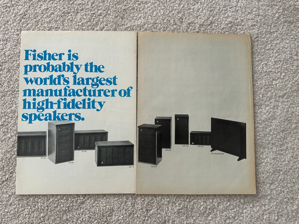 Original (not a copy) advertisement from High Fidelity magazine, March 1974. Advertising the Full-line of speakers from The Fisher company. The product line advertised is the latest prior to Fisher being acquired by Sanyo, including the best end-of-product-line designs from The Fisher company. See the images for models like: ST-550 and ST-530 (the VERY rare Bose knock-off bookshelf speakers) ST-500, ST-465, ST-445, ST-425 high-end bookshelf speakers XP-65-S, XP-56-S, XP-55-S and XP-44-S economy bookshelf speakers PL-6 Sound Panel speakers (super rare). The ad includes list pricing and full specifications typical of many ad strategies of the day. Very good condition, no folds, no damaged corners. 3 pages of approximately 8.5x11 making a fold-out to frame of about 25x11 for presentation. Note, the fold-out page (1 and 2) are still attached, the third page is separate - your framer can match. Will be packaged between layers of cardboard, and in protective plastic. Great framed wall exhibit and essential reading for the Fisher and Audio Collector to have. The pictures are part of the description. Be aware vintage print materials, paper and ink may have odor. SHIPPING: I typically ship same or next day. Packing and shipping is expensive, and I am not Amazon Prime, so shipping is not free. BEFORE YOU BUY, READ CAREFULLY: Selling AS IS. No Warranty is expressed or implied. NO Returns or refunds for any reason. No after-sale support is implied or offered.