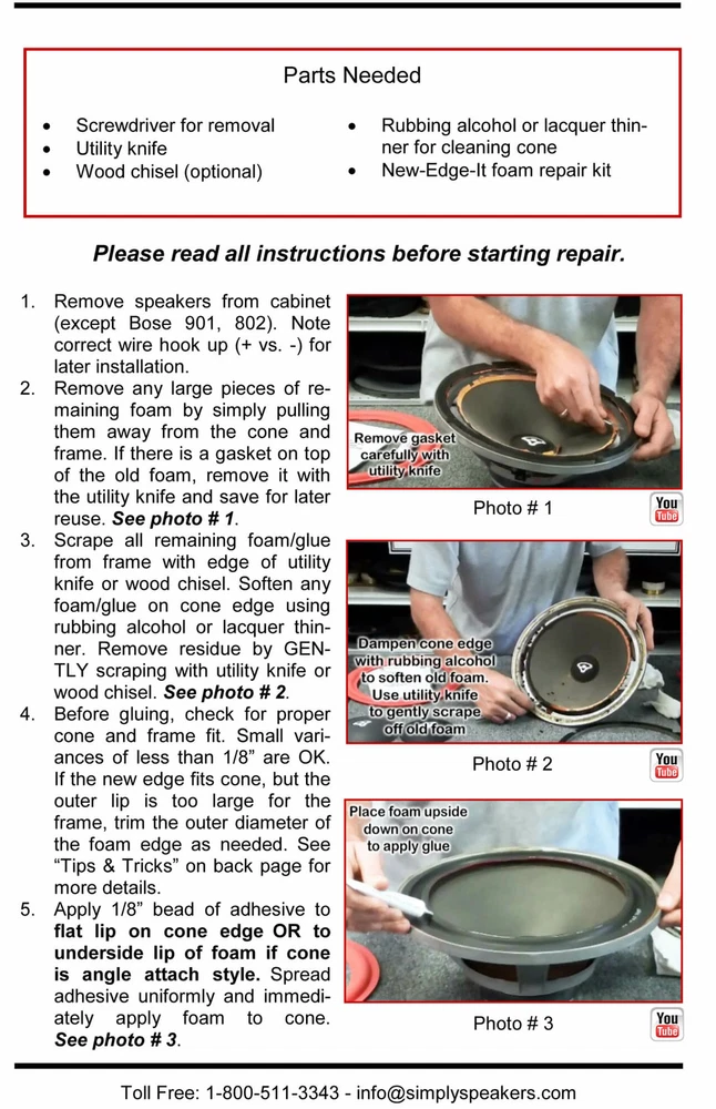 Home About Us Store Policy Contact us Repair Videos FAQs New-Edge-It Foam Kits by Brand New-Edge-It Foam Kits by Size Diaphragms Speaker Reconing Kits Speaker Grills & Grill Cloth Passive Radiators Repair Kits For Bose 901 & 802 Speaker Accessories Pro Grade Adhesives Rubber Edge Kits Speaker Dust Caps Speaker Gaskets Send Speakers To Us For Repair Spiders & Misc. Parts Tweeters Midranges Woofers Specials Ferrofluid Kits Factory Parts Leadwire Repair Kits Fuses and Bulbs New-Edge-It Speaker Repair Kit Store Newsletter Add Simply Speakers to your Favorites to receive our email newsletters about new items and special promotions Sign Up Fisher LXI 15130 15131 5115 AL-315 DS-196 SC80630 15" Woofer repair kit FSK-15F Item Description The most common problem with speakers are rotted, torn or damaged surrounds. The surround is the outer suspension part of the cone. Constant vibration, time and the environment cause foam and rubber surrounds to degrade. Cloth and paper surrounds can become brittle. This causes distortion and poor performance. Luckily, our easy to install repair kits will make your old speakers sound just like new! New-Edge-It® speaker repair kits. America's # 1 brand since 1992. See Product Description, Title or the "Fits Models" tab to see speakers listed for this repair kit. Repair kit includes: 2 x made in USA foam surrounds: Outer diameter: 14.75" (375mm), Roll outer diameter: 13.5" (343mm), Cone diameter: 12.125" (308mm), Inner diameter: 11.75" (298mm) Flat attach Exact dimensions can also be viewed in the photo gallery 1 x MI-3035 rubber based repair adhesive 1 x applicator brush Easy to follow color illustrated instructions FREE technical support and online videos Product Overview: Brand new formula made in USA surrounds last much longer than the originals. We ship the same high quality parts used in the pro audio repair market. We do NOT use generic glues or low quality imported surrounds like others sell. Our exclusive clear drying rubber based repair adhesive is designed for paper, poly, and composite cones. Dries flexible, strong and clear. Kits can be installed without removing the dust caps. Dust caps, shims and gaskets are available for most models if needed. Access to our complete library of how-to speaker repair videos. Fast and FREE shipping to any USA address and worldwide shipping. Economical and environmentally friendly. Save money AND save your speakers. Simply Speakers® - Quality Speaker Parts since 1992! Shipping Info Shipping Info Terms & Conditions About Us Testimonials FAQ Shipping Info We ship all orders within 24 hours of receipt of payment. Most orders ship same day. Weekends & holidays excluded. The address provided by eBay or PayPal will be used for shipment. We are not responsible for wrong or un-deliverable addresses. BE SURE YOU HAVE CORRECT ADDRESS ON FILE! We cannot change the address once your order has been processed through eBay. Please note: Saturday, Sunday and all major holidays do NOT count as shipping days. We ship worldwide (with the exception of a few countries listed on our eBay excluded list) Import taxes, duties, fees, or other charges are NOT included in the item price or shipping charges and are the sole responsibility of the buyer. We will not mark down invoices or claim items as "gifts" or otherwise assist in deceptive international shipping practices. SS Audio speaker foam edge repair kits, diaphragms and other qualified items shown in our listings ship to the USA for free. Free shipping method will be US Mail First Class or Priority service depending on weight and zone. Some items may not quality for free shipping. Shipping charges will appear for those items. Simply Speakers, SS Audio and the US Mail do not guarantee shipping transit times unless special arrangements are made and paid for prior to shipment. If you need overnight or other expedited service please contact us prior to placing your order or choose those options when you checkout. Terms & Conditions Terms & Conditions Please take special care to order carefully and completely. We have thousands of speaker repair parts in stock and not all models are listed for every part we sell. In some cases, you will need to verify the correct parts by removing the defective component from your system first and prior to ordering to determine which model you have. You may need to measure a part of your speaker to determine if the replacement part is compatible. We can help you in determining which parts you need. Please contact us. See our FAQ page for other frequently asked questions. We may ask you to email a photo of your speaker to us for verification. Ask all questions before placing an order. When buying one of our products please note that the item is sold only for the described purpose. We will replace, or exchange only those products which are deemed to be incomplete or defective by a company representative. We gladly accept the return of products that are defective due to defects in manufacturing and/or workmanship for 30 days from the date of purchase. Items that have been mis-ordered or are no longer wanted may be returned for refund or exchange within 30 days from the date of purchase at customer expense. Please note: FREE SHIPPING ITEMS may have our shipping cost deducted from any refunds due to orders made in error, or that are no longer wanted. Returned items must be in new saleable condition with all packaging and contents. Units showing signs of use, ie. solder or screw marks or scratches cannot be returned. A restocking fee may apply. In most cases, no RMA is required, simply include a copy of the sales receipt with your return along with a brief description of the issue. Special order items are NOT returnable. Speakers and parts showing signs of mis-use, overpowering, underpowering (distorted), malfunctioning amplifiers, or improper crossovers will not be covered under warranty. Speakers or parts with burnt voice coils, blistered voice coils, torn cones, 