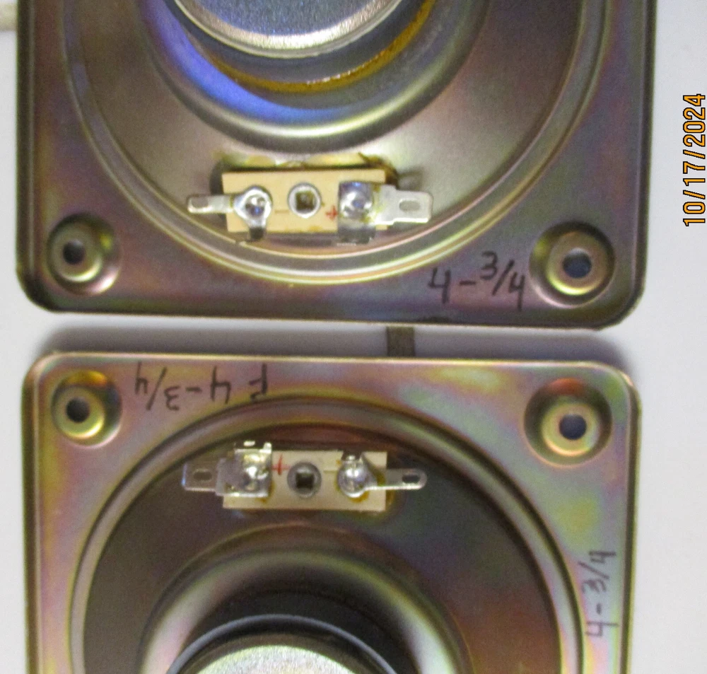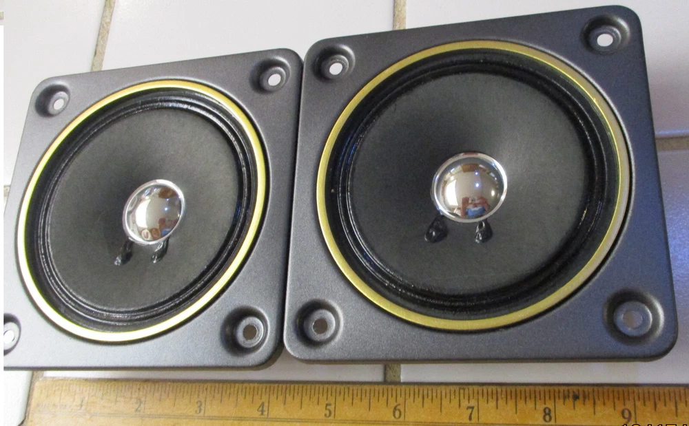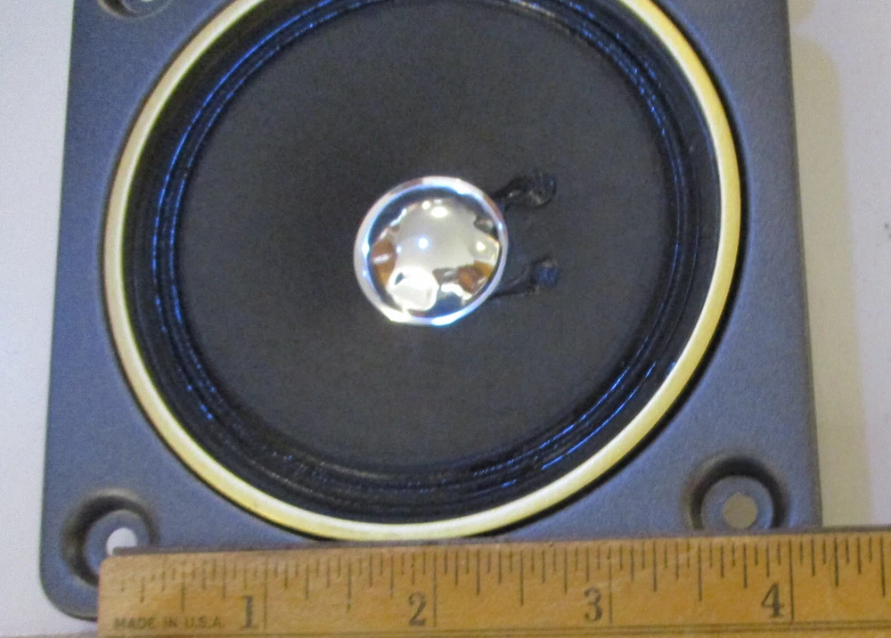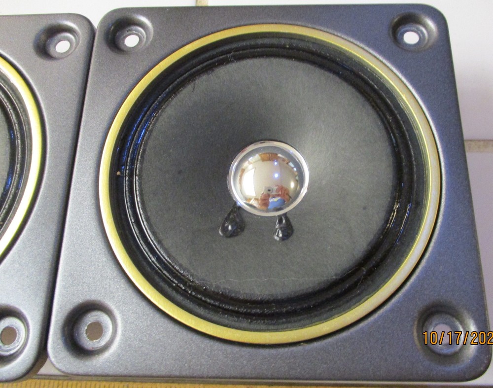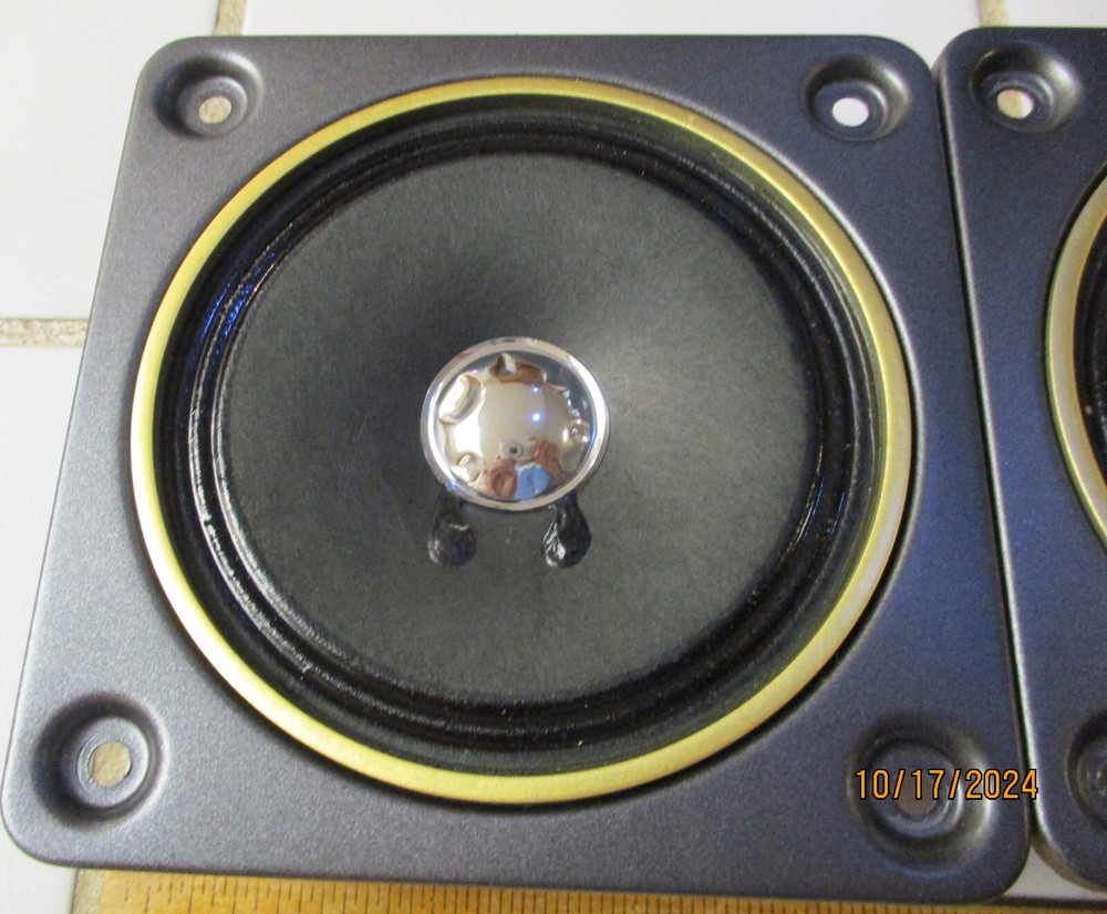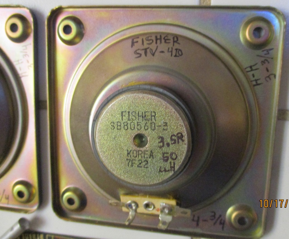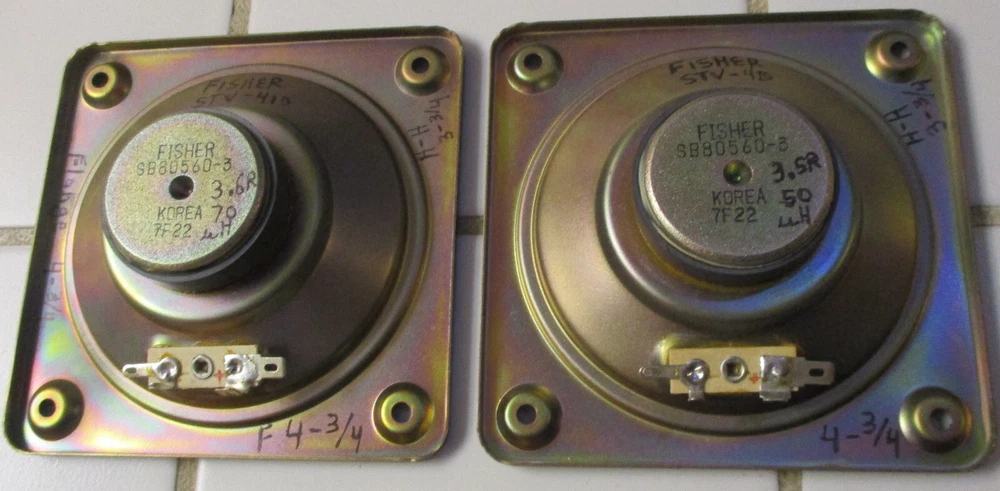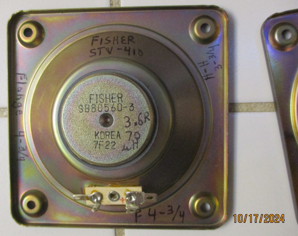 This e B a y Ad is for one Fisher S80560-3 MidRange with a 4 Ohm rating pulled from STV-410 decommissioned Speakers Two are available at start of the Ad MidRange 1 measures at 3.6 ohms, and 70uH MidRange 2 measures at 3.5 ohms, and 60uH SPECs: 9 ounces per Driver, 1.5" Deep, Flange X & Y is 4.75" on all sides (see Pics) Mount holes 3.25" across SQ holes, all sides. Surround is an accordion weave with treated thin resin (not a foam) Each produces equal Voice Range and too Alto sounds (balanced) Thank You for Looking - Notice Shipping is a better price? Ships to USA. Handling $3 Basement clear-out - many Audio items and Loud Speakers. Selling my collections on Downsize. There are other cool Audio, Speakers, and electronics at solar_home eBay pages.