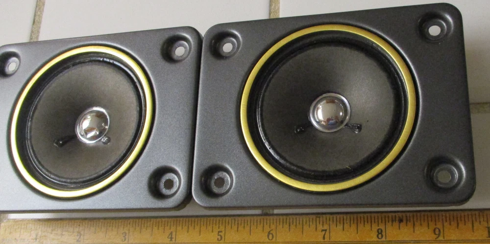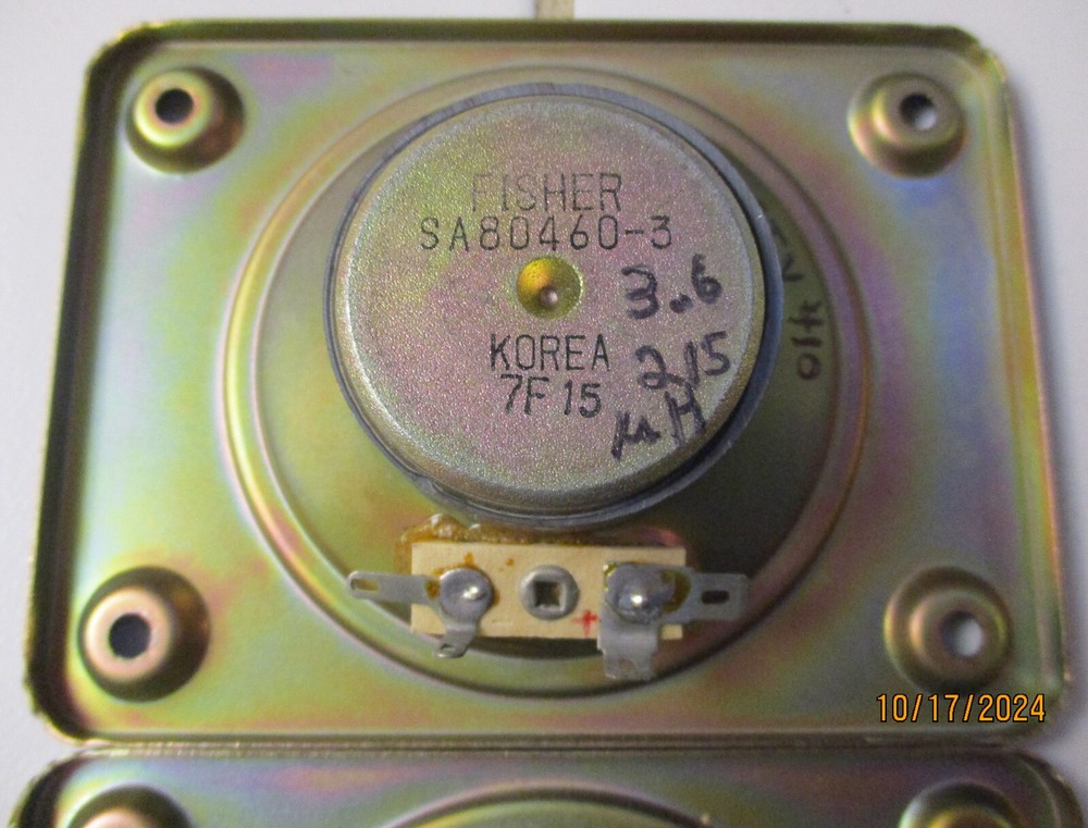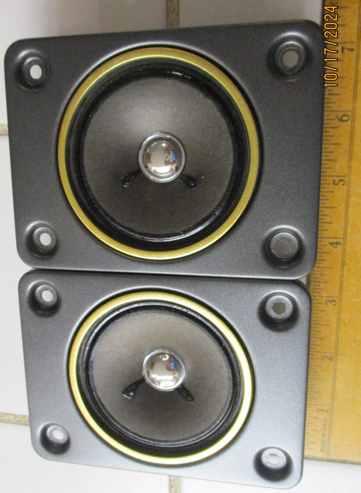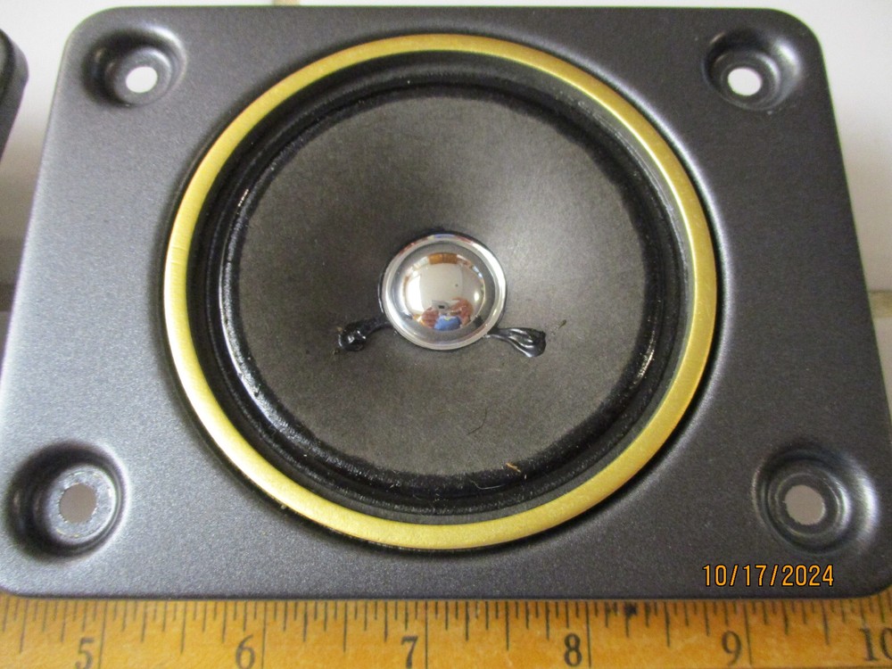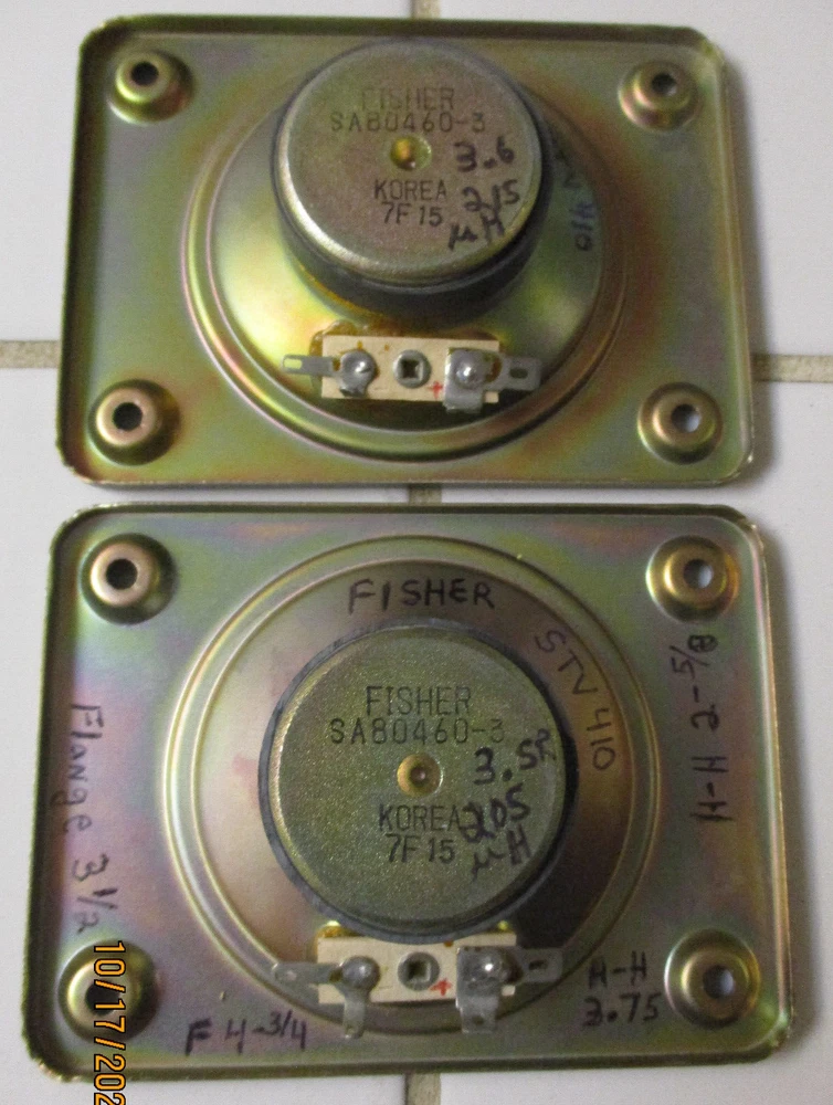 This e B a y Ad is for one Fisher SA80460-3 Tweeter with a 4 Ohm rating pulled from STV-410 decommissioned Speakers Two are available at outset of the Ad Tweet 1 measures at 3.6 ohms, and 215uH Tweet 2 measures at 3.5 ohms, and 205uH SPECs: 7.8 ounces per Driver, 1.5" Deep, Flange X & Y is with a 4.75" x 3.5" (see Pics) Rectangular mount holes 3.75" and 2.5". Surround - accordion weave, treated thin resin (not a foam) Each produces equal Higher Freq sounds (balanced) Thank You for Looking - Notice Shipping is a better price? Ships to USA. Handling $3 Basement clear-out - many Audio items and Loud Speakers. Selling my collections on Downsize. There are other cool Audio, Speakers, and electronics at solar_home eBay pages.
