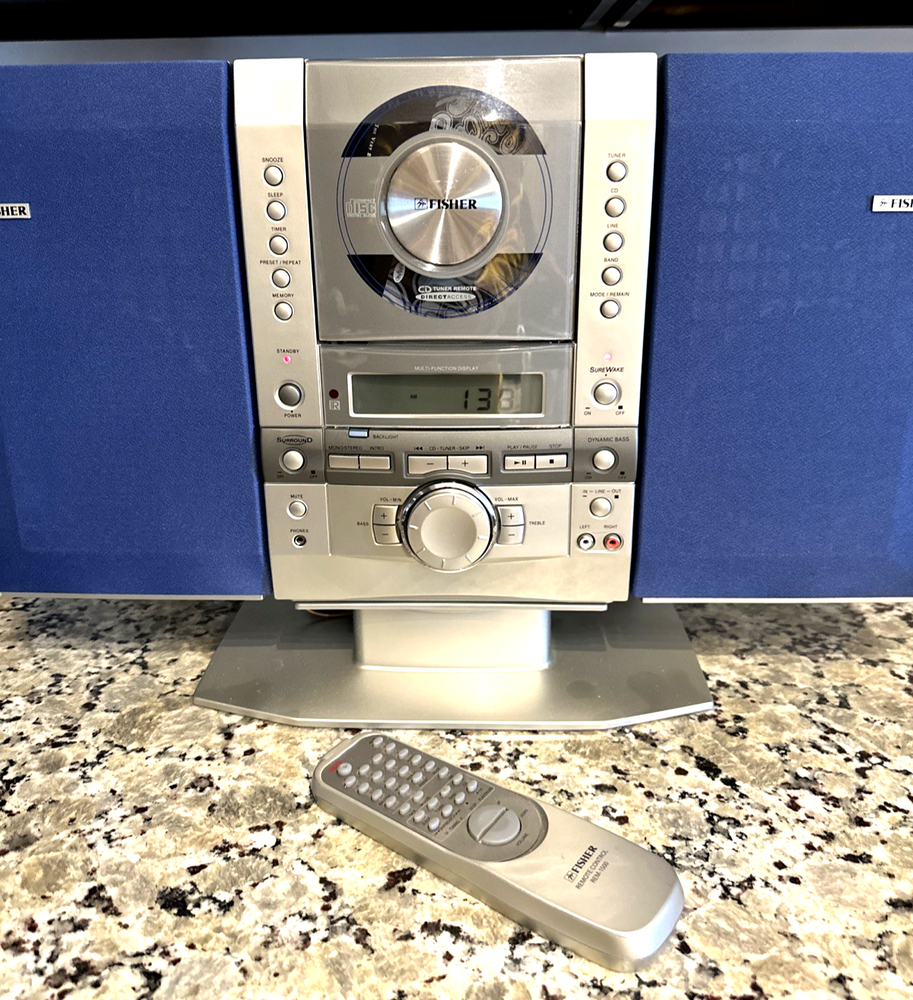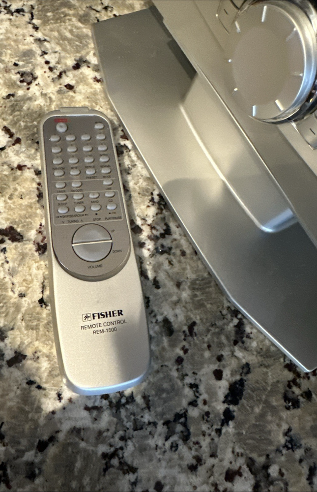 Fisher SLIM-1500 AM FM Radio CD Player Stereo With Detachable Speakers and Remote Control. Very Good Cosmetic Condition. Has 1 very small quirk. The CD Player Skips Sometimes When Played At VERY High Volumes. When Played At Lower or Normal Volumes It Plays Great. Radio Plays Great. If You Can Get By The Louder Volume CD Skipping This Is Stereo Looks Great and Sounds Great. See All Pictures CLO