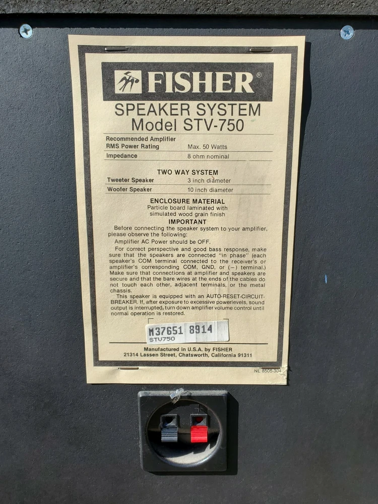 Fisher Speaker System model STV-750 Recommended Amplifier RMS power rating: Max. 50 Watts Impendance: 8 ohm nominal TWO WAY SYSTEM Tweeter Speaker: 3 inch diameter Woofer Speaker: 10 inch diameter...