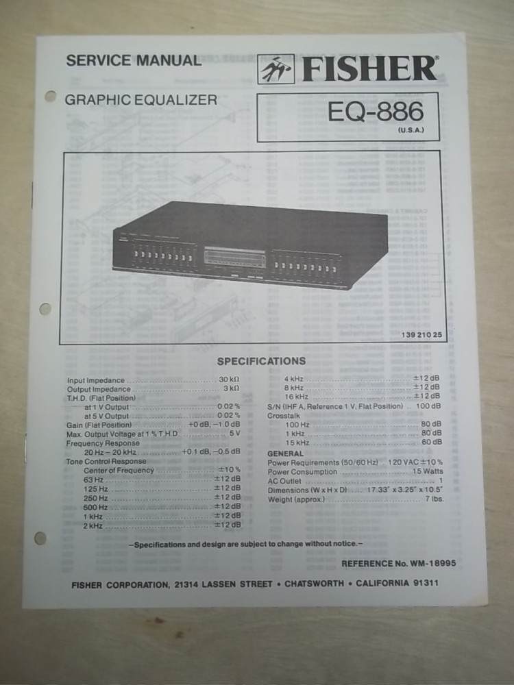 Fisher Service Manual~EQ-886/886A Graphic Equalizer Up for sale is a factory issued Service Manual for the Fisher EQ-886 and EQ-886A Graphic Equalizer . Contains at a minimum: Specifications, Block Diagrams, Schematic Diagram and Parts List. Very good condition. Don't settle for hard to read copies or PDF's. T his is an original document. Tired of your improperly packed purchases getting damaged in shipping? I pack with care. I use a full sheet of rigid protective material, a plastic sleeve, a 'Please Do Not Bend' sticker, and free Delivery Confirmation. All of my items are originals, I do not deal in reproductions. I am happy to ship internationally. Payment is expected within 7 days from end of auction. ~I will combine shipping when possible. ~I am very good about shipping within 3 business days after payment is received. ~Once item is received please leave positive feedback and I will do the same. Track Page Views With Auctiva's FREE Counter