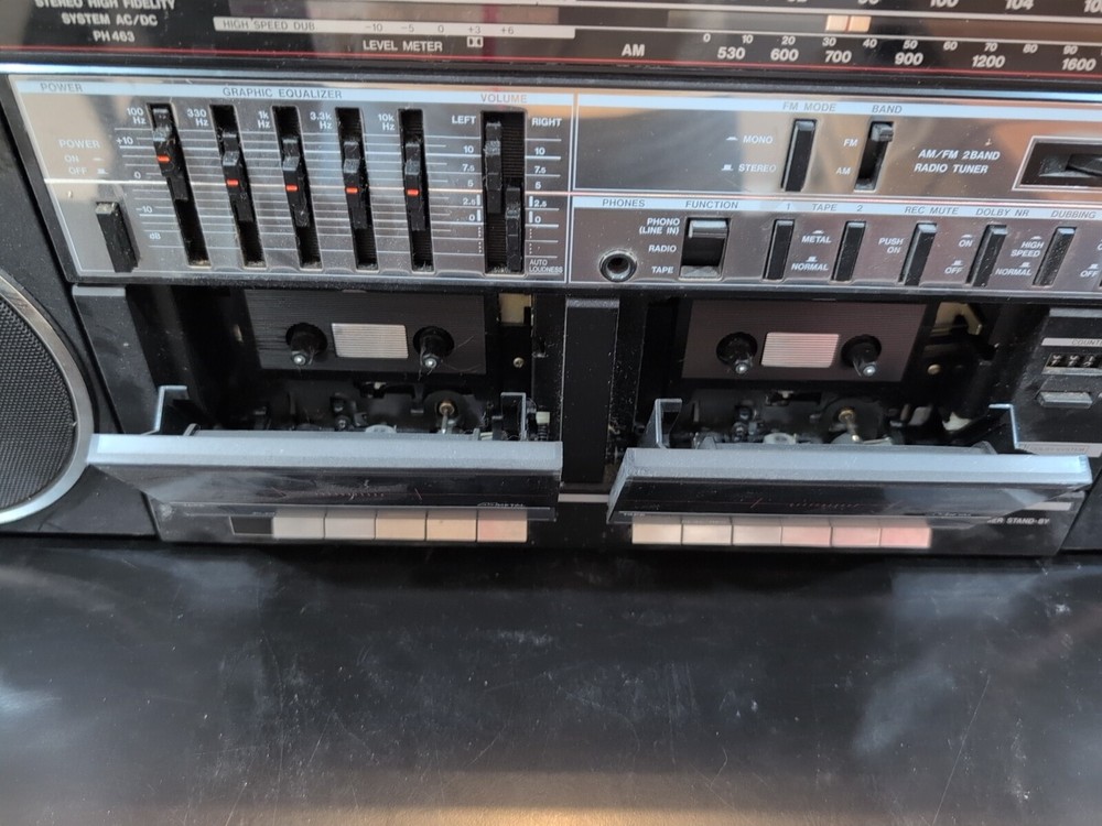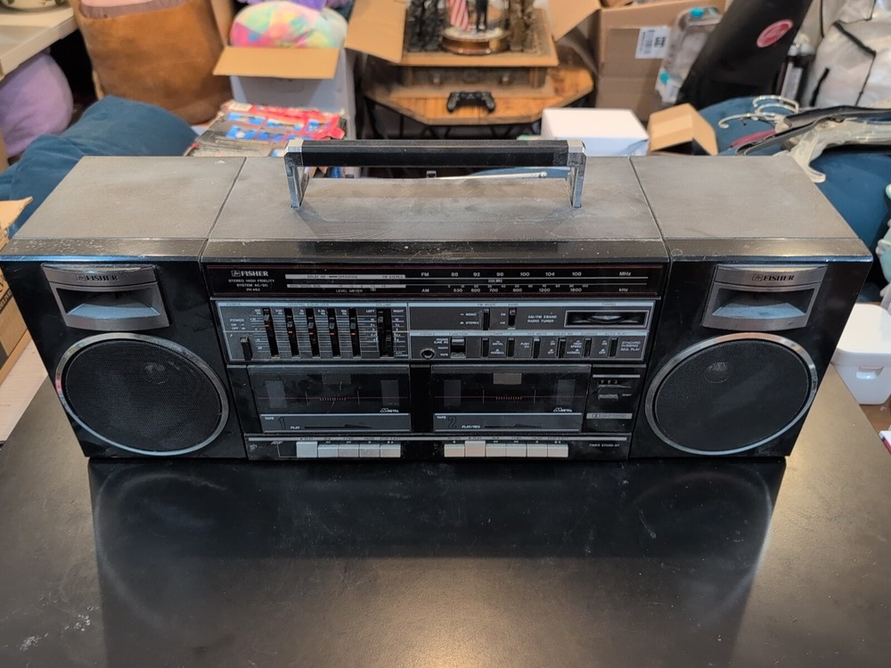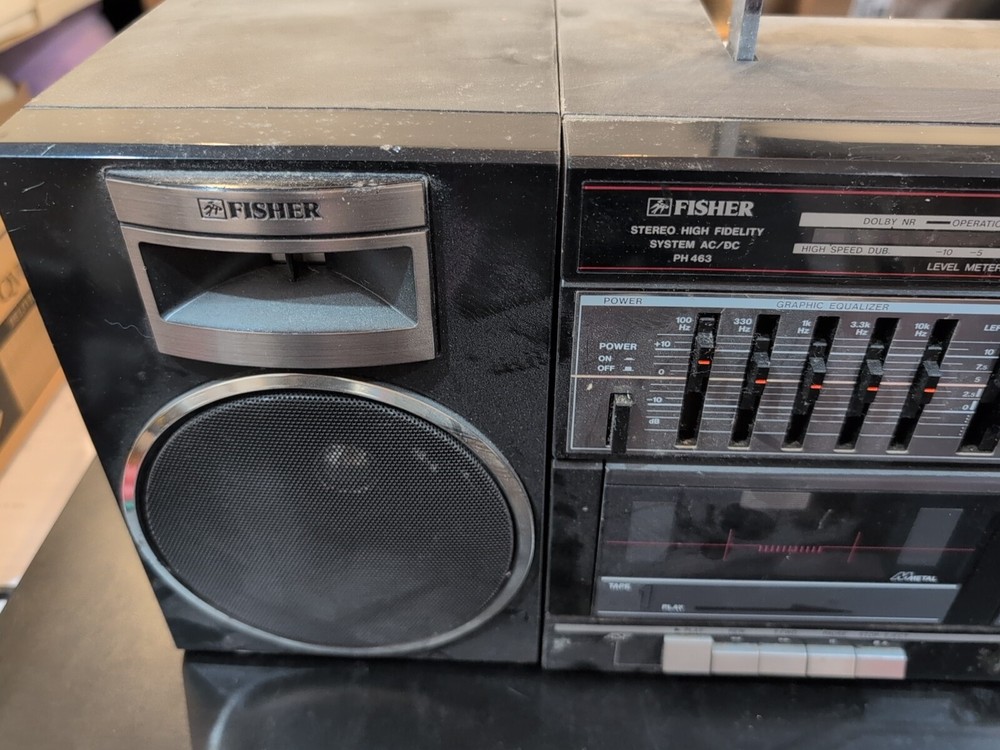 Enjoy your favorite tunes with the Fisher Stereo Boombox PH 463, featuring a high fidelity AM/FM radio system. This vintage piece is perfect for any collector or music lover looking to add a touch of nostalgia to their audio setup. Crafted with care in China, the PH463 model boasts a sleek design and easy-to-use controls. The boombox comes from the renowned brand Fisher and does not include any custom or modified components, ensuring you get the authentic vintage experience. Whether you're looking to relive the golden era of music or simply appreciate the classic aesthetics and sound, this Fisher Stereo Boombox PH 463 is a timeless addition to your collection. Untested