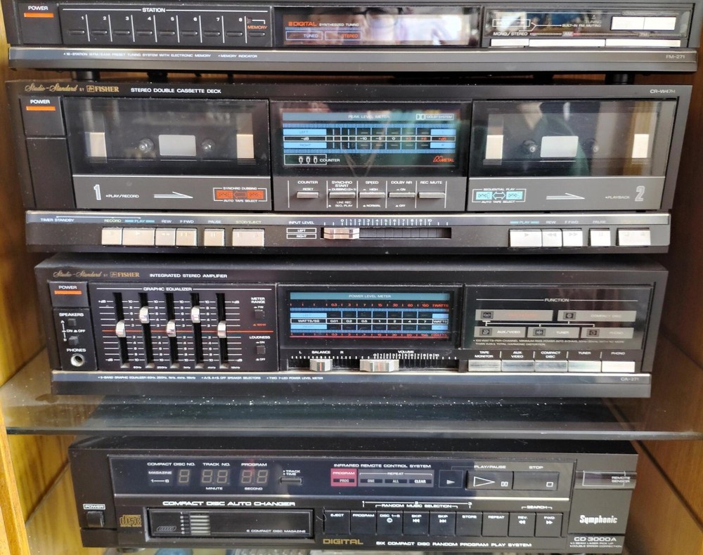 The Fisher Stereo System 8531 includes a Symphonic 6-CD changer, offering a variety of playable media formats like CDs, record player, and cassette tapes. This cassette player and recorder features a black color design with AM/FM bands, an amplifier, and stereo L/R RCA audio outputs. The system comes with two speakers and has a CD changer capacity of 6 discs, providing a comprehensive audio experience for home entertainment.