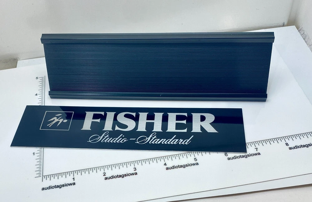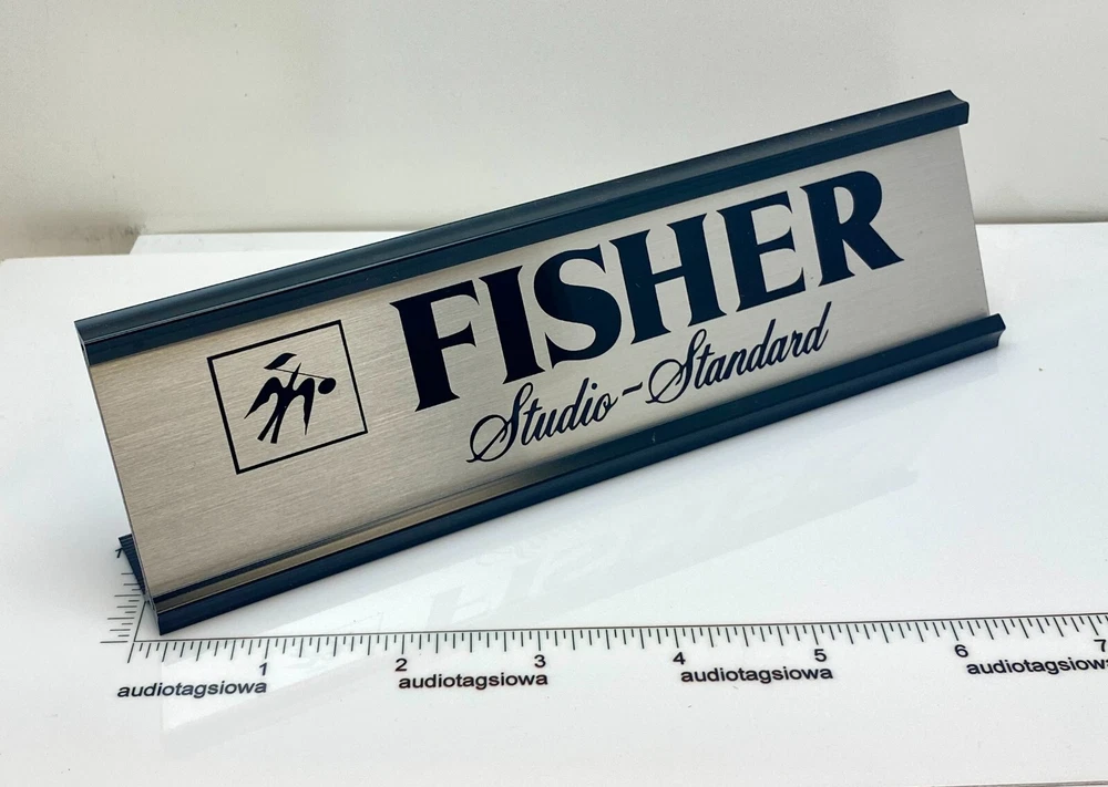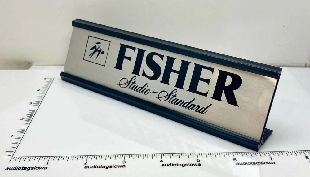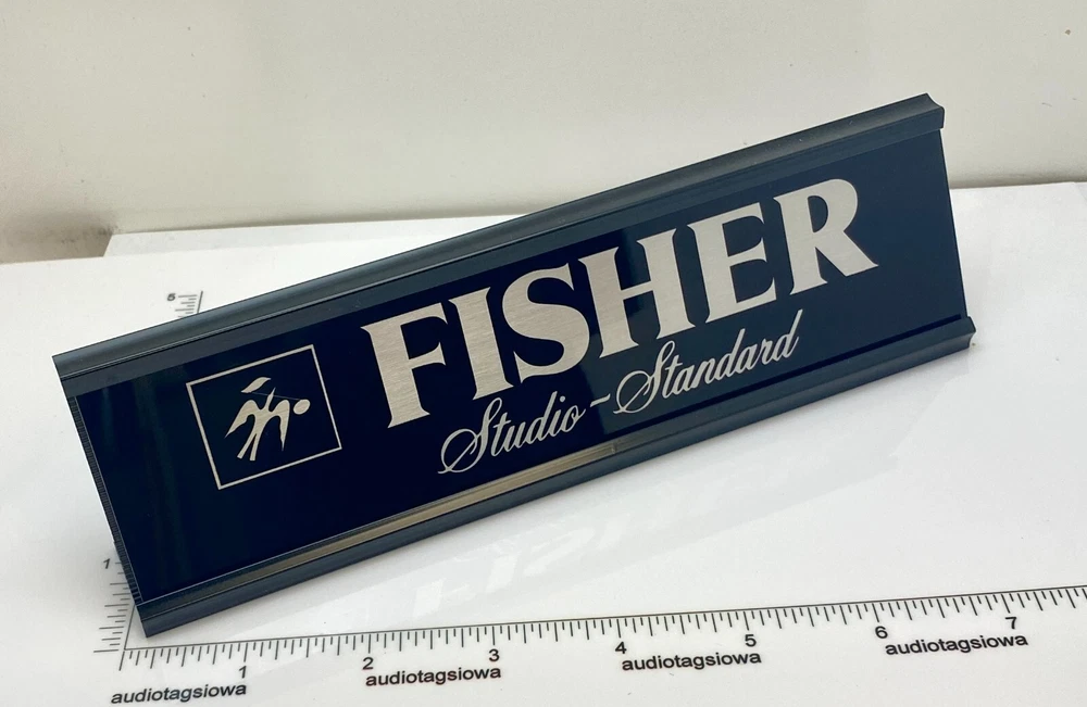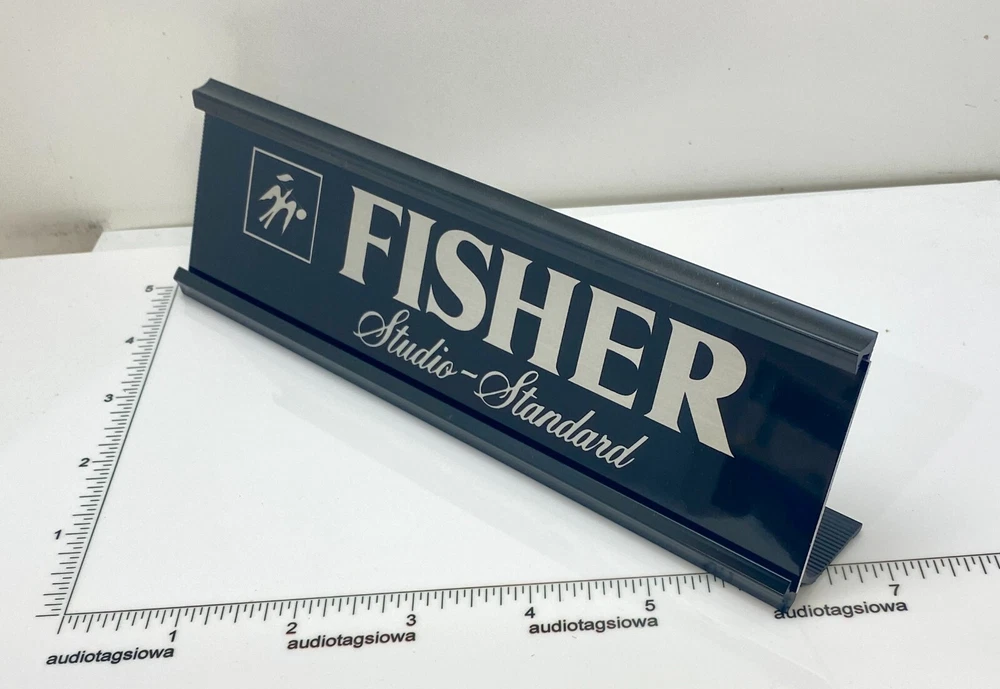 Custom made Fisher Studio-Standard desk stand / sign. All made from aluminum the base is matte black aluminum standing 2" tall, 8" long and 1" deep. The separate insert portion is sublimated .02" thick aluminum in gloss silver with black letters on a silver background on one side and silver letters on a black background on the other side. The insert, measuring 8" x 2", is removable from the base and reversible. Domestic shipping will be by USPS. International shipping will be using eBay's International Shipping.