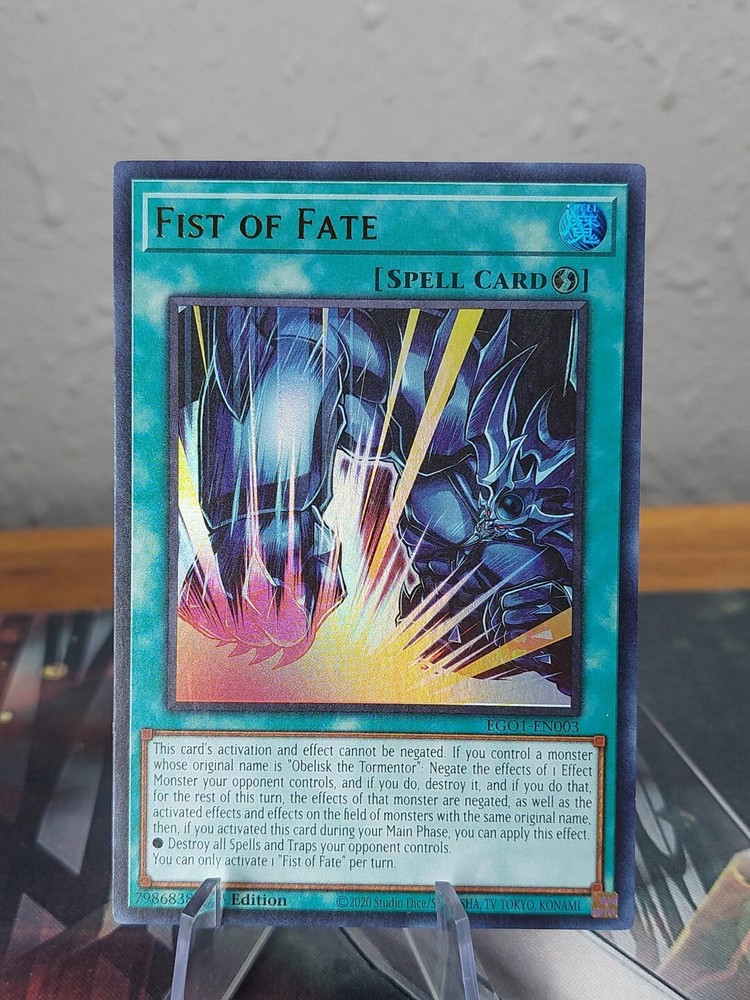 Experience the might of "Fist of Fate - EGO1-EN003," a standout addition to any YuGiOh! collection. This Ultra Rare card from the Egyptian God Deck Obelisk the Tormentor (EGO1) set is a must-have for enthusiasts seeking to bolster their deck with powerful character synergy and a touch of rarity. The card features the iconic 'Ego' character and comes as a sought-after 1st Edition, making it a prized possession for collectors and players alike. Whether you're looking to enhance your gameplay or treasure a unique piece of YuGiOh! artistry, "Fist of Fate" is a strategic choice for your collection.