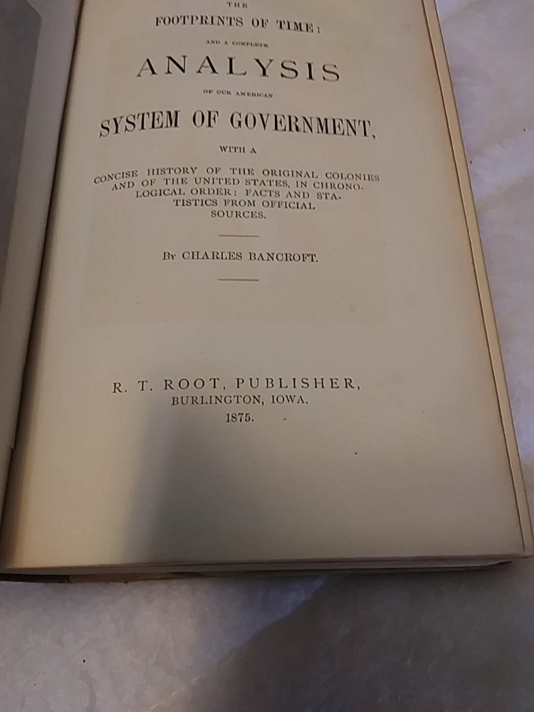 The Footprints of Time : And a Complete Analysis of Our American System of Government, with a Concise History of the Original Colonies and of the United States ... Charles Bancroft leather bound hardcover 10x8" 734 pp published by R. T. Root Burlington, Iowa 1875