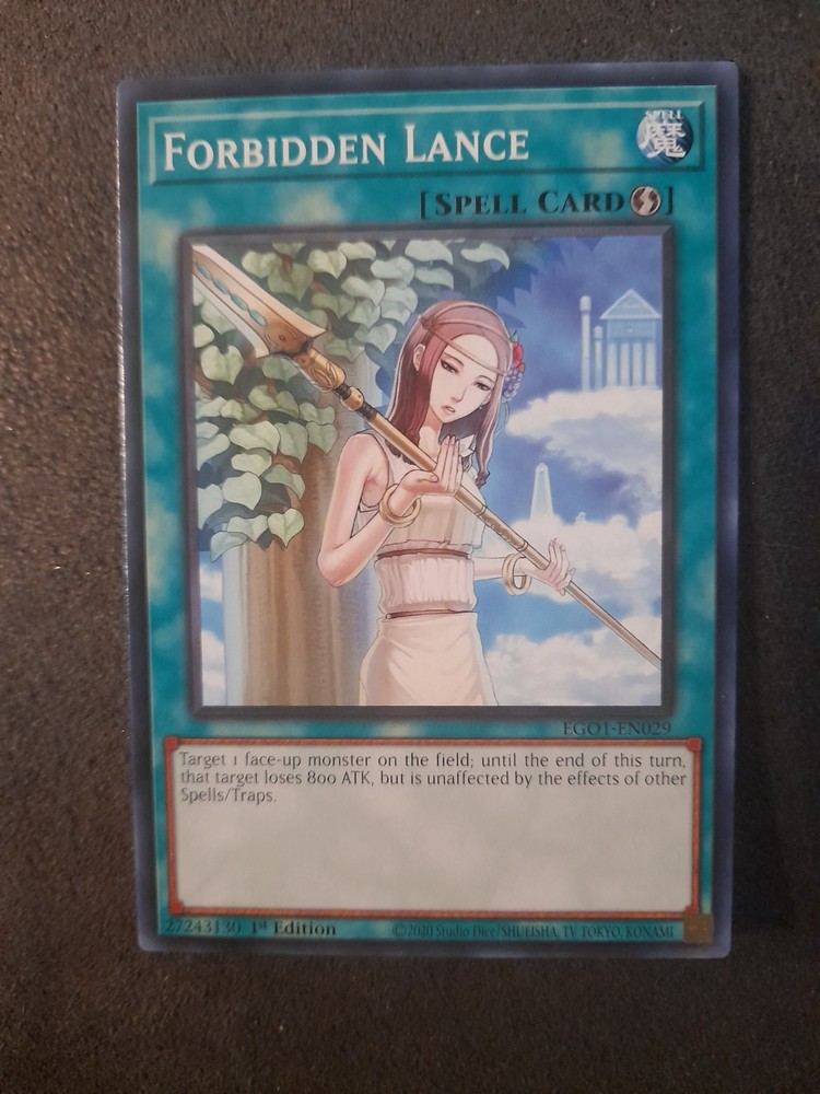 The Forbidden Lance EGO1-EN029 Egyptian God Deck: Obelisk the Tormentor 1st Edition card is a rare and sought-after collectible in the Yu-Gi-Oh! TCG. Manufactured by Konami in 2021, this spell card features the character Ego and belongs to the Egyptian God Deck set. With a Standard card size and made of durable card stock, this common/short print card offers players a unique and powerful addition to their deck. The card's regular finish and 1st edition status add to its appeal, making it a valuable addition to any collector's card collection.