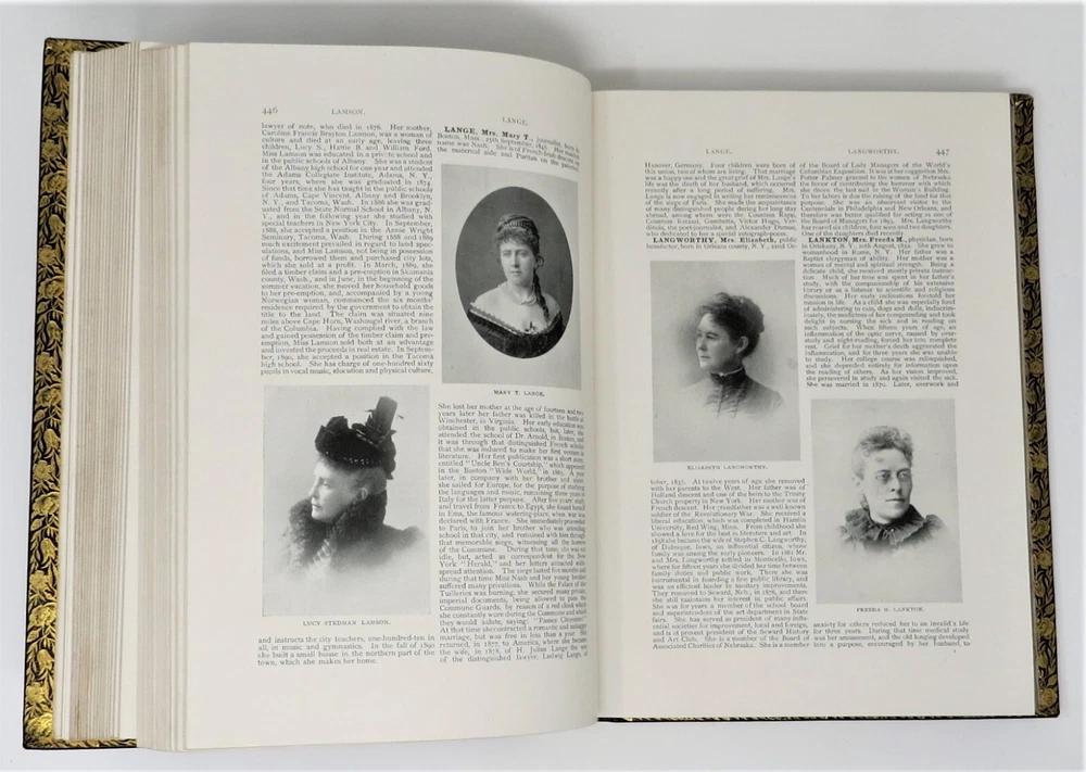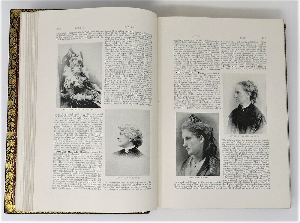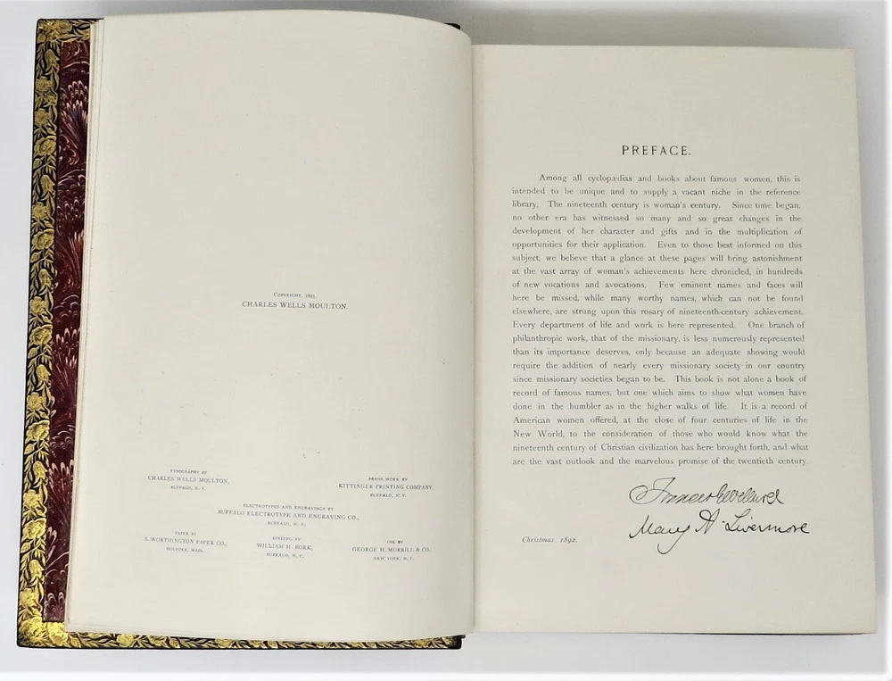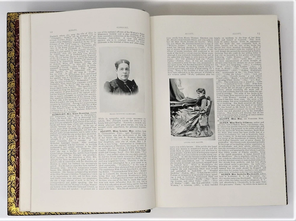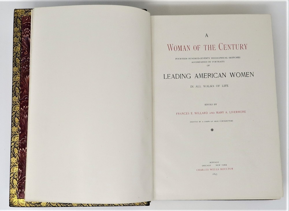 A Woman of the Century: Fourteen Hundred-Seventy Biographical Sketches Accompanied by Portraits of Leading American Women in All Walks of Life Edited by Frances E. Willard and Mary A. Livermore Buffalo: Charles Wells Moulton, 1893. First Edition. 8.5 x 11 3/8 inches. 812 pp. Leather with gilt lettering, gilt edges, marbled end papers with floral/leaf gilt border to pastedowns. Profusely illustrated with black and white portraits of women. Leather covers are clean with light edge and corner wear, light scratches to back cover, gilt is bright, binding is solid, pages are clean and bright, title page feels a little loose but is secure in binding. This is a biographical encyclopedia of notable American women of the 19 th Century, with black and white photos included with many of the entries. The 1470 entries include not just who that were, but what they did. This large volume was edited by women’s rights activists Frances E. Willard and Mary A. Livermore. This is a beautiful volume because it not only captures the lives of well-known women such as Louisa May Alcott and Elizabeth Cady Stanton, but hundreds of now lesser-known women, preserving details about their lives and accomplishments.
