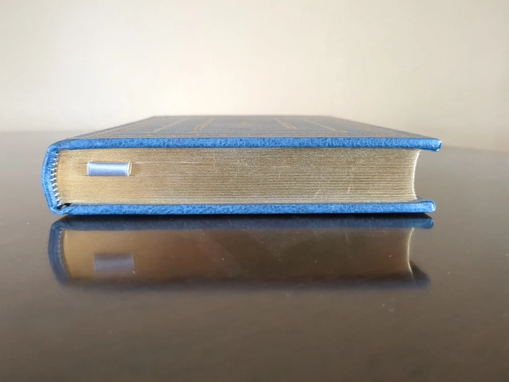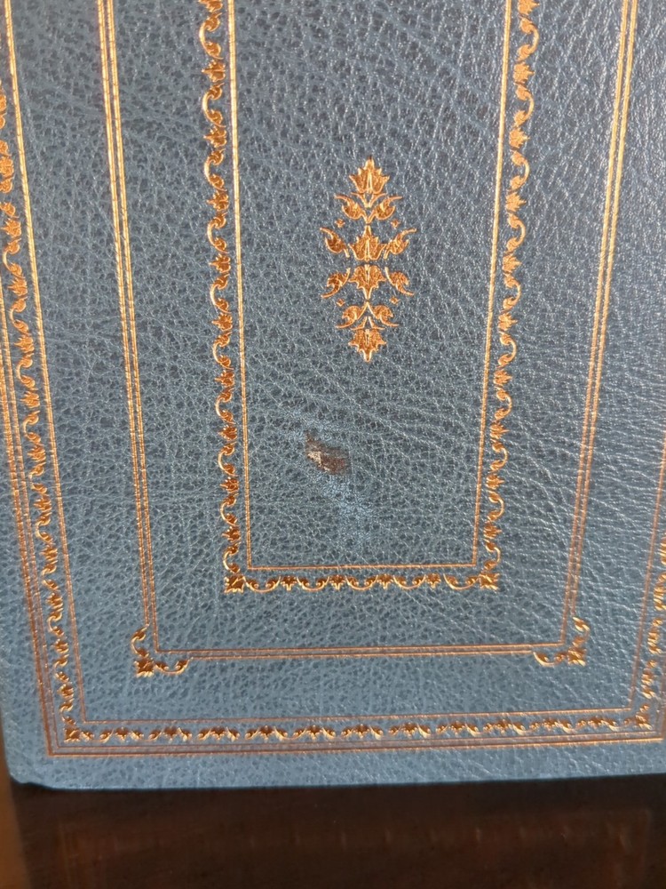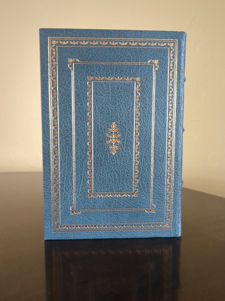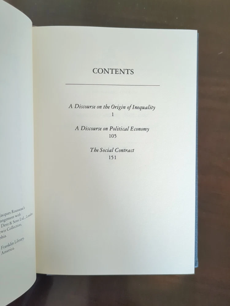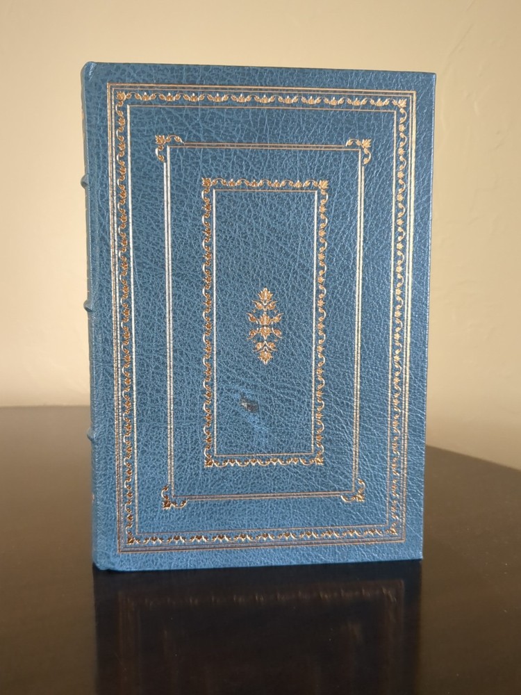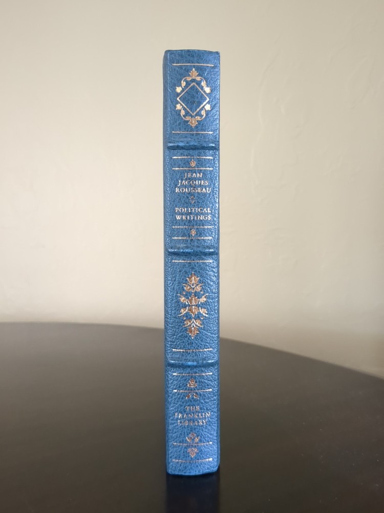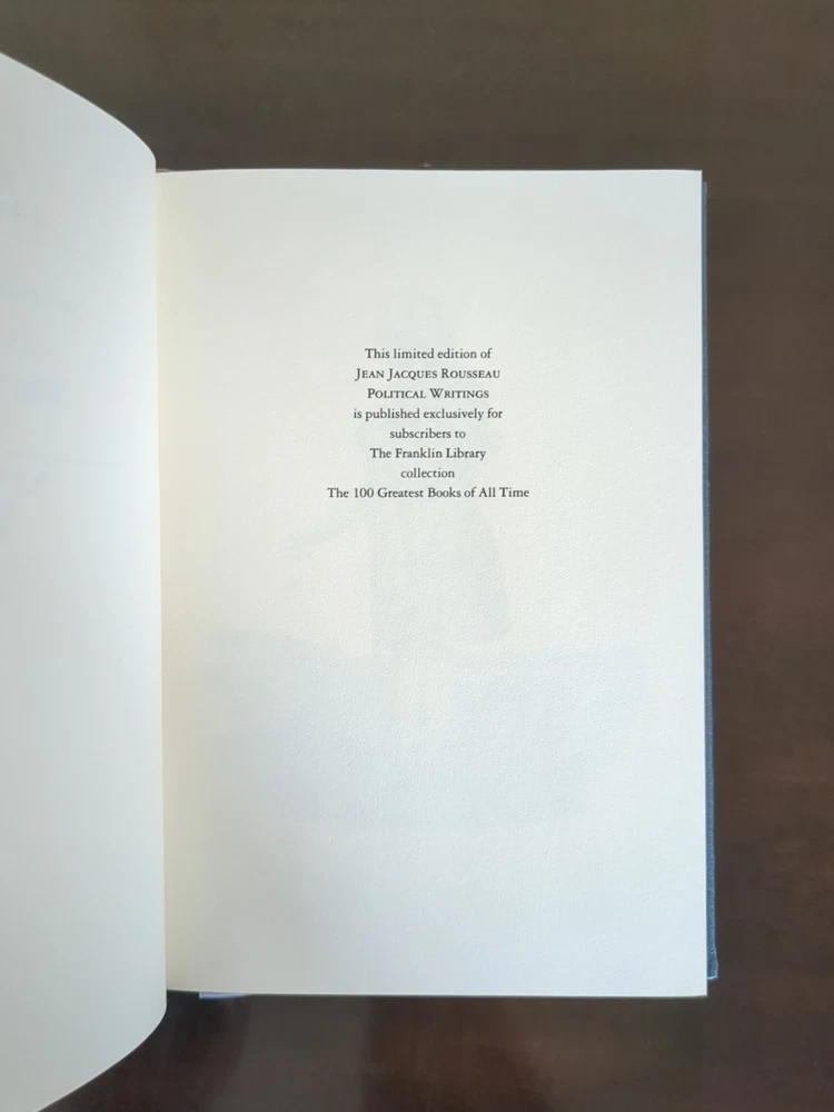 Political Writings of Jean Jacques Rousseau as part of the 100 Greatest Books of All Time Collection by Franklin Library. Leather bound with gold gilt page ends, silk moire end pages and silk marker ribbon. See pictures for details. Note that there is a small black smudge on the front board.