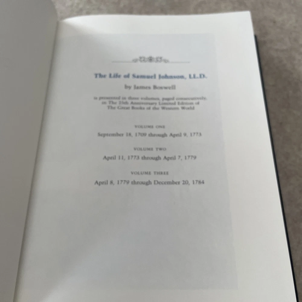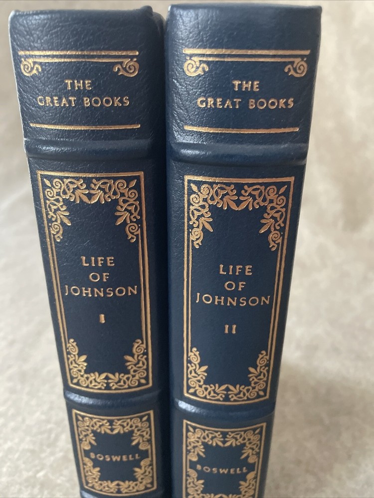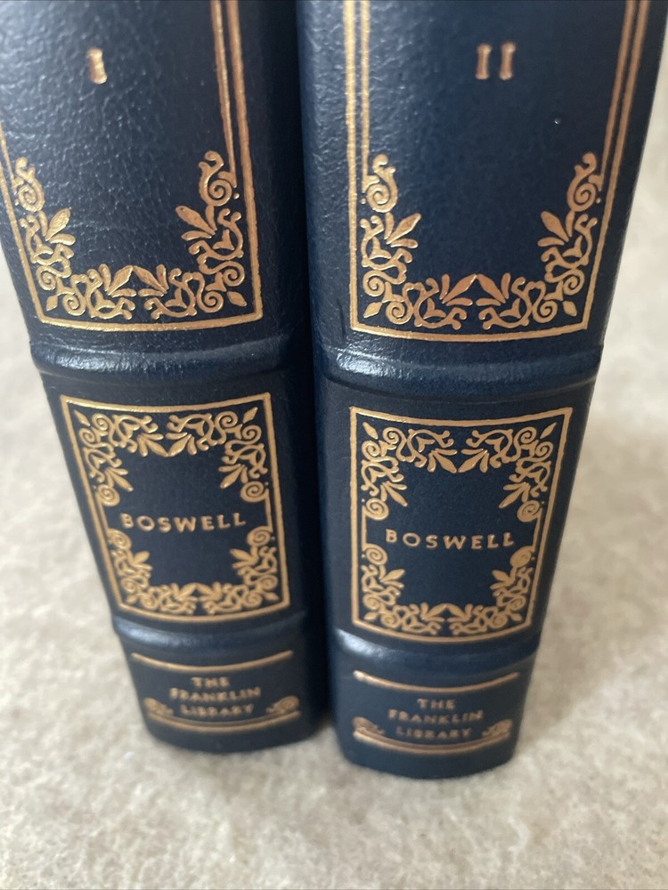 Franklin Library 25th Anniversary Edition of the Great Books of the Western World The Life of Samuel Johnson by James Boswell - Volumes 1 and 2 ONLY (Vol 3 is not present) There are no bookplates in the books. These books are in near mint condition with a couple of bumps on the edge of the front cover of volume 1 and some wear to various corners. See photos. The gold on the covers looks like new. The end pages show no fading. The gilt on the edge of the pages is in very good condition with a few light scratches on both and gilt loss to the top of volume 2. Please see photos. We try to describe as accurately as possible so you will be satisfied with your purchase. We have more books from this set on eBay and we would be happy to combine on shipping to save you money. All books are sent with insurance via USPS Media Mail.