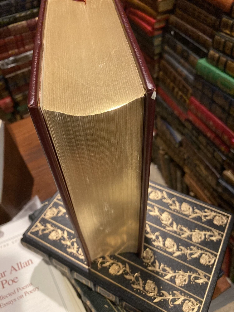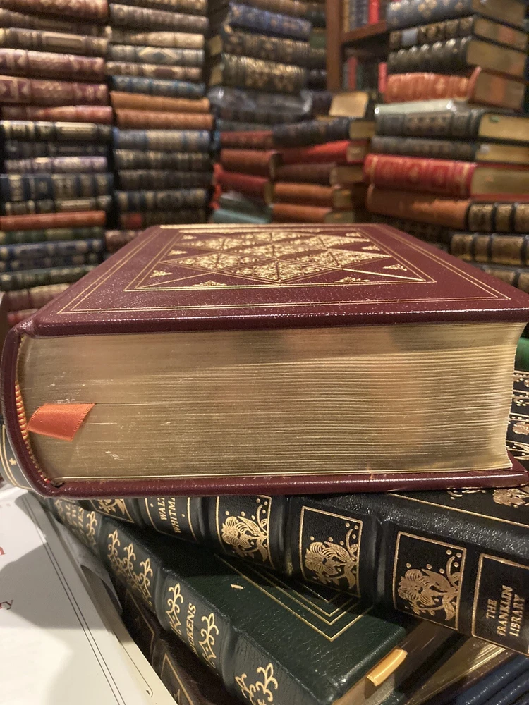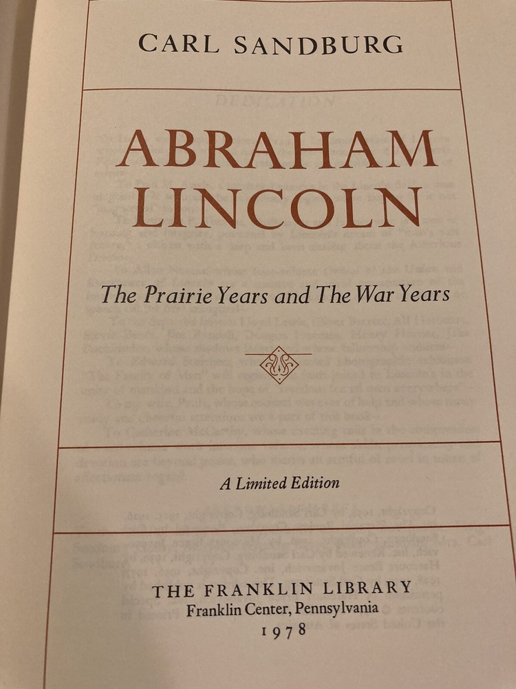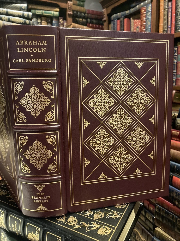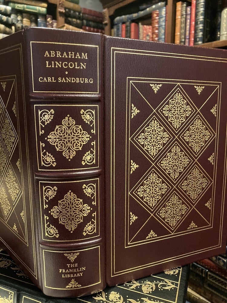 Franklin Library leather edition of Carl Sandburg's "Abraham Lincoln: The Prairie Years and The War Years," a Limited edition, Illustrated with period photographs, one of the 100 GREATEST MASTERPIECES OF AMERICAN LITERATURE series, published in 1978. Bound in brown leather, the book has burgundy moire silk end leaves, acid-free paper, Symth-sewn binding, hubbed spine, gold gilding on three edges, a satin book marker---in near FINE condition . Abraham Lincoln, who lived from 1809-1865, was born in a log cabin in KENTUCKY to illiterate and frontier parents. After navigating a flatboat to New Orleans, Lincoln returned to NEW SALEM, ILLINOIS, where he did various jobs while studying law. Lincoln was a volunteer in the BLACK HAWK WAR and later served in the Illinois State Legislature, 1831-37. He courted and married MARY TODD LINCOLN and was elected PRESIDENT of the U.S. in 1860. Lincoln never served a day in President's office when the country was not engaged in the bitter CIVIL WAR. Sandburg wrote: "Perhaps no other American held so definitely in himself both those elements---the genius of the Tragic---the spirit of the Comic. The fate of man, his burdens and crosses, the pity of circumstance, the extent of tragedy in human life, these stood forth in word shadows of the Lincoln utterance. . . And in contrast he came to be known nevertheless as the first authentic humorist to occupy the Executive Manion in Washington, his gift of laughter and his flair for the funny being taken as a national belonging." Sandburg covers JEFFERSON DAVIS, a Mississippi cotton farmer, West Point graduate, Black Hawk Lieutenant, Mexican War veteran, U.S. Senator, Secretary of War under the Pierce Administration, orator, horseman, and man of fate. Lincoln's army of 75,000 volunteers Davis called a "posse comitatus" to round up 5,000,000 outlaws. . ." Davis was chosen to head the 11 states that had committed to him against 23 states formally still in the Union with Lincoln. Often considered the "definitive biography of President Lincoln," this volume won the PULITZER PRIZE for History. 1086 pages, including Sources and Bibliography and an Index. I offer Combined shipping.