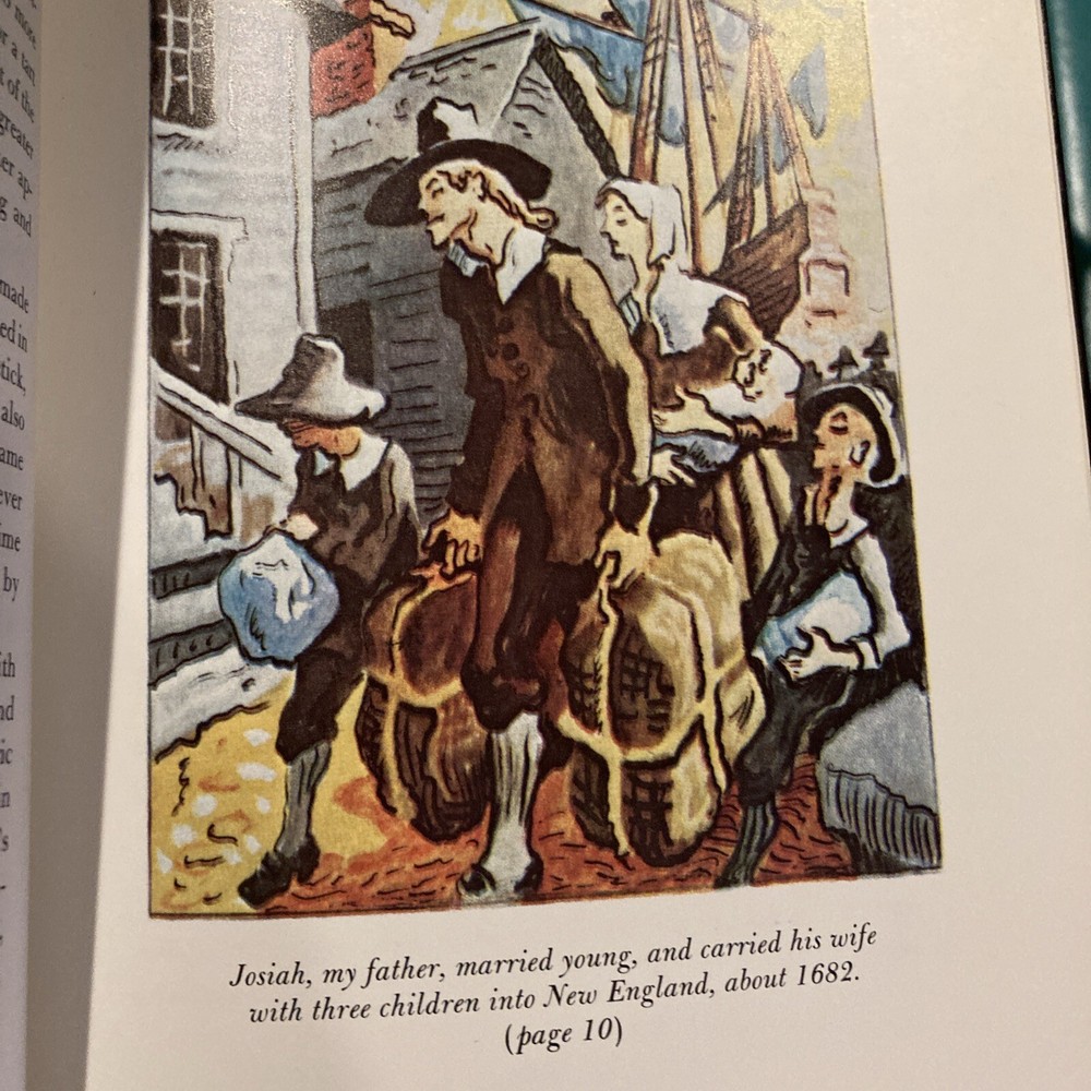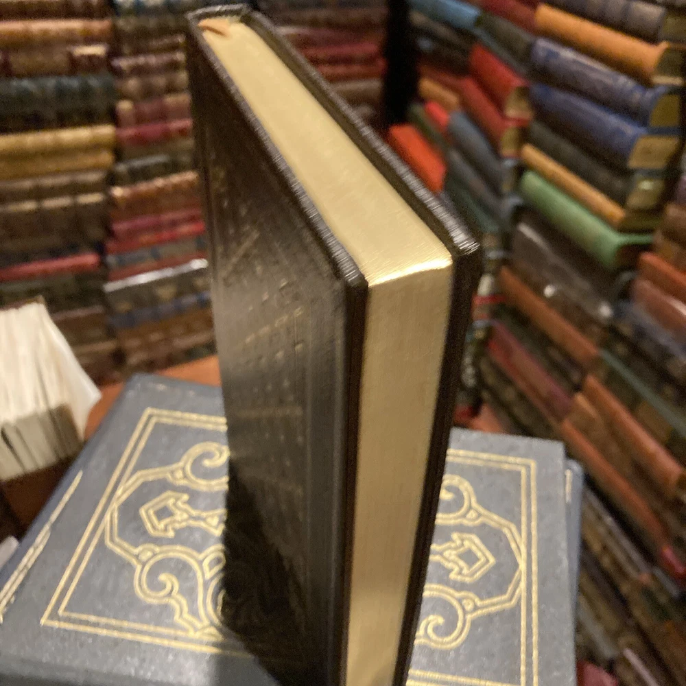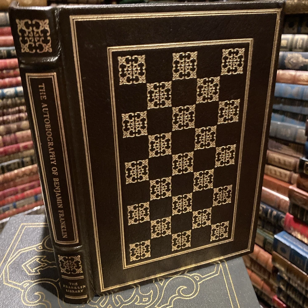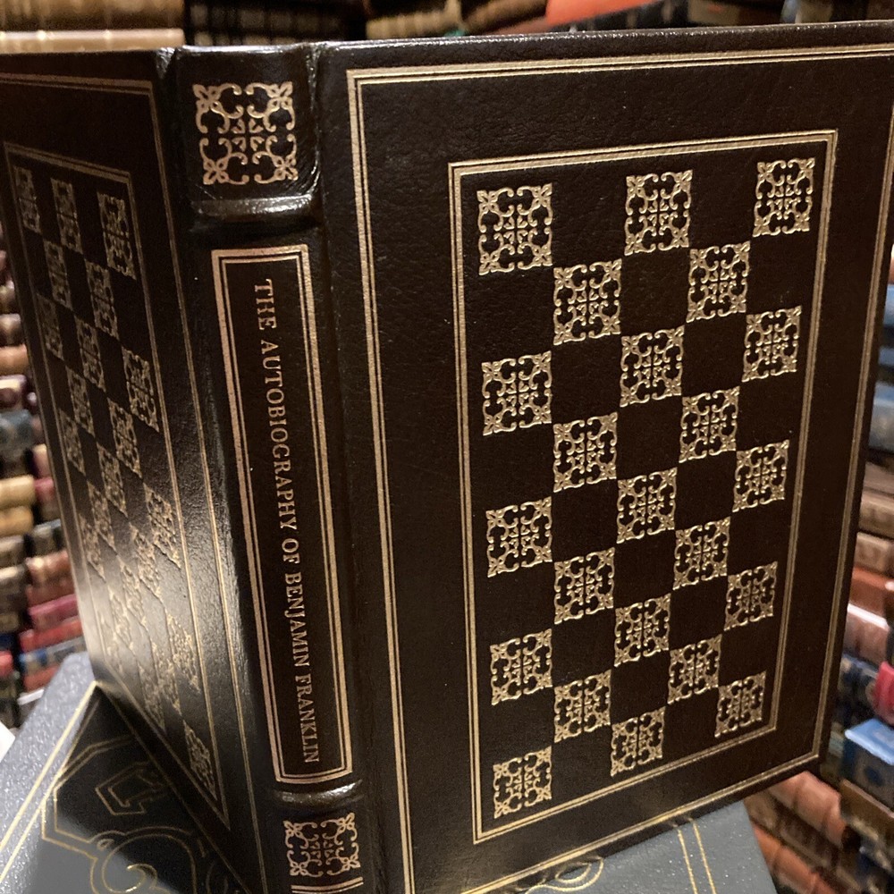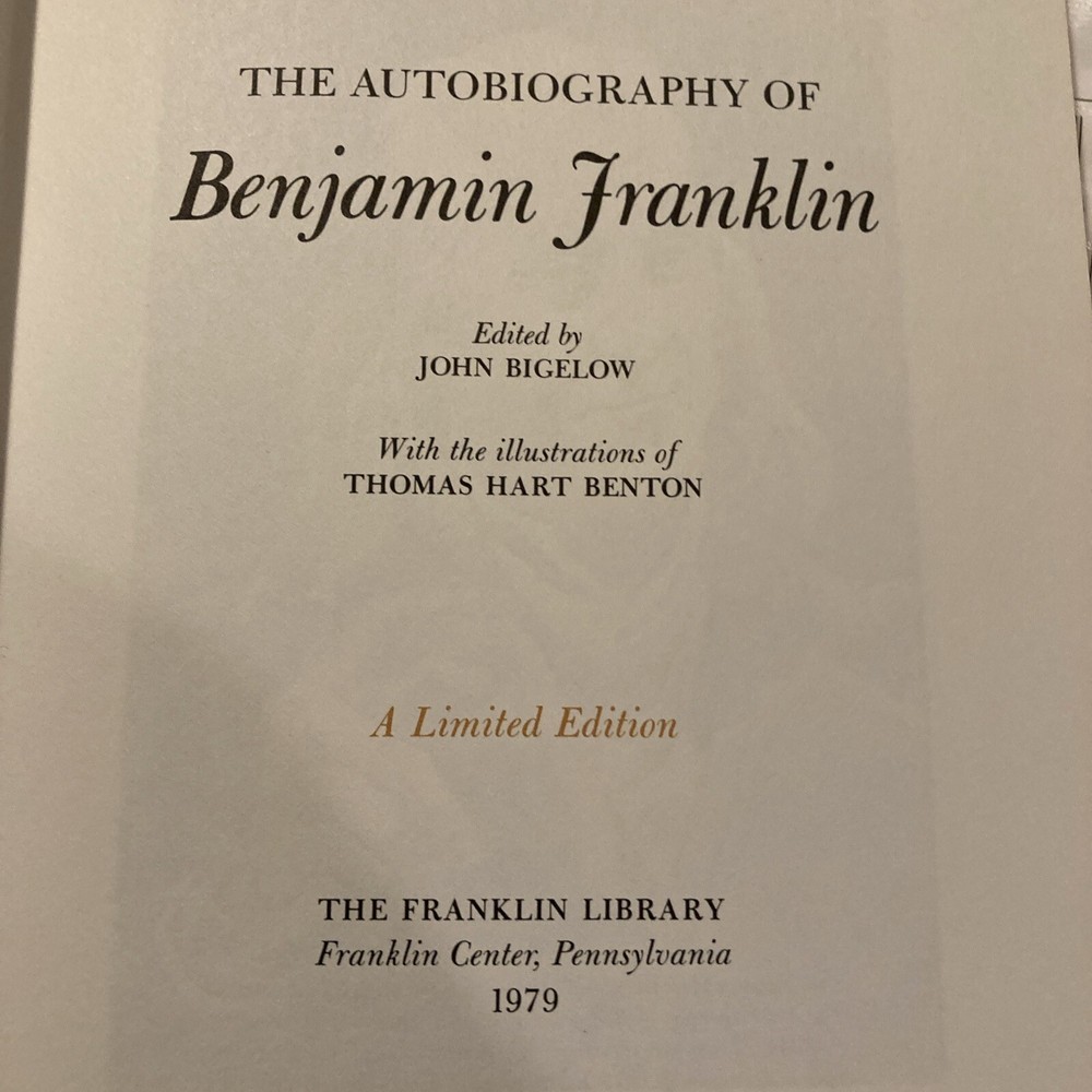 Franklin Library leather edition of "The Autobiography of Benjamin Franklin," a Limited edition, Edited by John Bigelow, Illustrated by THOMAS HART BENTON, one of the 100 GREATEST BOOKS OF ALL TIME series, published in 1979. Bound in hunter green leather, the book has gold French moire silk end leaves, acid-free paper, symth-sewn binding, hubbed spine, acid-free paper, a satin book marker, Symth-sewn binding, gold gilding on three edges---in Near FINE condition---except for a 'lightly tipped' upper front corner. Benjamin Franklin, who lived from 1796-1790, was an American polymath who was active as a writer, scientist, inventor, statesman, diplomat, printer, publisher, and political philosopher. Among the leading intellectuals of his time, Franklin was one of the FOUNDING FATHERS, a drafter and signer of the DECLARATION of INDEPENDENCE, and the first Postmaster General. As an inventor, he is known for the lightening rod, bifocals, and the Franklin stove. He founded many civic organizations, including the Library Company, Philadelphia's first fire department, and the University of Pennsylvania. As the first U.S. Ambassador to France, he exemplified the emerging American nation. Franklin was an advocate for thrift, hard work, education, community spirit, self-governing institutions, and was opposed to authoritarianism both political and religious. Franklin had a rather "open marriage" and fathered a son out of wedlock but his wife raised the boy. She stayed in Philadelphia while he resided in France. 228 pages----the THOMAS HART BENTON illustrations are GORGEOUS! I offer combined shipping.