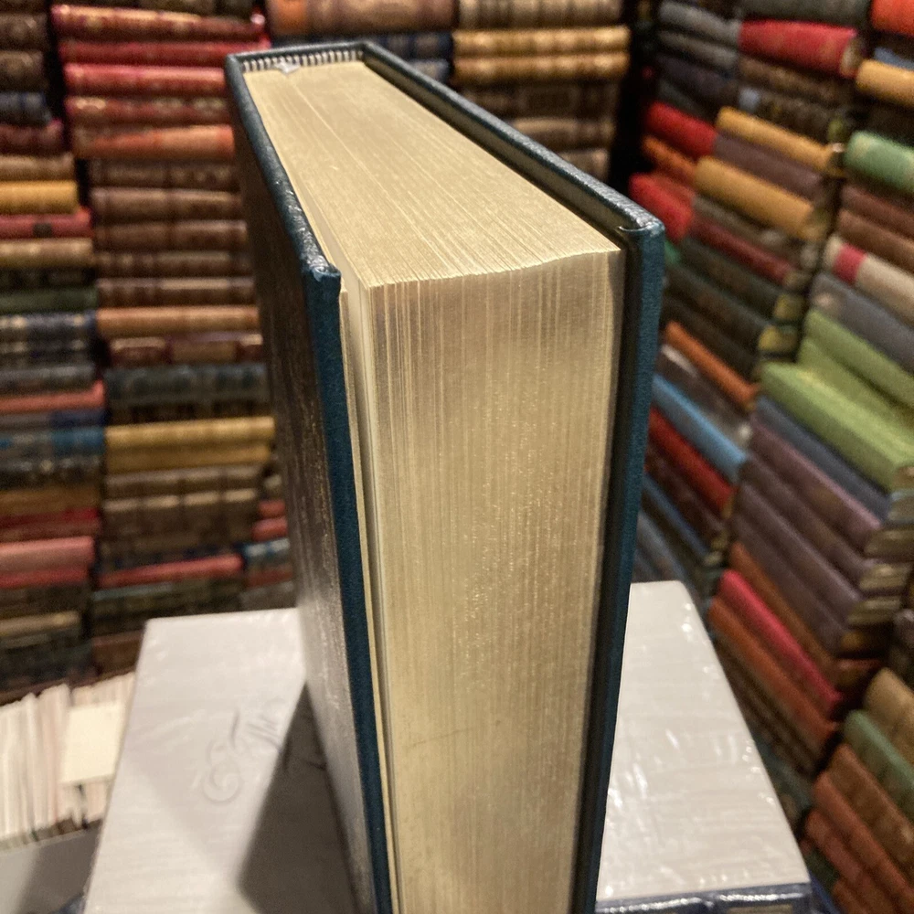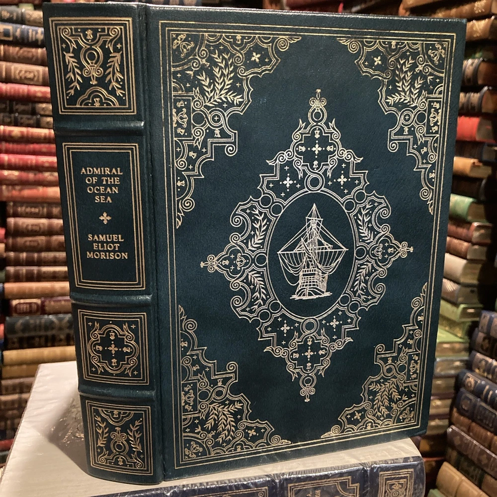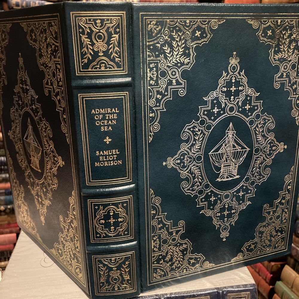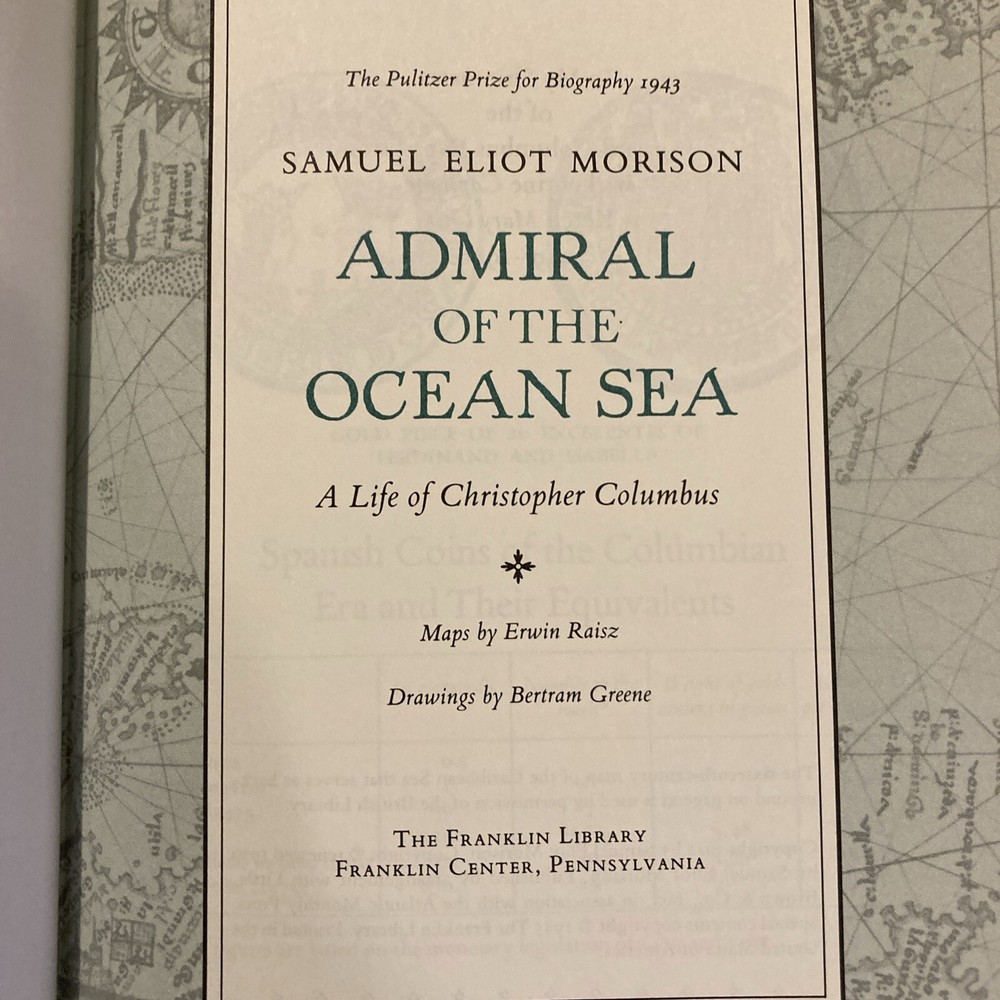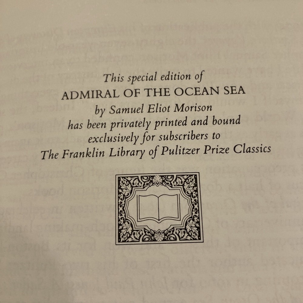 Franklin Library leather edition of Samuel Eliot Morison's "Admiral of the Ocean Sea: A Life of Christopher Columbus," a Limited edition, one of the PULITZER PRIZE for BIOGRAPHY series, published in 1985. Bound in hunter green leather, the book has marbled paper end leaves, acid-free paper, Symth-sewn binding, a satin book marker, hubbed spine, gold gilding on three edges---in near FINE condition. Christopher Columbus, who lived from 1446-1506, was born in Genoa, Italy. Columbus was tall and well built with a ruddy complexion and red hair, a thick hairy chest, a long face, and manly physique. He was influenced toward ocean exploration by his older brother, Bartholomew, an expert chart maker. Columbus married Dona Felipa in 1479 and a son was born in 1480. Dona Felipa was the daughter of D. Bartholomew Perestrello, a noble family that had emigrated from Lisbon. The marriage surprised some because they wondered how a man of low birth could marry into one of the noble families. Dona Felipa died before Columbus left for Portugal in 1485. By age 30, Columbus was an experienced seaman and trusted factor, having business connections with one of the leading merchant-banker houses of Italy. Columbus later lived with Beatriz Enrique de Harana from Cordova and they became parents to Ferdinand Columbus, who at age 10 was appointed a page to the Queen; between the ages of twelve and sixteen he accompanied his father on the Fourth Voyage. He later led the life of a scholar, collector, traveler and man of letters. He accumulated a large and splendid library which numbered over 15,000 volumes before his death in 1539. After repeated rebuffs at the Portuguese and Spanish courts, Columbus received the aid of King Ferdinand and Queen Isabella of Spain, and set sail in August 1492 with three small ships, the SANTA MARIA, NINA, and PINTA. He landed in the Bahamas on October 12 at an island that he named San Salvador. After discovering Cuba and Hispaniola (Haiti), he returned to Spain. For these discoveries he was made 'admiral of the ocean' and governor-general of all new lands. On his second voyage in 1493, his discoveries included the Leeward Islands, St. Christopher, and Puerto Rico. On the third expedition in 1498, he discovered Trinidad and the mouth of the Orinoco. In 1502 he left Spain for a fourth time, in the hope of sailing past his discovered islands to Marco Polo's Cathay, for which he had constantly searched. This expedition suffered terrible hardships, and he was forced to abandon his plans and return to Spain, where he was discredited. Morison wrote: "Command of a tall and gallant ship speeding over blue water before a fresh trade wind, shaping her course for some new and marvelous land where gold is abundant and the women are kind, is a mariner's dream of the good life. Columbus had a Hellenic sense of wonder at the new and strange, combined with an artist's appreciation of natural beauty. Waste no pity on the Admiral of the Ocean Sea! He enjoyed long stretches of pure delight such as only a seaman may know, and moments of high, proud exultation that only a discoverer can experience." Samuel Eliot Morison, who was born in 1887, was a professor of history at HARVARD and editor of The New England Quarterly. Morison was the Navy's official historian during World War II and wrote 14 volumes. Morison says that Christopher Columbus did "more to direct the course of history than any individual since Augustus Caesar." 688 pages---including an Index. I offer combined shipping.