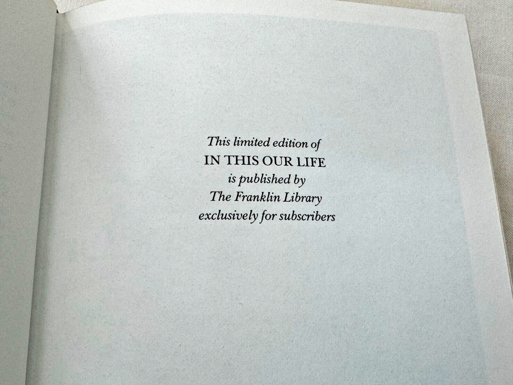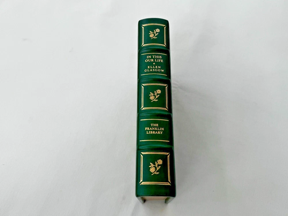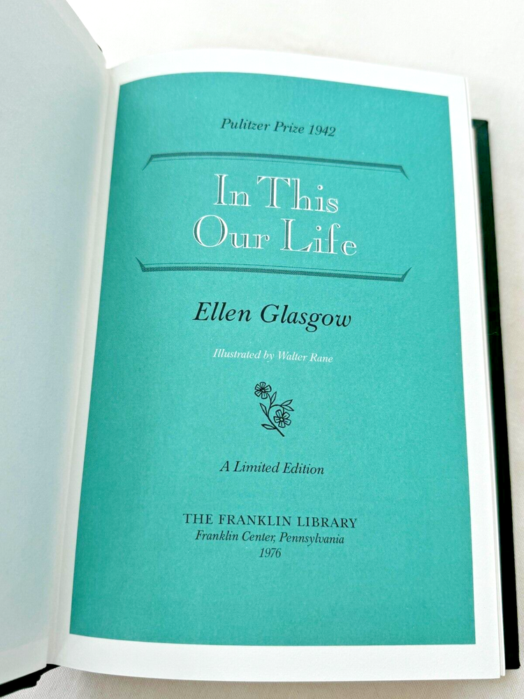From the Franklin Library of Pulitzer Prize Classics... In This Our Life by Ellen Glasgox Illustrated by Walter Rane Copyright 1976 by The Franklin Library Bound in Premium Full Leather This volume contains all of these classic Franklin Library trimmings: Premium Leather Binding Silk moire Endleaves Distinctive Cover Design Hubbed Spine, Accented in Gold Satin Ribbon Page Marker Gilded Page Edges Long-lasting, High Quality Acid-neutral Paper Beautiful Illustrations DESCRIPTION A very scarce title in any condition, this 1976 First Edition is in near Fine and Unread condition. The front and back covers are in near Fine condition showing only light wear on the back cover and the gilded page edges show only very light wear! There are no markings, bookplates, or other signs of prior ownership in this book. This Pulitzer Prize Edition was published by The Franklin Library and would be a beautiful addition to your Franklin Library book collection. Overall, this copy is a grade collector's book. This book is very elusive in this superior condition, as only a limited number of them were ever published, so now is the time to act. Hopefully you can add this book to your collection and enjoy it in the years to come... SHIPPING POLICY We take great care packaging every item to ensure safe shipment to you. Items are packaged using plenty of bubble wrap and packaged securely in a sturdy box. Our secure shipping methods have resulted in zero damaged items in over 15 years! Items are shipped out within 1 - 3 days of payment being received. RETURN & REFUND POLICY We accept refunds within 30 days of purchase. If you are not 100% satisfied with your purchase, please contact us about a refund, or initiate a refund through eBay. CONTACT US We are committed to providing our customers with the best possible on-line shopping experience. This includes a commitment to excellent customer service, before you purchase as well as after your order has been delivered. Please feel free to submit any questions or inquiries regarding this item or your order by sending us a message through the eBay messaging system. We will typically respond within 24 hours of receiving your message.