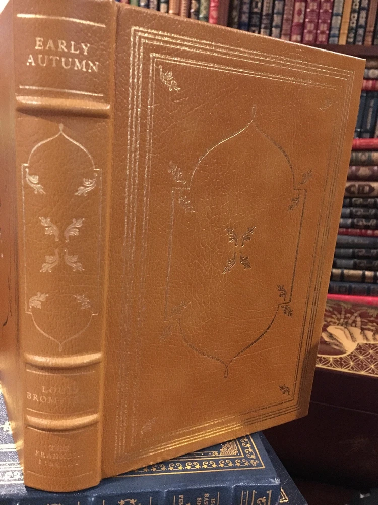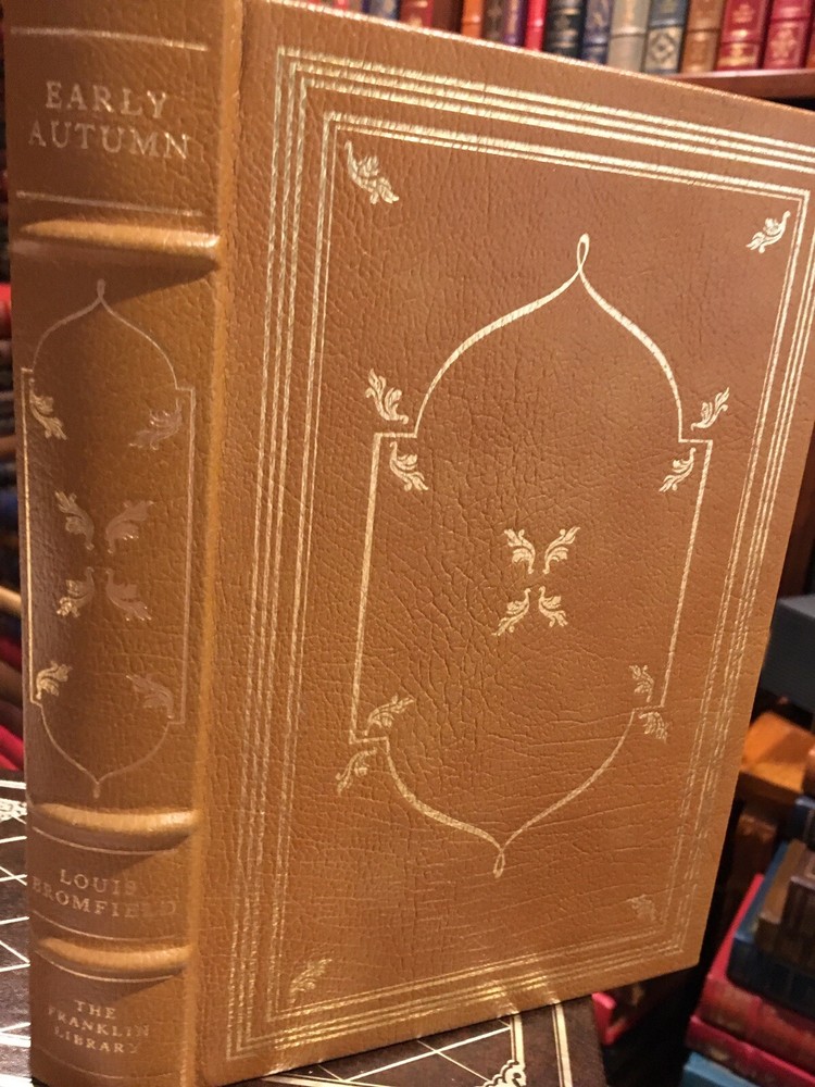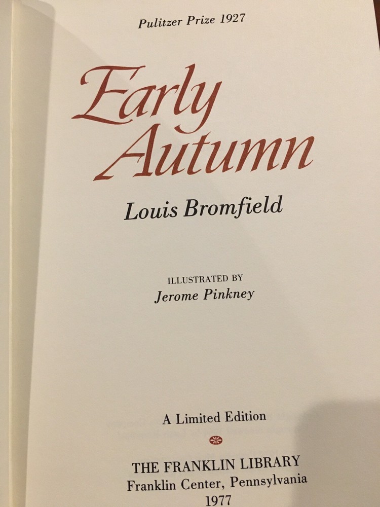 Franklin Library leather edition of Louis Bromfield's "Early Autumn," Illustrated by Jerome Pickney, a Limited edition, one of PULITZER PRIZE series, published in 1977. Bound in camel tan leather, the book has burgundy French moire silk end leaves, a satin book marker, hubbed spine, acid-free paper, Symth-sewn binding, gold gilding on three edges---in near FINE condition. Louis Bromfield, who lived from 1896---1956, was a journalist, expatriate, progressive and accomplished farmer. He studied agriculture at Cornell and journalism at Columbia, drove an ambulance in World War I for the French army, spent many years after the war as an expatriate in France. He lived in India for a short time. In 1939, he returned to Ohio and spent his life experimenting in farming and writing his books. "Early Autumn," published in 1926, was called by The Book man "a dramatic novel and a stinging satire. . .an important book an entertaining one." The novel opens with "a ball in the old Pentland house . . . because a young girl in the family, SYBIL PENTLAND, eighteen years old, is to be introduced to society. . .the house was "all bedizened with lanterns and bunches of late spring flowers, and in the bare, white-painted, dignified hallway a Negro band, hidden discreetly by flowers, sat making noisy, obscene music." 338 pages. I offer Combined shipping.