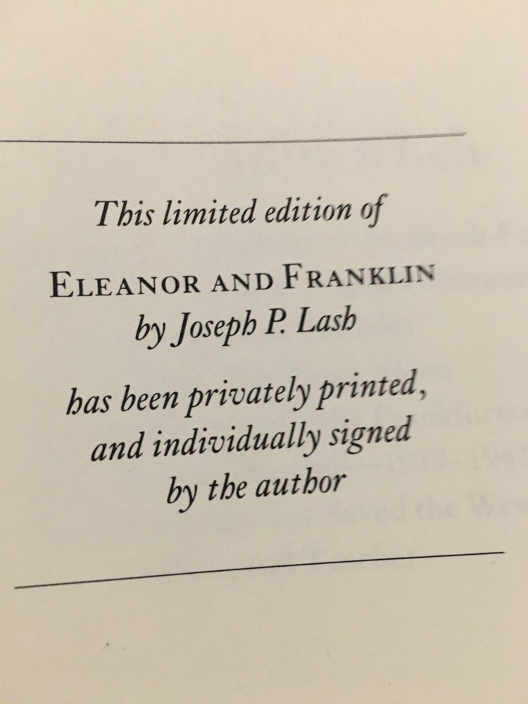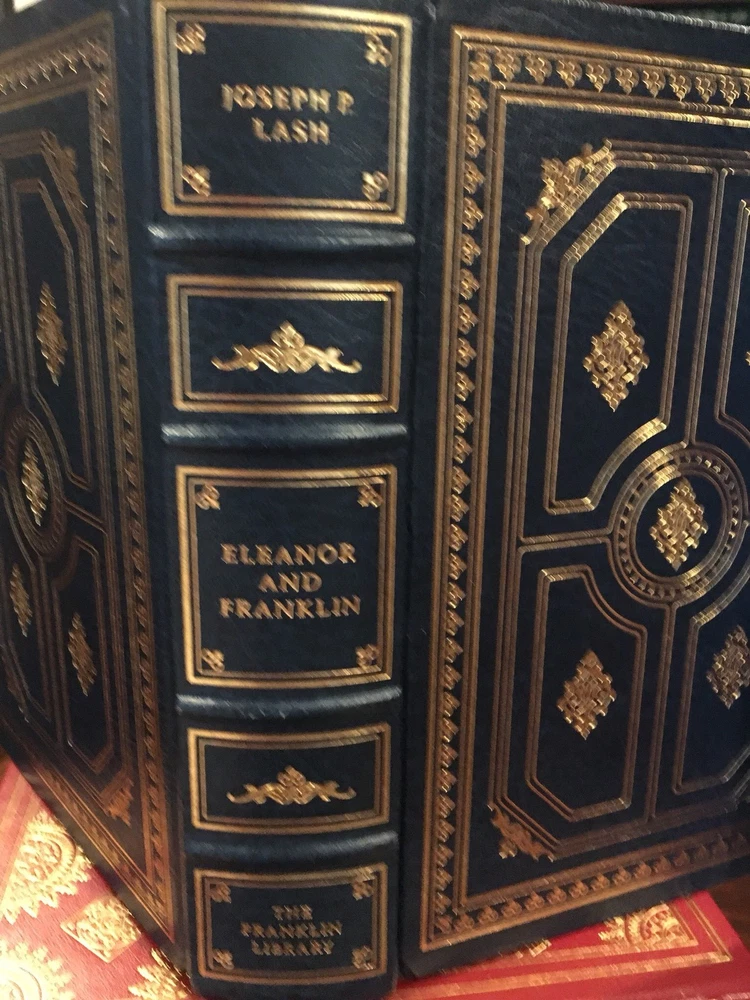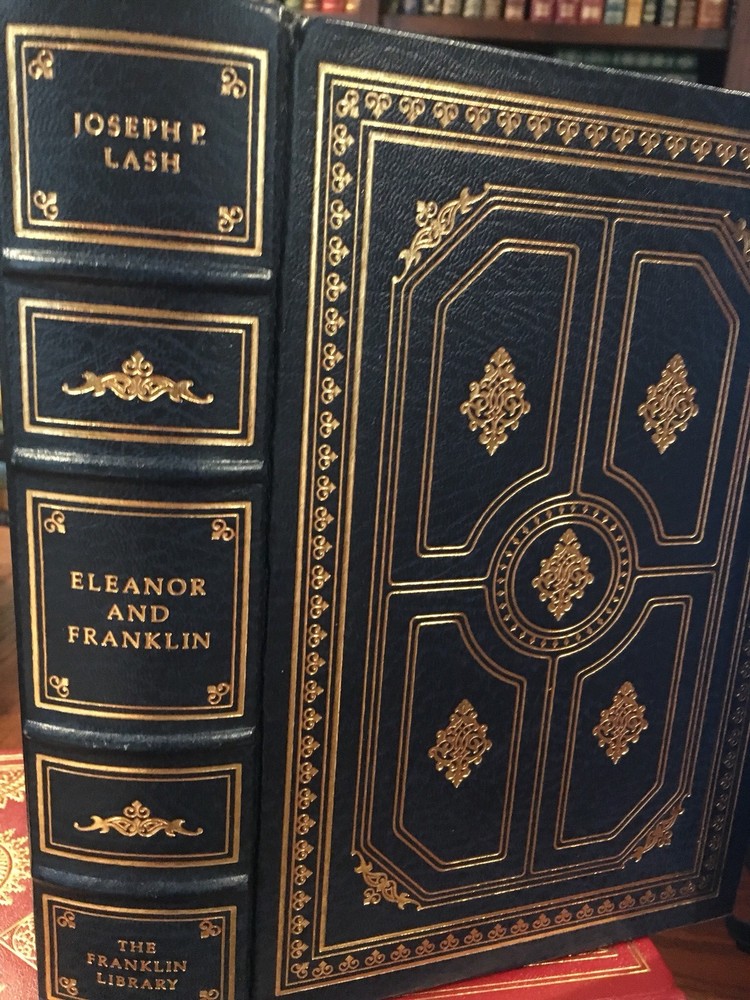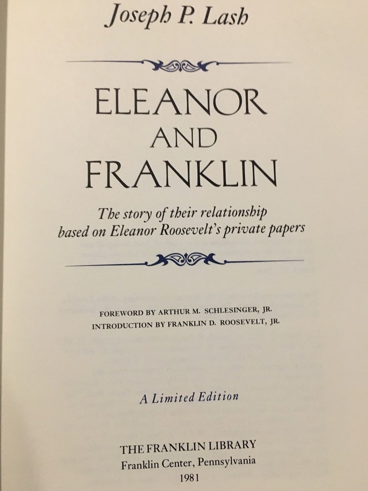 Franklin Library leather edition of Joseph Lash's "Eleanor and Franklin: The Story of their relationship based on Eleanor Roosevelt's private papers," Foreword by Arthur M. Schlesinger, Jr. Introduction by FRANKLIN D. ROOSEVELT, JR., a Limited edition, one of the SIGNED 60 series, PERSONALLY SIGNED by JOSEPH LASH, published in 1981. Bound in navy blue leather, the book has navy blue moire silk end leaves, hubbed spine, acid-free paper, Symth-sewn binding, a satin book marker, gold gilding on three edges---in near FINE condition. Anna Eleanor Roosevelt, who lived from 1884 – 1962, was an American politician, diplomat, and activist. She was the longest-serving First Lady of the U.S., having held the post from March 1933 to April 1945 during her husband President Franklin D. Roosevelt's four terms in office, and served as United States Delegate to the United Nationals General Assembly from 1945 to 1952. President Harry S. Truman later called her the "First Lady of the World" in tribute to her human rights achievements. Roosevelt was a member of the prominent American ROOSEVELT and LIVINGSTON families and a niece of President THEODORE ROOSEVELT. She had an unhappy childhood, having suffered the deaths of both parents and one of her brothers at a young age. At 15, she attended Allenwood Academy in London. Returning to the U.S., she married her fifth cousin once removed, Franklin Delano Roosevelt, in 1905. The Roosevelts' marriage was complicated from the beginning by Franklin's controlling mother, Sara , and after discovering an affair of her husband's with LUCY MERCER in 1918, Roosevelt resolved to seek fulfillment in a public life of her own. She persuaded Franklin to stay in politics after he was stricken with debilitating polio in 1921, which cost him the use of his legs, and Roosevelt began giving speeches and appearing at campaign events in his place. Following Franklin's election as Governor of New York in 1928, and throughout the remainder of Franklin's public career in government, Roosevelt regularly made public appearances on his behalf, and as First Lady while her husband served as President, she significantly reshaped and redefined the role of that office during her own tenure and beyond, for future First Ladies. Though widely respected in her later years, Roosevelt was a controversial First Lady at the time for her outspokenness, particularly her stance on racial issues. She was the first presidential spouse to hold regular press conferences, write a daily newspaper column, write a monthly magazine column, host a weekly radio show, and speak at a national party convention. On a few occasions, she publicly disagreed with her husband's policies. She launched an experimental community at ARTHURDALE, WEST VIRGINIA , for the families of unemployed miners, later widely regarded as a failure. She advocated for expanded roles for women in the workplace, the civil rights of African Americans and Asian Americans, and the rights of World War II refugees. Following her husband's death, Roosevelt remained active in politics for the rest of her life. By the time of her death, Roosevelt was regarded as "one of the most esteemed women in the world"; she was called "the object of almost universal respect" in her New York Times obituary. In 1999, she was ranked ninth in the top ten of Gallup's List of the Most Widely Admired People of the 20th Century. I offer Combined shipping.