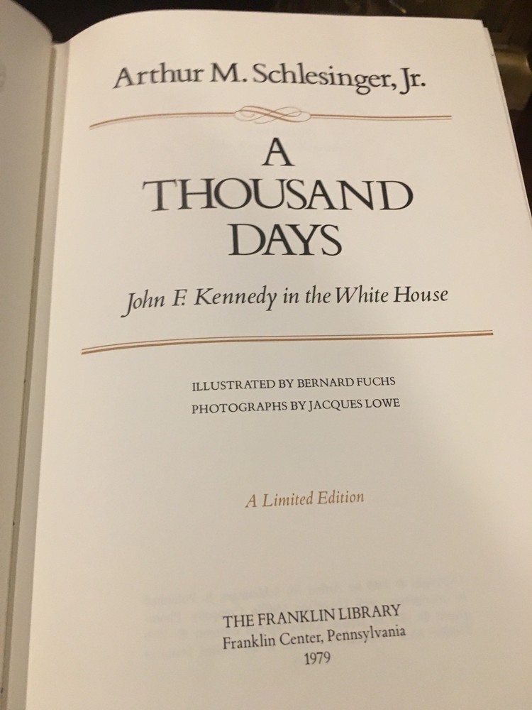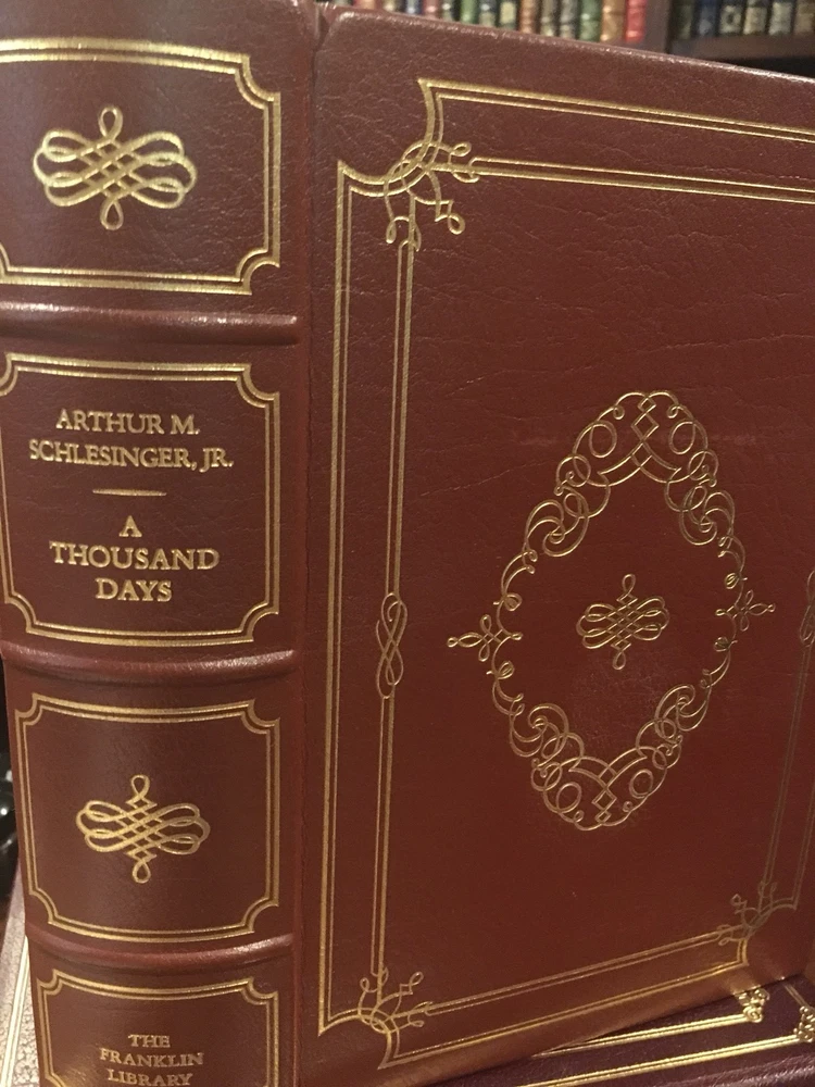 Franklin Library leather edition of Arthur Schlesinger's "A Thousand Days: John F. Kennedy in the White House," a Limited edition, Personally Signed by ARTHUR SCHLESINGER, published in 1979. Bound in a deep camel tan leather, the book has burnt orange French moire silk end leaves, a satin book marker, acid-free paper, Symth-sewn binding, hubbed spine, gold gilding on three edges---in near FINE condition. John Fitzgerald "Jack" Kennedy, who lived from 1917 – 1963, was an American politician who served as the 35th President of the United States from January 1961 until his assassination in November 1963. The CUBAN MISSILE CRISES, the BAG OF PIGS INVASION, the NUCLEAR TEST BAN TREATY, the establishment of the PEACE CORPS, developments in the SPACE RACE, the building of the BERLIN WALL, the CIVIL RIGHTS MOVEMENT, the "New Frontier" domestic program, and abolition of the federal death penalty in the District of Columbia--- all took place during his presidency. Kennedy also avoided any significant increase in the American presence in Vietnam, refusing to commit combat troops and keeping the level of others, mostly military advisors, to only 16,000. JFK graduated from Harvard University. After military service in the U.S. Naval Reserve in World War II, Kennedy represented Massachusetts in the U.S. House of Representative from 1947 to 1953 as a Democrat. Thereafter, he served in the U.S. Senate from that state from 1953 until 1960. Kennedy defeated Vice President and Republican candidate RICHARD NIXON in the 1960 U.S. Presidential Election. At age 43, he was the youngest man to have been elected to the office, and the first person born in the 20th century to serve as president; to date, he has been the only Roman Catholic president. Schlesinger's biography is the "definitive" work and Mrs. Kennedy and the Kennedy family gave exclusive interviews and he had access to papers other writers did not have. 937 pages, including an Index. I offer Combined shipping.