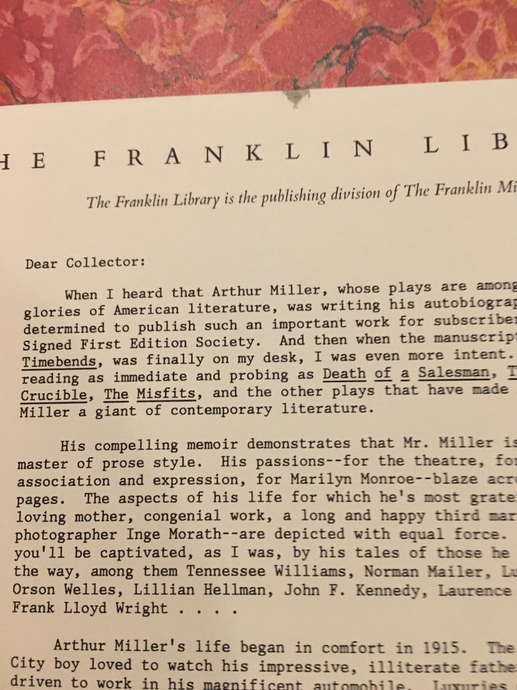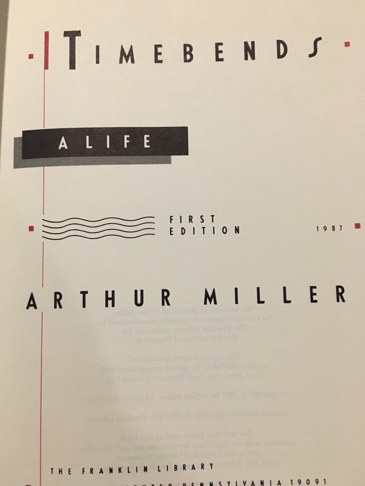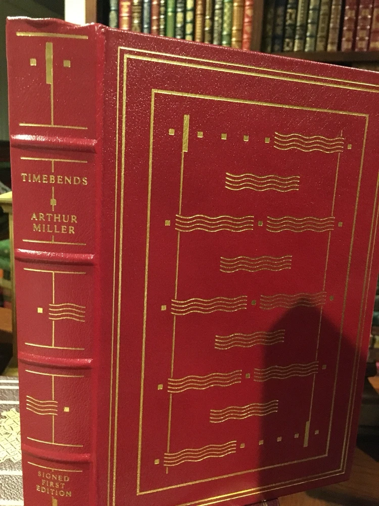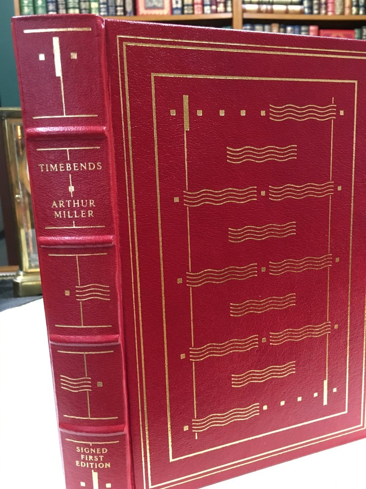 Franklin Library leather edition of Arthur Miller's "Timebends: A Life," Frontispiece Portrait by Christine Bunn, a limited edition, one of the SIGNED FIRST EDITION SOCIETY series, published in 1987. Bound in red leather, the book has decorative paper end leaves, a satin book marker, acid-free paper, Symth-sewn binding, gold gilding on three edges---in near FINE condition. Arthur Asher Miller, who lived from 1915 – 2005, was a prolific American playwright, essayist, and prominent figure in twentieth-century American theatre. Among his most popular plays are "All My Sons," "Death of a Salesman," "The Crucible," "A View from the Bridge, and The Misfits." Miller was born in Harlem of Polish Jewish parents. In the Wall Street Crash on 1929, the family lost almost everything. As a teenager, Miller delivered bread every morning before school to help the family. After graduating high school in 1932 he worked at several menial jobs to pay for his college tuition before enrolling at the UNIVERSITY OF MICHIGAN where he began writing plays. Miller retained strong ties to his alma mater throughout the rest of his life. After his graduation in 1938, he joined the Federal Theatre Project, a NEW DEAL agency established to provide jobs in the theater. In 1940, Miller married Mary Grace Slattery and they became parents to two children. Miller was exempted from military service during World War II because of a high-school football injury injury to his left kneecap. 1940 was also the year his first play was produced; "The Man Who Had All the Luck" won the Theatre Guild's National Award. In 1947, Miller's play "All My Sons" was a success on BROADWAY, earning him his first TONY AWARD and his reputation as a playwright was established. In 1948, Miller wrote "Death of a Salesman." and the play premiered on Broadway on February 10, 1949, directed by ELIA KAZAN, and starring Lee J. Cobb as Willy Loman and Mildred Dunnock as Linda. The play was commercially successful and critically acclaimed, winning a numerous award, including the New York Drama Critics' Award and the Pulitzer Prize. The play was performed 742 times. In 1955, Miller's "A View from the Bridge" opened on Broadway. In 1956, Miller married MARILYN MONROE. Miller was subpoenaed by the HUAC. Miller wrote the screenplay "The Misfits" and Marilyn Monroe was given the leading role. In 1961, Miller and Monroe divorced after their five years of marriage. Nineteen months later, Monroe died of a likely drug overdose. 614 pages---in a GORGEOUS, SIGNED binding! I offer Combined shipping.