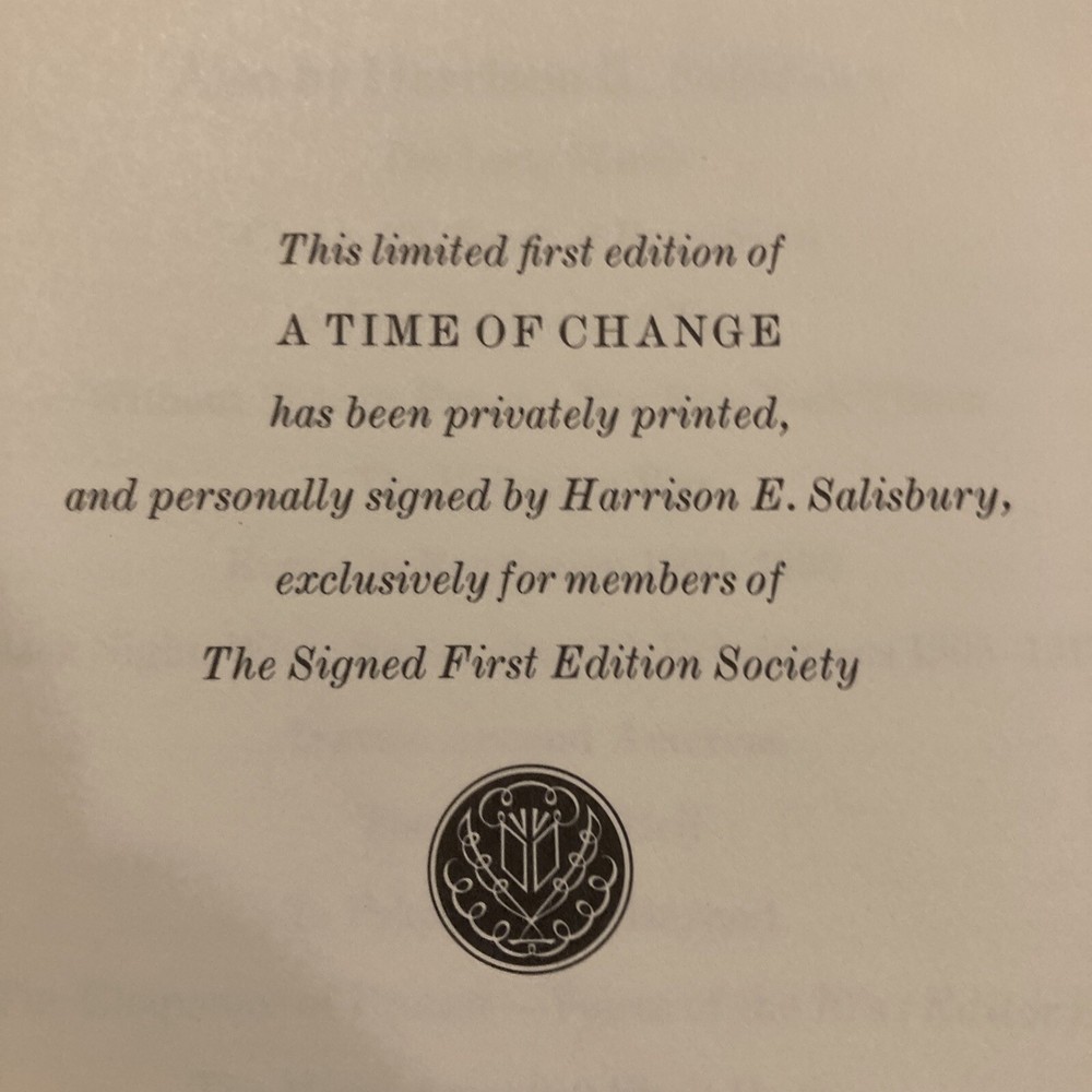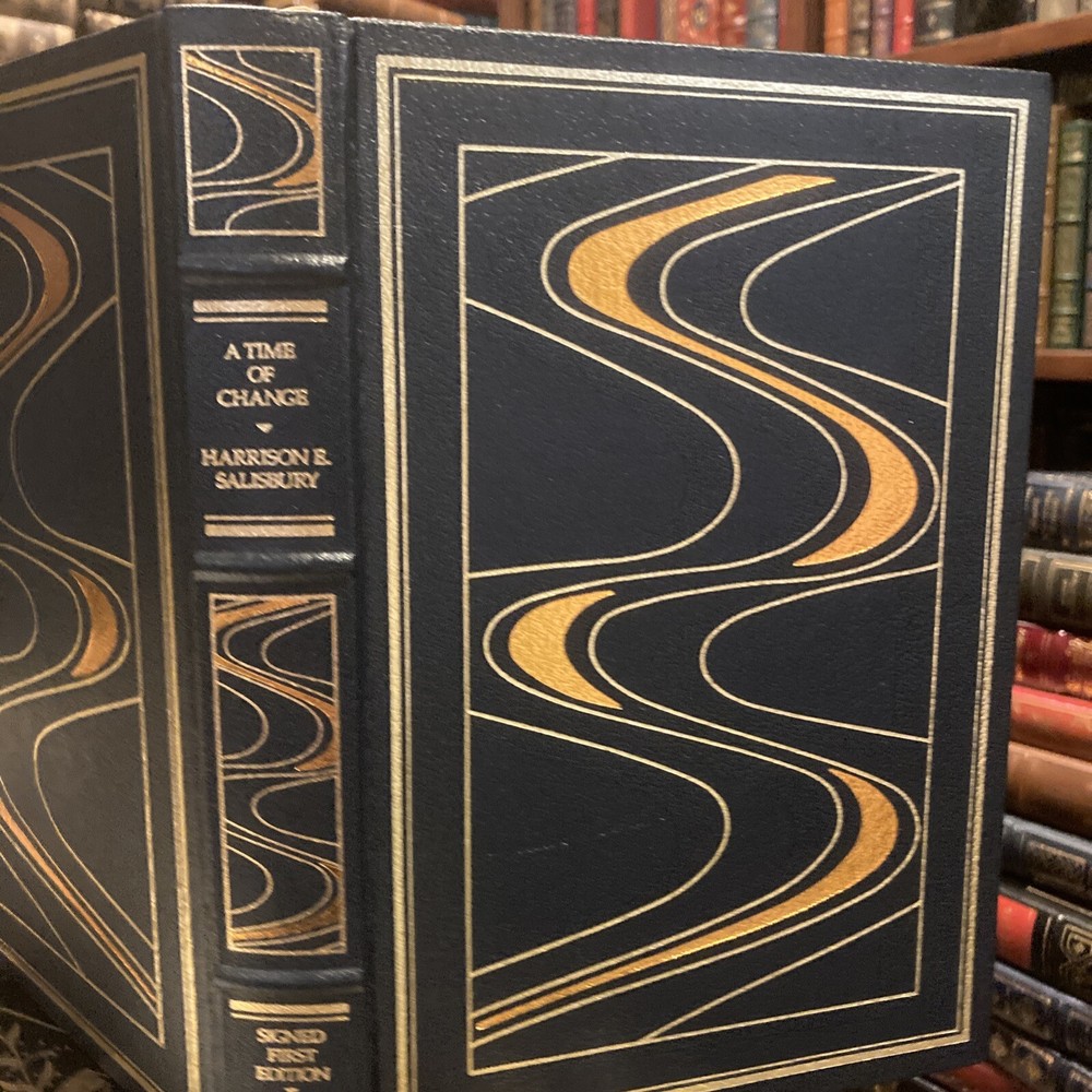 Franklin library leather edition of Harrison Salisbury's "A Time of Change," Frontispiece Portrait of Harrison Salisbury by Ronald De Felice, a First edition, PERSONALLY SIGNED by HARRISON SALISBURY, one of the SIGNED FIRST EDITION SOCIETY series, published in 1988. Bound in hunter green leather, the book has decorative paper end leaves, a satin book marker, acid-free paper, Symth-sewn binding, gold gilding on three edges---in near FINE condition---except for minor 'foxing' on gilt on fore edge. Harrison Evans Salisbury , who lived from 1908 – 1993, was an American journalist and the first regular New York Times correspondent in MOSCOW after World War II. He was born in Minneapolis, Minnesota, and graduated from University of Minnesota in 1930. He spent nearly 20 years with United Press (UP), much of it overseas, and was UP's foreign editor during the last two years of World War II. He joined the NEW YORK TIMES in 1949 and became their Moscow correspondent, traveling widely in Siberia, Central Asia and Outer Mongolia along China's borders. In a 'special message,' Salisbury wrote: "The world into which I was born was a Victorian world. In 1908 Queen Victoria had been dead for seven years but she still reigned in the gabled house kept by my father in Minneapolis. . ." "I have spent quote a lot of time on the fission lines of our day---wartime Europe, the Middle East, Russia, China, Southeast Asia, and the barricades of our own America in the 1960s. We have come to think of Russia as a country invented by Lenin and perfected by Stalin but Russia was Russia for hundreds of years before 1917. Russian imperialism was invented by the Czars, not the commissars. Stalin's ikons were Ivan the Dread, Peter the Great, and Nicholas I. Mao Zedong slept in the same Ming Palace as did his predecessors. Salisbury has traveled the globe, earning a reputation as a tough and knowledgeable journalist. He was awarded the PULITZER PRIZE for International Reporting in 1955 and was nominated for a second Pulitzer in 1967 for his hard-hitting reports from Hanoi during the VIETNAM WAR. Salisbury knew every president since DWIGHT EISENHOWER, and met with heads of state of CHINA and the SOVIET UNION. He and his wife trekked the Long March, retracing the 1934-35 Mao Zedong 'Long March,' a 6,000-mile journey. RONALD REAGAN was making his first trip to CHINA, and "I knew that many Chinese were excited about the President's visit." "Reagan left a strong impact on Xi'an, and as I later found, in Bejing as well." Later Salisbury wrote: "I was in Moscow after the Summit at Genea in 1985. One of Mr. Gorbachev's close aides invited me to his office. He was walking on air over the Gorbachev-Reagan meeting. . .I did not meet Reagan until 1985 when I was twice invited to the White House. In the last chapter, Salisbury describes spending Christmas 1985 in Florence, Italy, where the "streets were awash with people, young, old, rich, poor, gay, and serious . . .At the Uffizi, I stood "intoxicated, my eyes brimming with joy, my mind in turmoil . . ." Folks, Salisbury knew many of the "shakers and movers" of the 20th century. 354 pages, including an Index. I offer Combined shipping.