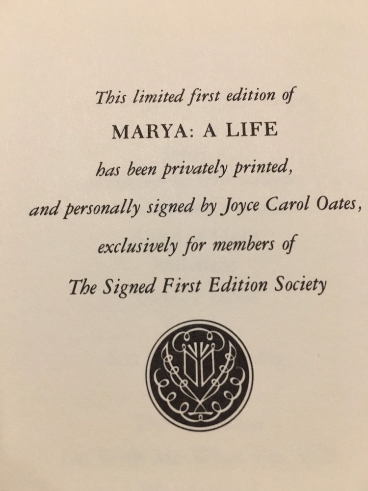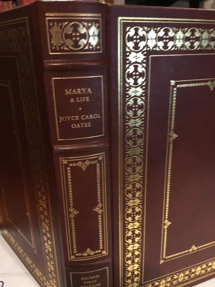 Franklin Library leather edition of Joyce Carol Oates's "Marya: A Life," one of the SIGNED FIRST EDITION series PERSONALLY SIGNED by JOYCE CAROL OATES, published in 1986. Bound in a brown leather, the book has decorative paper end leaves, satin book marker, acid-free paper, Symth-sewn binding, hubbed spine, gold gilding on three edges--in near FINE condition. Joyce Carol Oates, who was born in 1938, is an American writer who has published over 40 novels, as well as a number of plays and novellas. She has won many awards for her writing, including the NATIONAL BOOK AWARD, two O. HENRY Awards, and the NATIONAL HUMANITIES MEDAL. Oates has taught at Princeton University s ince 1978 and is currently the Roger S. Berlind Professor Emerita in Creative Writing. "Marya: A Life" is an autobiographical novel which is set in Syracuse, New York, where Oates went to college. In a "Special Message to Subscribers," Oates wrote: "Many of Marya's thought and impressions parallel my own at her approximate age but the circumstances that provoke them have been altered, as have most of the characters. Of all my novels, Marya is the only one I could not approach head-on. I had to write it in self-contained sections, each dealing with a specific phase of Marya's life, and after finishing each of these sections I was determined not to write another---the tension was too great." I offer Combined shipping.