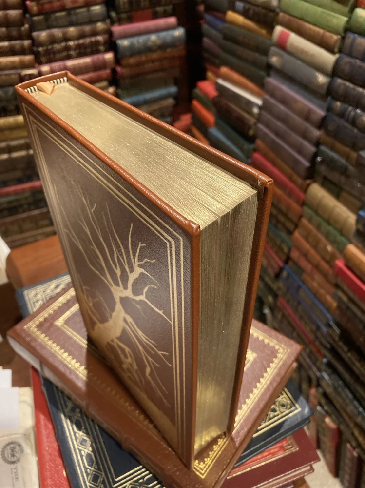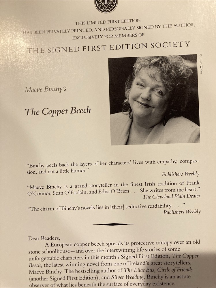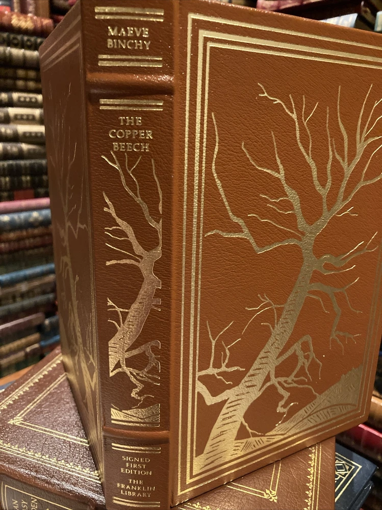 Franklin Library leather edition Maeve Binchy's "The Copper Beech," one of the SIGNED FIRST EDITION series, PERSONALLY SIGNED by Maeve Binchy, Frontispiece by M. John English, published in 1992. Bound in copper gold leather, the book has marbled paper end leaves, acid-free paper, Symth-sewn binding, a satin bookmarker, hubbed spine, gold gilding on three edges--- in FINE condition. COLLECTOR'S NOTES is included. Maeve Binchy Snell, who lived from 1939---2012, was an Irish novelist, playwright, short story writer, columnist, and speaker best known for her sympathetic and often humorous portrayal of small-town life in Ireland. She is an astute observer of what lies beneath the surface of everyday existence. A European copper beech spreads its protective canopy over an old schoolhouse as the unmarried schoolteacher, MADDY ROSS, harbors a deep love for Father Barry Brian---though neither admits to any feeling. Life also deals a difficult hand for poor MAURA O'SULLIVAN; still fate remains on the side of this resolved and courageous woman and her special child. Fatherless EDDIE BARTON, a social outcast, also has a difficult life. Like Maddy Ross, Shancarrig's young new physician, DR. JIMS, seems destined for a life alone---until he gets some useful advice from his dying mentor. Binchy brings to her literary canvas a cast of characters whose small-town life mirror accomplishments and defeats that share a universal resonance. 345 pages. I offer combined shipping.