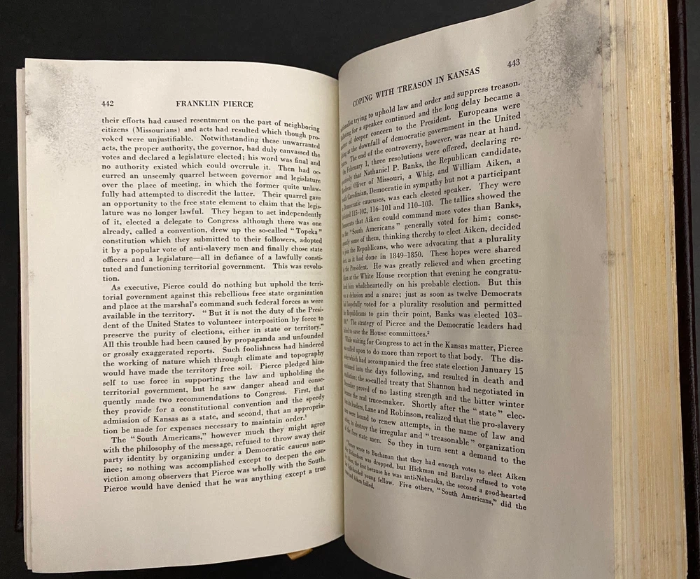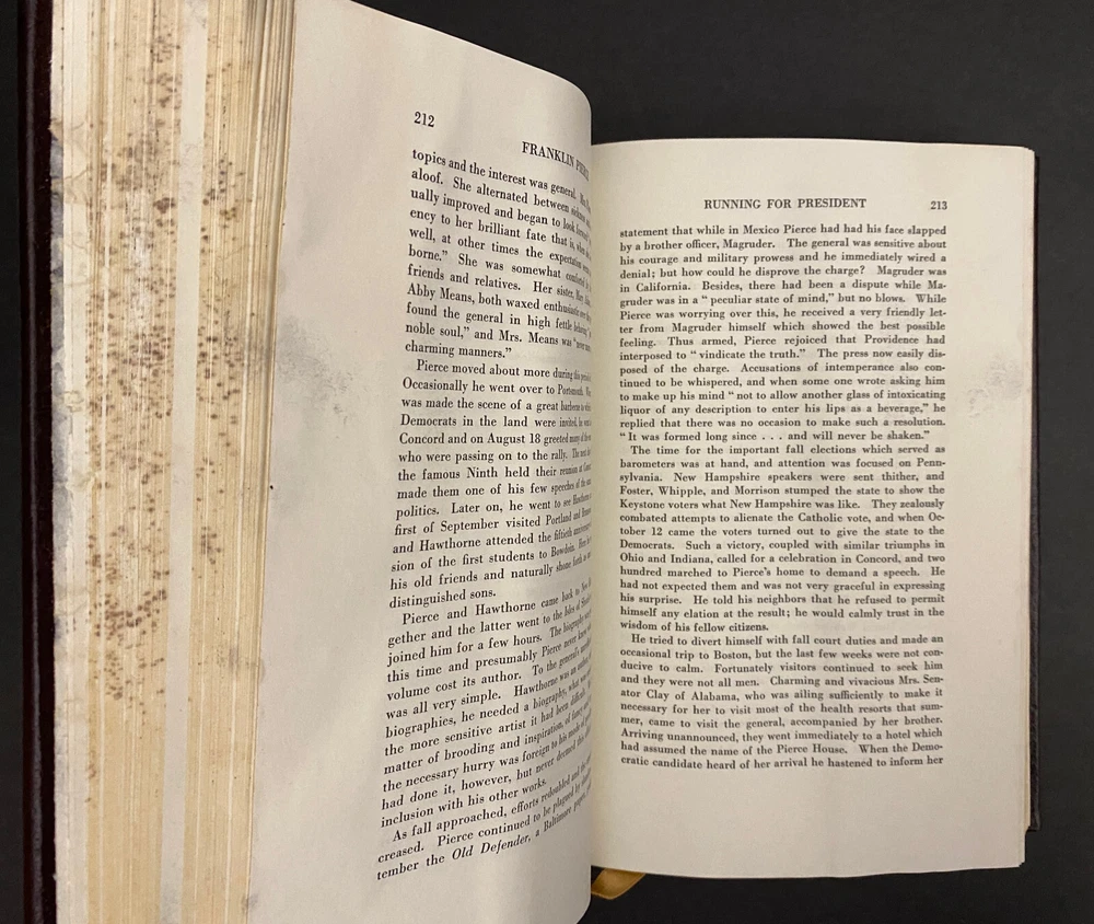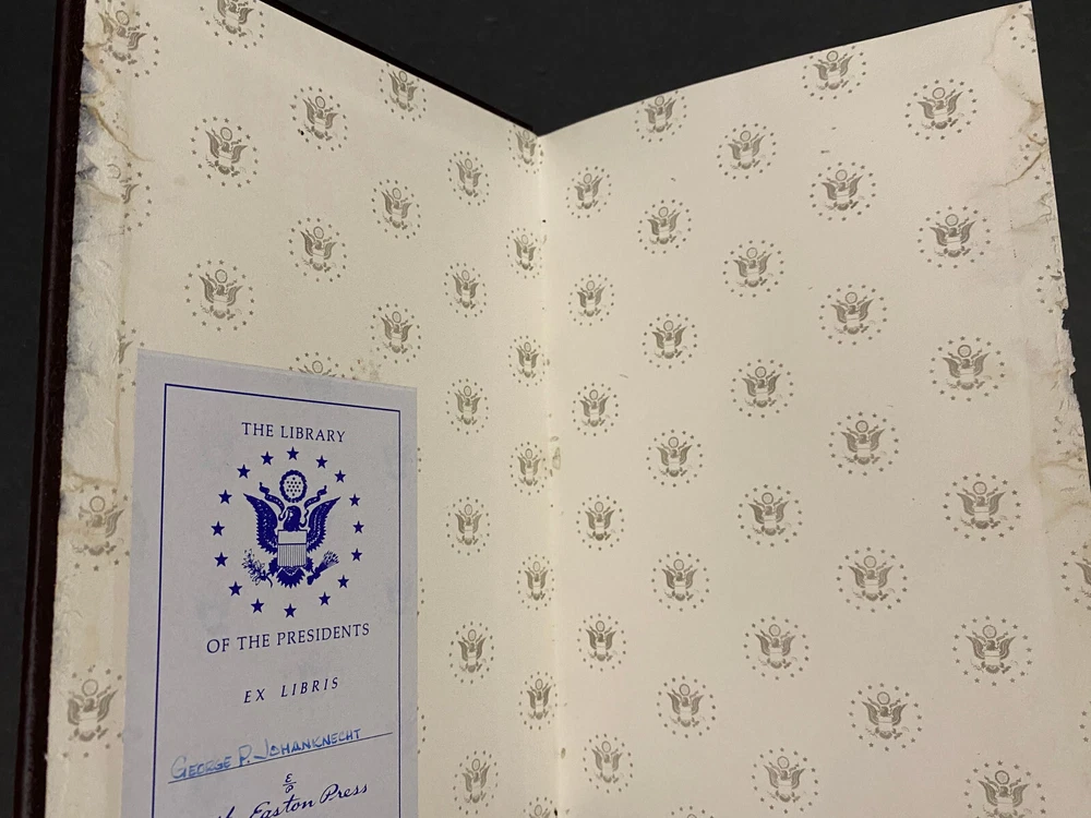 Franklin Pierce : Young Hickory of the Granite Hills by Roy Franklin Nichols, 1988 Easton Press, Water Damaged This is part of The Library of The Presidents Collection. The water damage is on the front edges of the pages of the book. The water damage is throughout the book. The book is warped. The gilding on the front edge is uneven. There is a small scuff mark on the front leather. The binding is tight. Previous owner's bookplate is attached to the front end paper. Included is the Collector's Notes. All items are from a smoke free environment. Your order will ship by the next business day after receiving payment. We will be happy to combine shipping. Please contact us with any questions. Thank you!