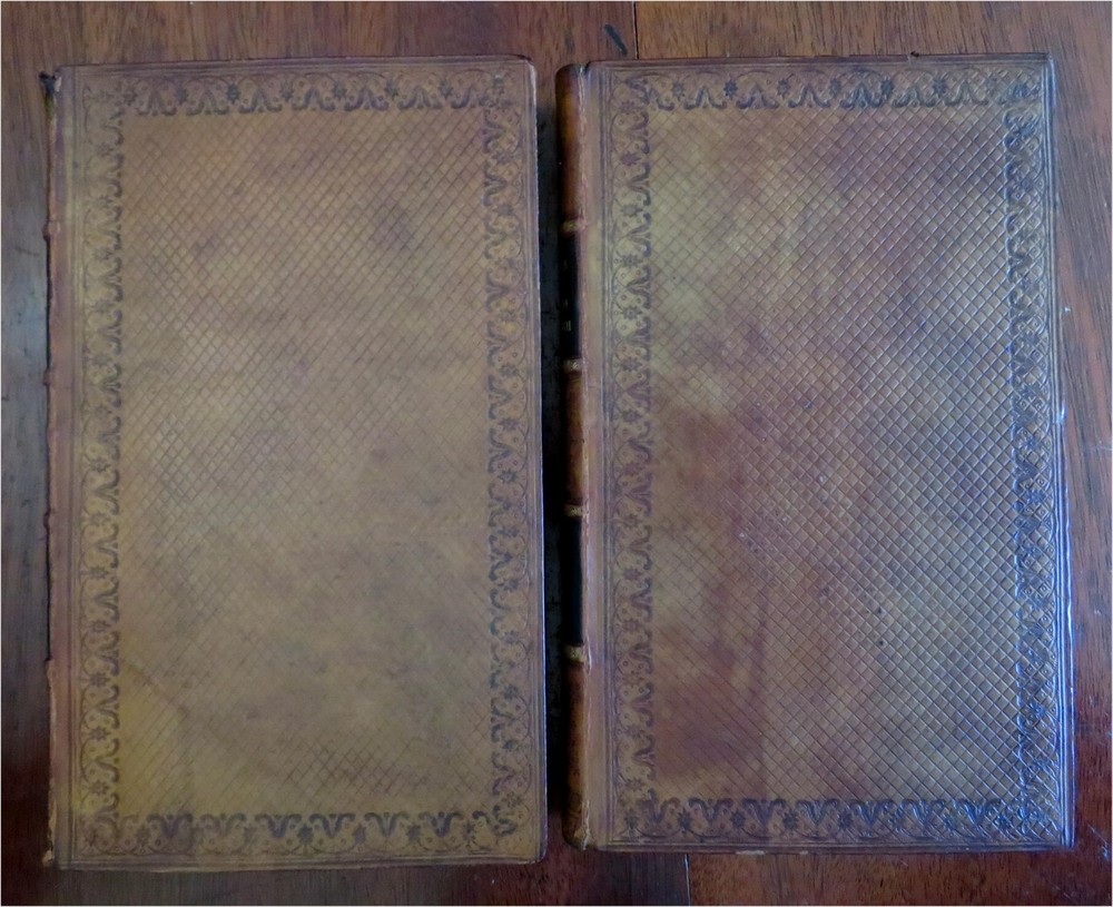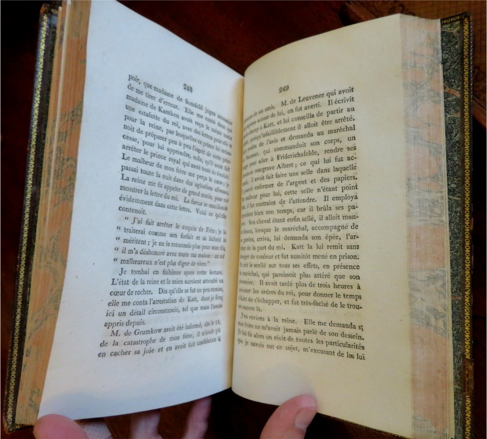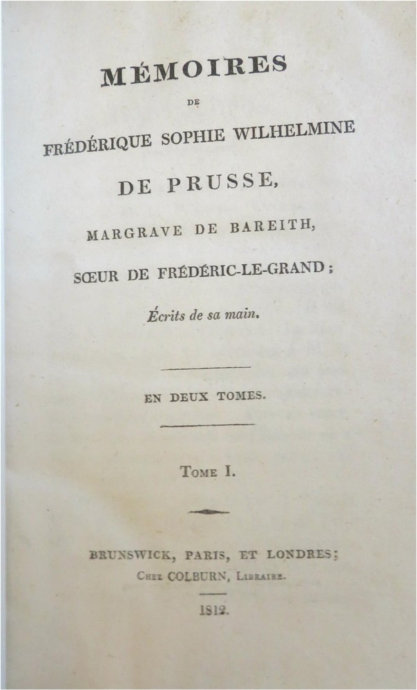 Frederica Sophie Wilhelmina Princess of Orange Memoirs 1812 leather 2 vol. set Frederica Sophie Wilhelmina Princess of Orange Memoirs 1812 leather 2 vol. set (Old Books, 19th Century Books, Leather Books, Prussia, Frederica Sophie Wilhelmina, Memoirs). Memoires de Frederique Sophie Wilhelmine de Prusse, Margrave de Bareith, Soeur de Frederic Le Grand. Published 1812, Brunswick, Paris, & London by Colburn. 2 volumes. 405, 352 pages. Text in French. Attractive antiquarian 1/2 diced leather bindings, raised bands, gilt title lettering on contrasting black leather labels, embossed cover decorations, marbled edges and end papers. Set is physically old and shows some signs of handling and time. Bindings gently age worn but still appealing, leather and joints slightly rubbed but still supple, small split at head of spine to first vol., set remains overall very attractive as an object. Nice old engraved armorial book plates to paste downs. Text block paper is gently age toned as typical, internally set remains mostly clean, tight and sound. A set which has been taken care of but may/ does not look like new. Still attractive on the shelf. Set displays a pleasing and unique age patina and is in rather nice antiquarian condition, any age flaws seem easy to overlook or forgive. Please review photos for more detailed attempt to present this nice set as it survives. We often over-describe any flaws that many sellers would not even bother to mention since most people would overlook them as minor and unworthy of comment. Many people tell us the books they receive from us are nicer in person than they appears on the screen. We want you to be clear about what you are buying, so we take numerous photos and try to describe it openly and honestly. Books Measure c. 8 3/4" H x 5 1/4" W. [B7087].