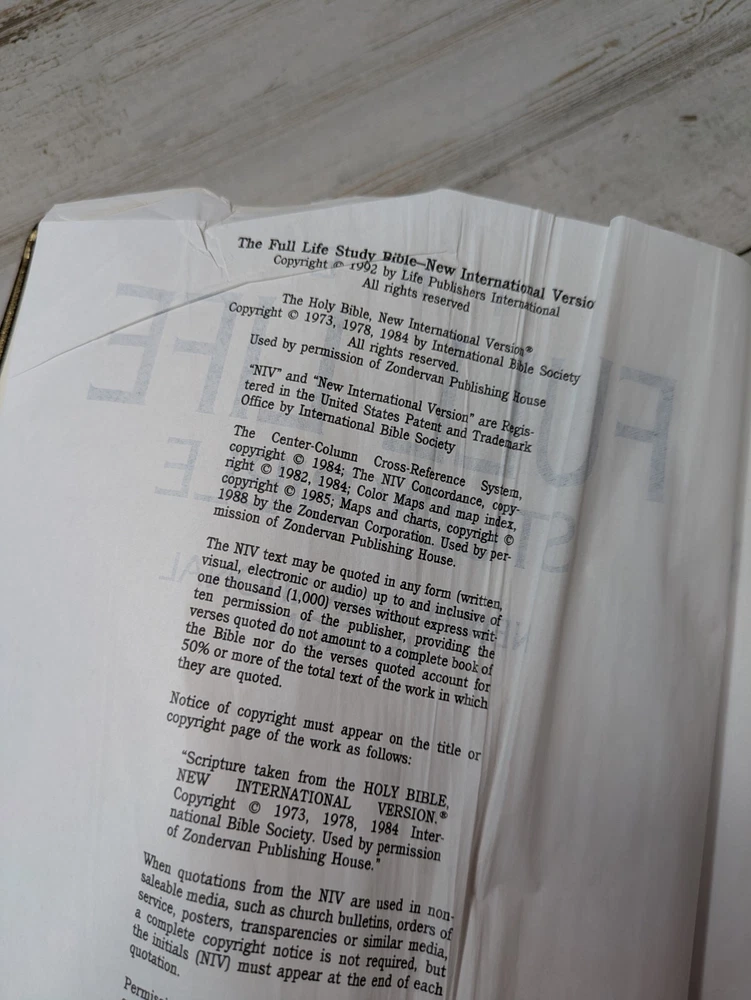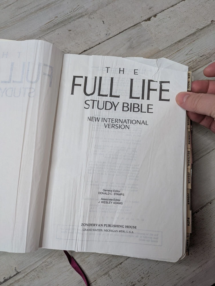 Full Life Study Bible NIV Zondervan Pentecostal Charismatic Reference 1992 Rare. Editor Donald Stamps. Some page creases at the front. One page has been repaired. This bible has dedication writing in the front. There is occasional highlighting and note taking. The front cover has a name on the bottom right. The cover is genuine leather.