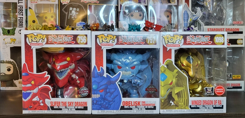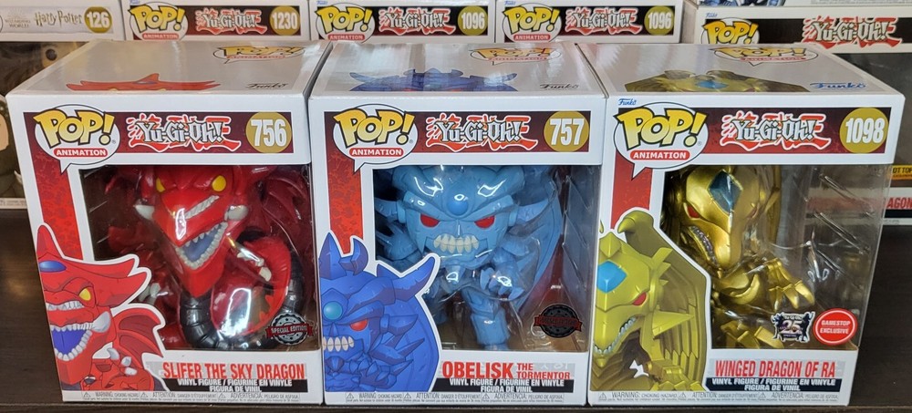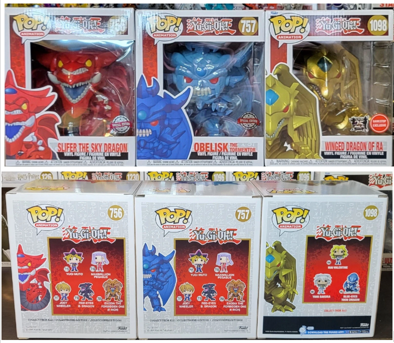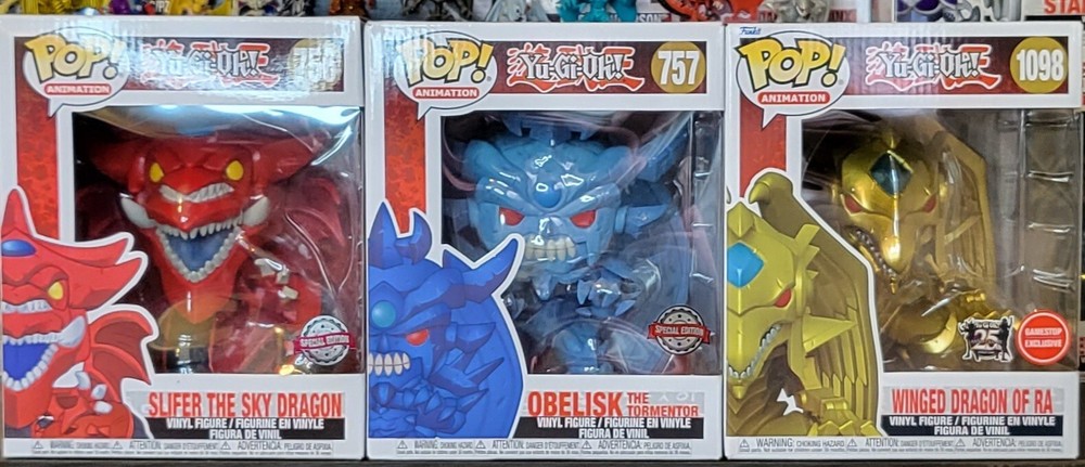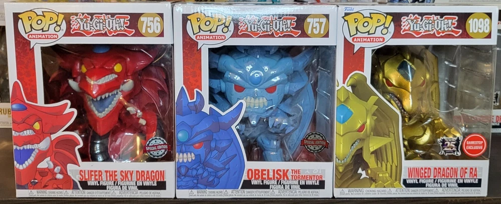 Thank you for taking your valuable time to read my description. You will receive the exact genuine and authentic Funko Pop! that you see in the photos for this listing. You are purchasing all 3 Funko Pops! which include: 1. Slifer The Sky Dragon Special Edition #756. 2. Obelisk The Tormentor Special Edition #757. 3. Winged Dragon of Ra Metallic GameStop Exclusive #1098. Please refer to the photos for the condition of the Funko Pop! If you require additional photos, please send me a message and I will provide you with the photos you need. Quality Shipping with maximum protection and it is free! Your order is very important to me, I package each order as if I were going to receive it myself and I know exactly how it feels to receive a damaged item (it is very disappointing). Your Funko Pop! will be handled with extreme care and delicacy. I make it a priority to provide you with the absolute best protection for your purchase. Your Funko Pop! will be inserted into a hard plastic case, wrapped in bubble wrap, placed in a new sturdy cardboard box fit to match the size of the Funko Pop! and sealed shut to ensure a safe delivery to your home. Same day Handling! Your order will ship the same business day that you place the order for orders placed before 5:00 PM (Eastern Standard Time) Mon-Fri. Your order will be shipped USPS 1st Class and tracking information is provided with your purchase. If you have any questions, send me a message and I will respond promptly. I appreciate your time, Thank you.