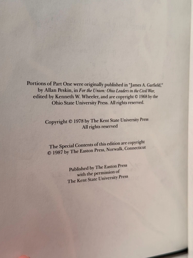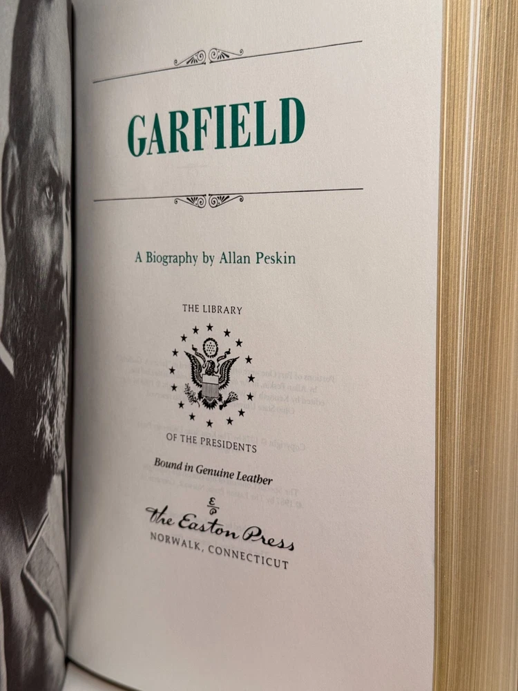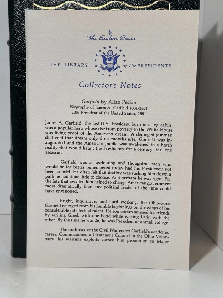 You are bidding on a very fine copy of a 1st Edition, 1st Printing of the Easton Press' THE LIBRARY OF THE PRESIDENTS series edition of Allan Peskin's GARFIELD - A BIOGRAPHY This is a one-volume edition about the life and work of the 20th President of the United States, James A. Garfield. Bound in beautiful genuine moroccan cowhide leather, the book features raised bars on the spine, gold tooling on the cover and spine, End-pages decorated with the seals of the U.S. Presidents, satin silk sewn-in bookmark, 22k gold dust on page ends on all 3 sides. Printed on archival quality acid-neutral paper, that will last for generations without diminishing in quality or looks. LIMITED, COLLECTOR'S EDITION FROM THE SERIES OF THE LIBRARY OF THE PRESIDENTS. Free Shipping in all of Continental United States. All other buyers, please check with me for shipping rates before bidding. ***NOTE: If you are dissatisfied with your purchase for any reason, please contact me first directly, and I will do all in my power to make sure you are satisfied with your purchase. *** See my other listings. I have a large collection of rare and collectible books, most leatherbound, others of first edition, first printing, even unpublished manuscripts. I will combine them during shipping so you can receive them together. Just message me your intent to buy more than one book, and I will hold them to be shipped together. Abell Happy Buying!