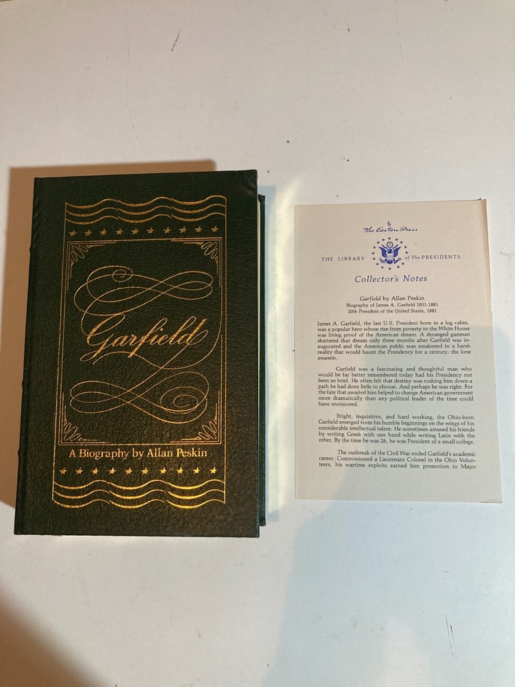 This Easton Press leatherbound Garfield biography is a stunning collector's piece! The genuine leather cover looks luxurious, with only a minor corner bump, and the gilt-edged pages gleam beautifully. Inside, it’s practically pristine—no marks or wear, just crisp, clean pages like it's barely been read. The included collector's notes and unused bookplate add extra charm. Perfect for history buffs or book lovers who appreciate classic high-quality editions. Photos confirm its gorgeous condition—definitely a treasure for any shelf!