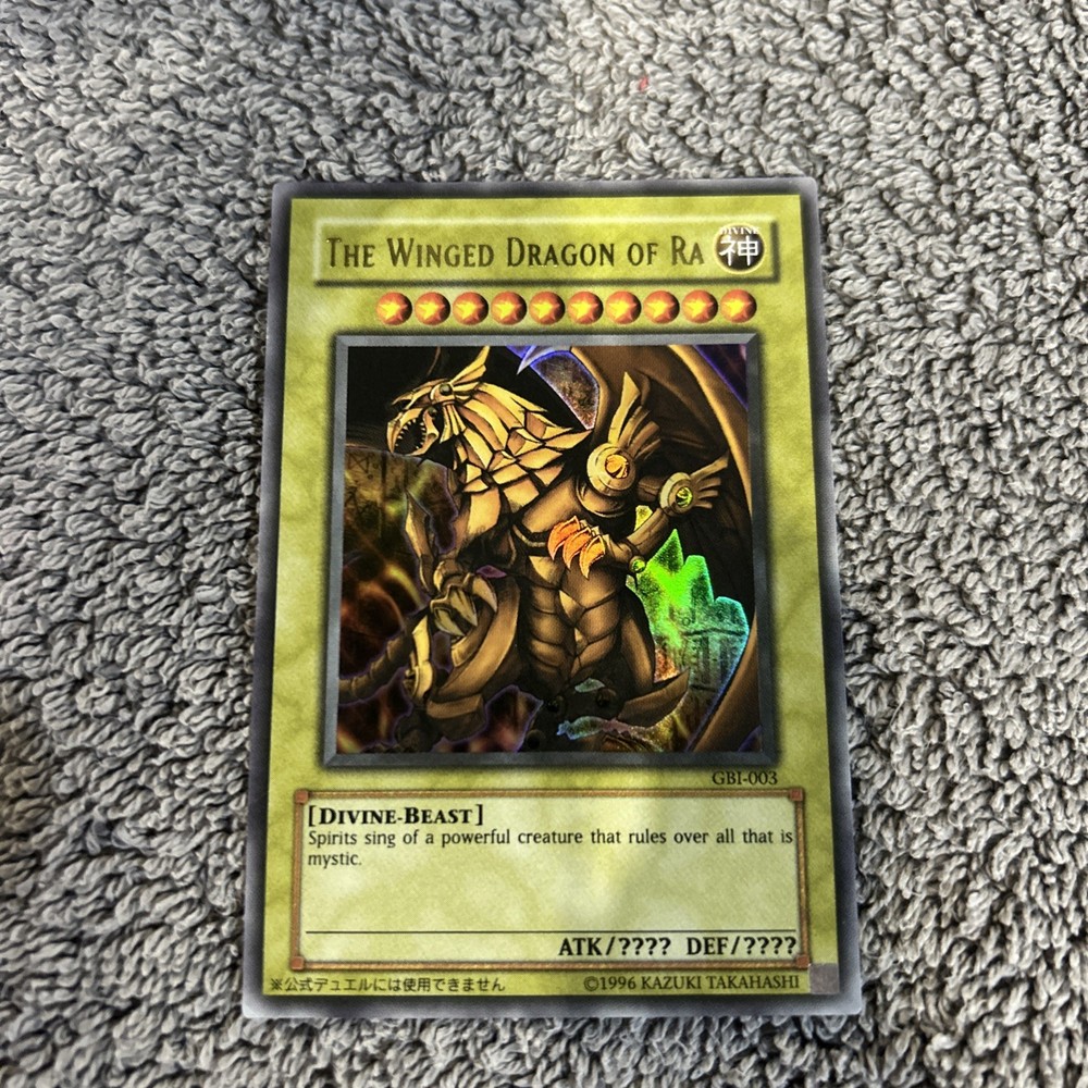 The GBI-003 The Winged Dragon Of Ra Ultra Rare Promo NM Yu-Gi-Oh! card is a sought-after collectable card from the Yu-Gi-Oh! TCG. Manufactured by Konami, this English language card features the iconic Winged Dragon of Ra design on sturdy card stock with a foil finish. This Japanese-sized card is in near mint condition or better, making it a valuable addition to any collection of collectable card games. The ultra rarity and unique design of this card make it a must-have for serious collectors and players alike.