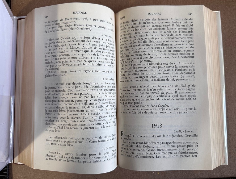 TITLE: Journal: 1889-1939 (Bibliothèque de la Pléiade) AUTHOR: Gide, André AUTHOR 2 (if applicable): n/a AUTHOR 3 (if applicable): n/a ILLUSTRATOR (if applicable): n/a PUBLISHER: Éditions Gallimard, Date: 1951 ISBN: N/A (pre-ISBN publication) FORMAT: Leatherbound, 1508 pages EDITION: Unstated Edition PRINTING [if applicable]: Unstated Printing BOOK CONDITION: Very Good JACKET CONDITION: Very Good DIMENSIONS (if available): 7.00 x 4.25 x 2.50 in. approx. KEYWORDS: Bibliothèque de la Pléiade, NRF, André Gide, Journal, 1889-1939, Éditions Gallimard, Classiques DESCRIPTION: Pléiade edition of the journal of André Gide, dating from 1889 to 1939. A second volume later appeared. All text in French with a brief introduction and an index to topics. Leatherbound edition with archival quality fine paper, in full dustjacket, and yellow ribbon bookmark. Pléïade editions are the definitive French-language editions of French and international literary texts, for americans the nearest equivalent would be the Library of America editions of classic works (similar paper and quality, although the LoA titles are clothbound rather than leatherbound). CONDITION: Slimline leatherbound omnibus edition. Wear to corners and the head and tail of the spine. Paper jacket over red-brown leather covers. Paper jacket shows some wear and chipping at the extremities, particularly at the head of the spine, it is now protected in a mylar brodart cover. Front hinge has split and been repaired with binding tape, otherwise, contents very good overall. Contents appear age-toned but unmarked save for earlier price marking on the IFEP. FROM THE BOOKSELLER: Thank you for visiting the Dactyl Books eBay Store! We are a virtual second-hand and antiquarian reseller of books specialising in History, Science, Literature, and Mystery & Detective Fiction, but we have a little bit of everything in our stocks! We are listing new items all the time, but if you are looking for a specific title or edition, don't hesitate to send it on to us and we will be glad to check and give you an opinion on how best to find your desired title. NOTES ON EDITIONS: We use a number of resources to attempt to determine the edition of the book that we are listing. My most frequently referenced resource is Zempel and Verkler's "First Editions: A Guide to Identification," although we also use other internet sources and make comparisons with listings we find on various internet sites. We strive to be extremely careful and diligent in describing our listings, but if you receive a book and don't feel that it's quite what you ordered, please contact us through the "Contact Seller" link to see what we can do for you. To avoid the chances of this happening, if you have a question about a book or other item, or would like to see additional photos, please use the "Contact Seller" link in the item description and let us know what you need. We will do our best to answer your questions *before* any sale. TERMS & ABBREVIATIONS IN OUR LISTINGS: For your convenience, here is a list of terms and abbreviations that we commonly use in listings: IBC: Inside Back Cover IBEP: Inside Back End Paper IFC: Inside Front Cover IFEP: Inside Front End Paper Text-Block: The body of the book contained between the covers. Thanks for your interest in Dactyl Books!