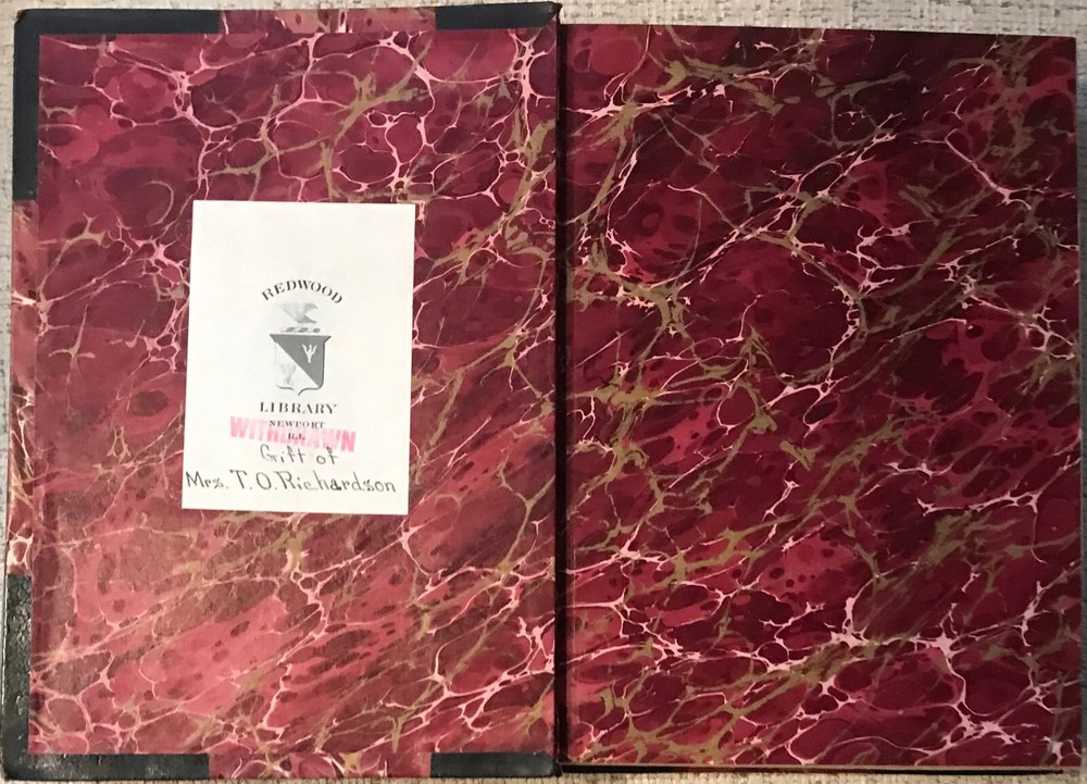 This is "A Biography of William Cullen Bryant" by Parke Godwin, in a first edition published by D. Appleton in 1883 (same date on the title page and the publisher's page). This edition features a two-volume set, bound in black leather over red marbled paper-covered boards, with raised spine bands, gilt spine decoration and lettering and gilt top edges. There is a frontispiece engraving in each volume. Condition of this set is Very Good Minus; it is an ex-library volume discarded by the Redwood Library in Newport, RI (the oldest continuously operating library in the U.S.). There is some wear to the corners and along the spine, and it bears a historic library bookplate on the LFEP and a list of library regulations (one cent fine per day for overdue books!) on the LREP. Other library marks are present, but none on the exterior, so this set has a lovely shelf presence. Please see my other 19th-century literature listings.