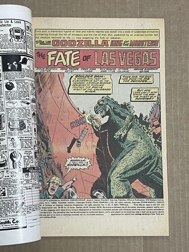 THIS IS A VERY FINE ,FIRST PRINT ISSUE OF GODZILLA #9 FROM MARVEL COMICS (1978). WRITTEN BY DOUG MOENCH. ILLUSTRATED BY HERB TRIMPE. COMIC SHIPS WITH BAG AND BOARD IN A SECURE PACKAGE. COMBINED SHIPPING AVAILABLE. FEEL FREE TO ASK ANY QUESTIONS AND CHECK OUT MY STORE FOR OTHER GREAT COMICS, COLLECTIBLES AND COSTUMES. THANKS FOR LOOKING.