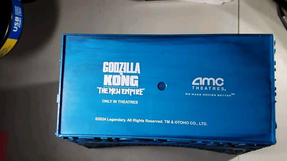 This popcorn bucket has never been used. It comes with the plastic cover which was never sealed. This is the blue bucket. I have a different one in another auction on Ebay. ( See pics for condition ) Any questions please email me ( LS ) I do combine shipping