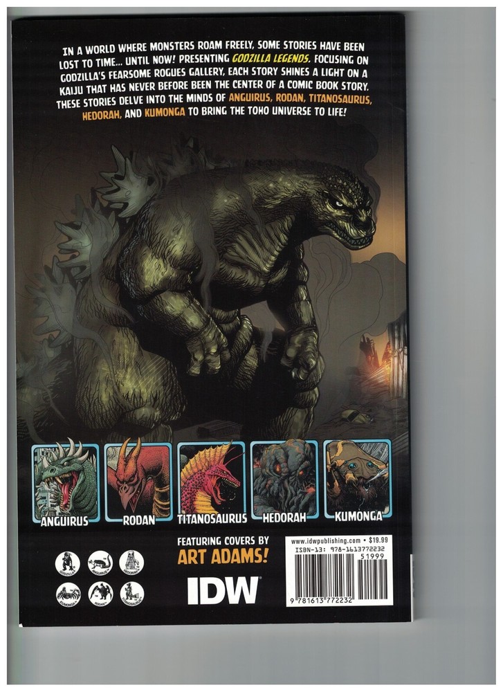 This item is brand new, undamaged and never read. Near Mint. Comes from warehouse stock that has been stored for over a decade. Collects Godzilla Legends (2011 IDW) #1-5. Written by Matt Frank, Jeff Prezenkowski, John Vankin, Mike Raicht, Chris Mowry, and Bobby Curnow. Art by Matt Frank, Simon Gane, Tony Parker, EJ Su, and Dean Haspiel. Cover by Art Adams. Focusing on Godzilla's fearsome rogues gallery, each story shines a light on a kaiju that has never before been the center of a comic book story. These stories delve into the minds of Anguirus, Rodan, Titanosaurus, Hedorah, and Kumonga to bring the TOHO universe to life! Softcover, 128 pages, full color. Cover price $19.99 Buy more and save $$$! - add other items to your cart and then “buy it now” to qualify for combined shipping and possible discounts. Shipping methods – all items packed in a box or cardboard mailer to make sure they get to you in the condition you ordered. Check out the feedback. I’m a collector and fan and not a faceless corporation that doesn’t care about the condition of your items. Returns – I will take back any item sold, but per ebay policy, I will decline returns or exchanges on items that have had factory shrinkwrap removed (if applicable). Inspect before opening! Foreign Customers – I use Ebay’s International Shipping Program. Ebay collects foreign shipping fees and taxes from your payment. I cannot adjust these fees as I never see these funds. Add items to your cart before check out to save shipping fees. Best Offers – Our offerings don't utilize this feature, and we don't accept "best offers". After you factor in labor, rent, free shipping, and fees, there is a narrow overall profit margin. We prefer to slowly lower prices if an item doesn't sell over time. If there are problems with your order, please give me the opportunity to make it right before starting a return or leaving feedback. Other questions? Please ask! Powered by SixBit's eCommerce Solution